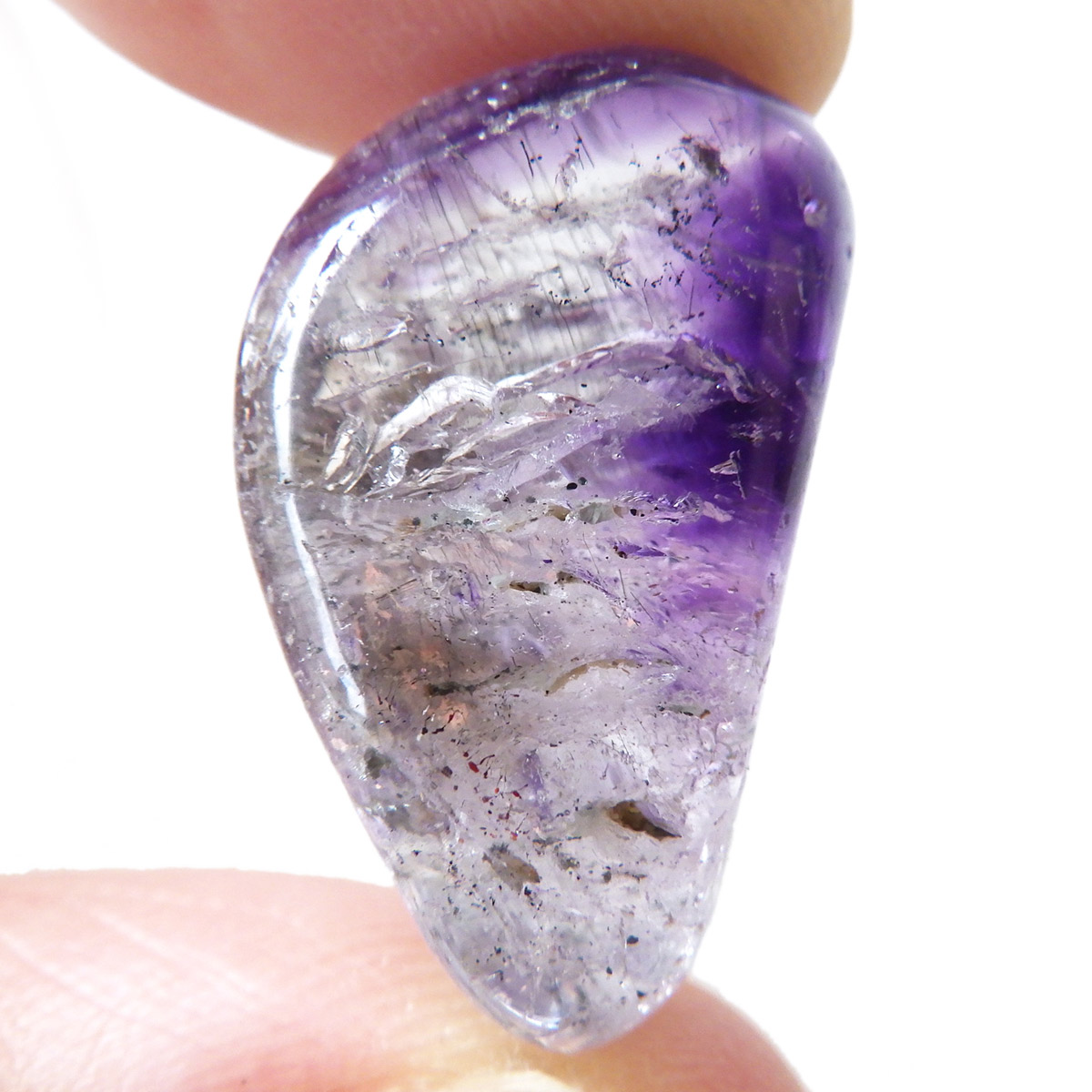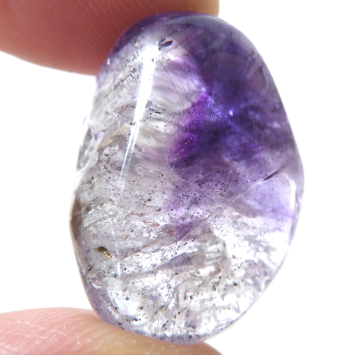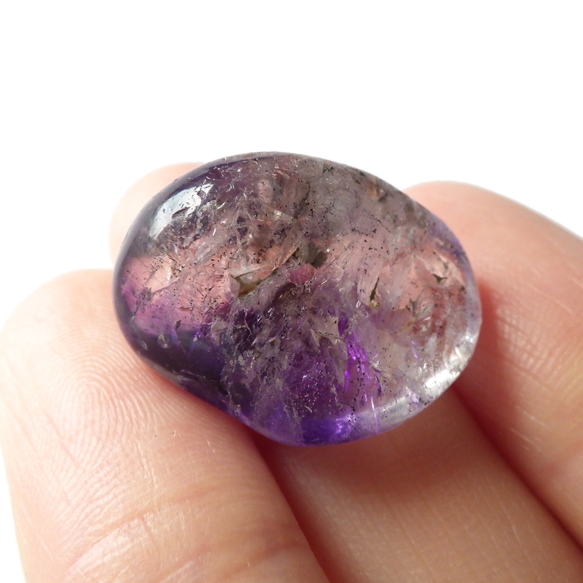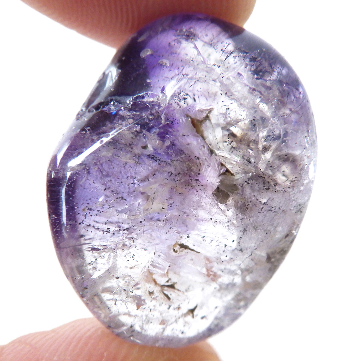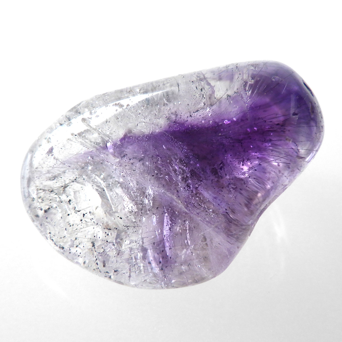 ナミビアのブランドバーグに産するアメジスト、通称ブランドバーグアメジスト、タンブルです。 透明なクォーツ内に煙のようにふわっと漂った美しいクリアなパープルのアメジストと黒いスモーキークォーツが見られます。透明度が高く、内包物がよく見えます。光によって輝く姿がこの産地特有のものでとてもきれいで癒されます。