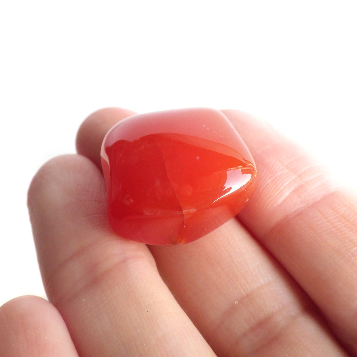 * カーネリアン 和名:紅玉髄 * カルセドニーの中で赤みが強く、オレンジ色のものをカーネリアンと呼びます。古代より護符として歴史に刻まれてきた石ですが、現在は達成したい目標やチャレンジする気持ちを高めてくれると言われ、いざという場面で力を発揮してくれると言われています。例えば、新しいビジネスに挑戦したり、転職を考えている人を後押ししてくれると言われ、試験などのお守りとして用いられ、希望を達成する石として重宝されています。