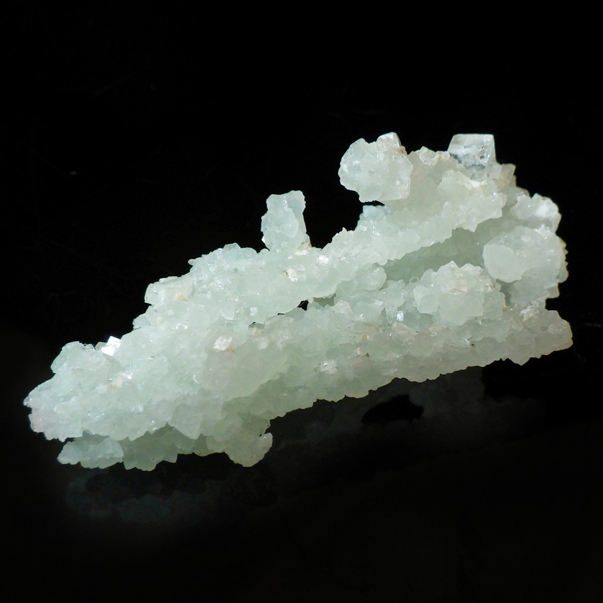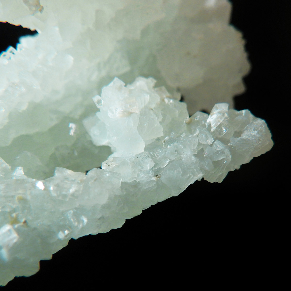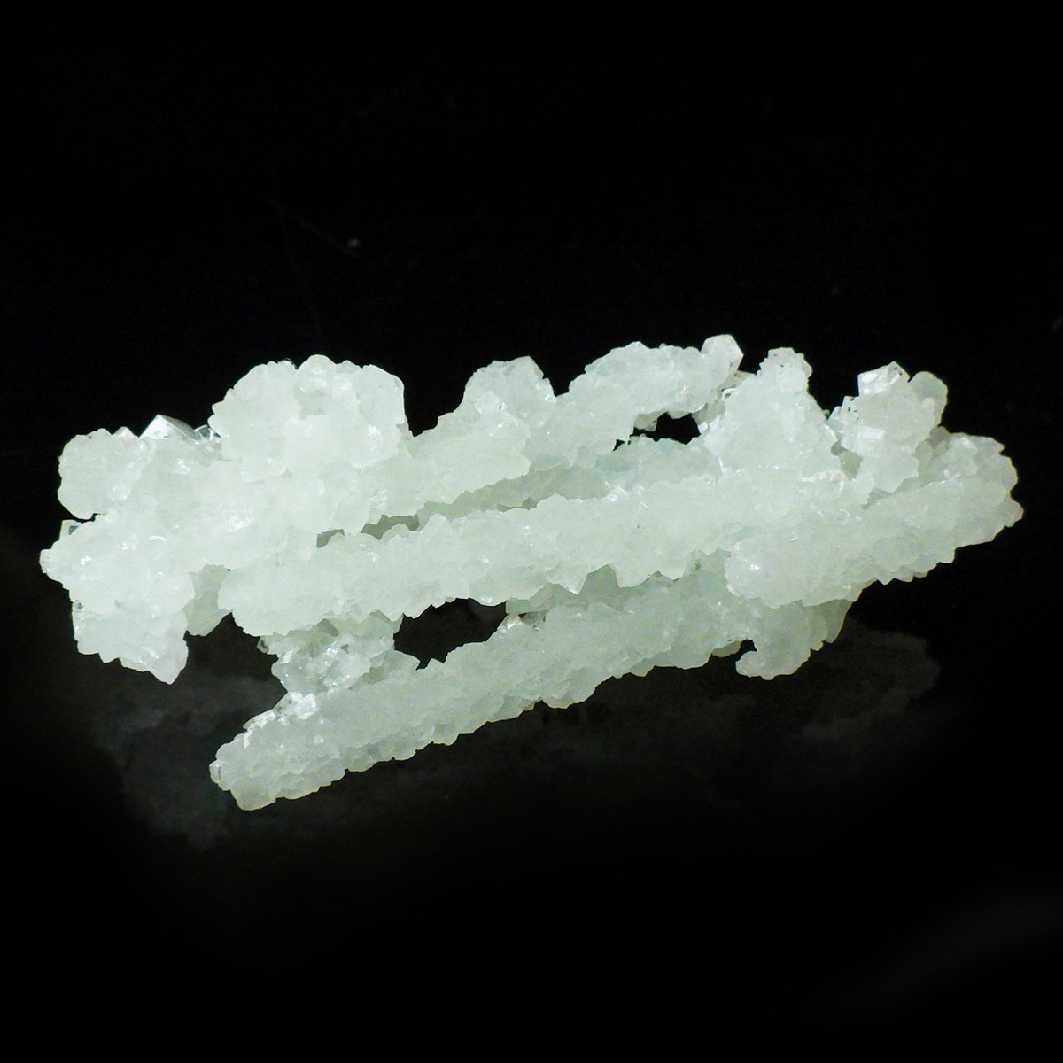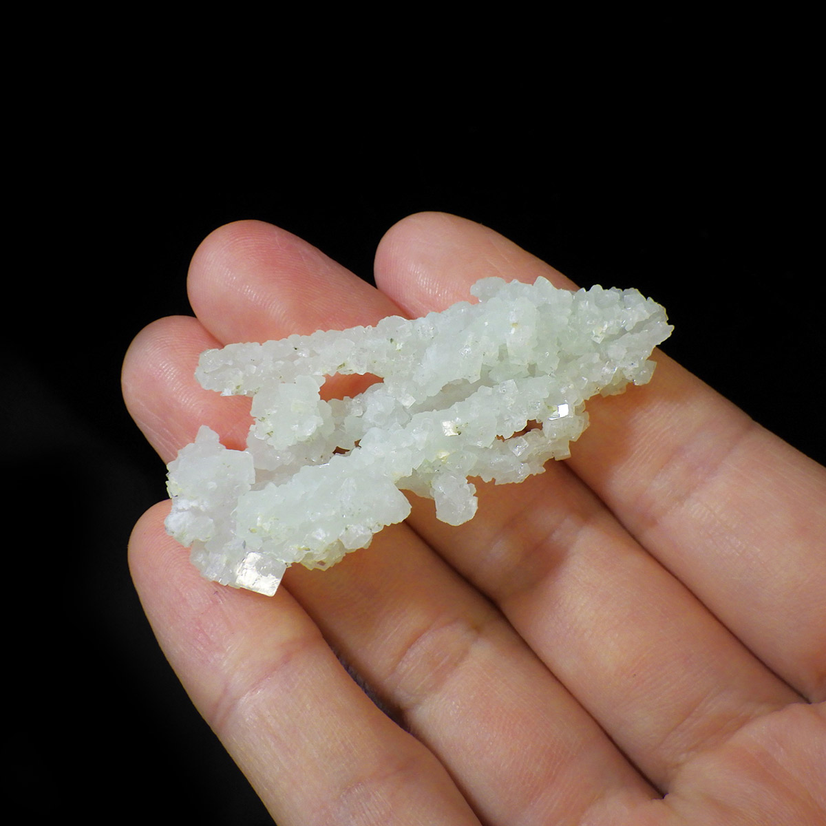 インド産のプレナイト、原石です。プレナイトは、淡い青緑から黄色にかけての色合いの石。1788年に南アフリカで初めてこの石を発見したフォン・プレーン大佐にちなんで名付けられました。葡萄石という和名は、産出時に見た目が葡萄のようであったことから名づけられました。多くのプレナイトは葡萄のような丸っこいフォルムをしていますが、稀にこちらの原石の様に柱状の集合体で産出されます。表面は粗粒の結晶が無数に集合した珍しい状態の原石です。