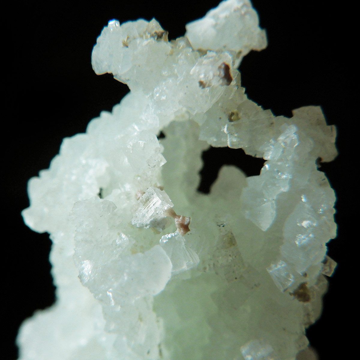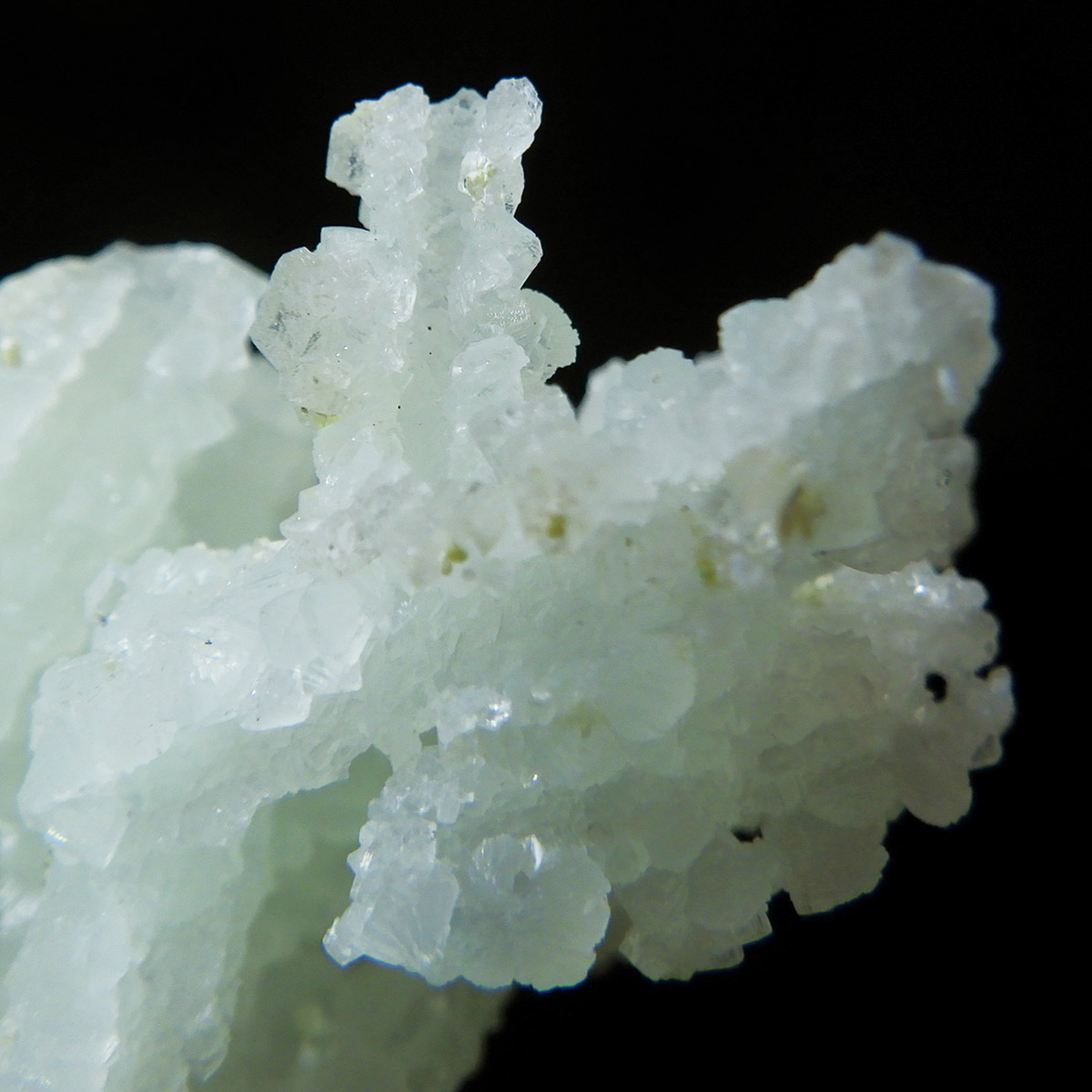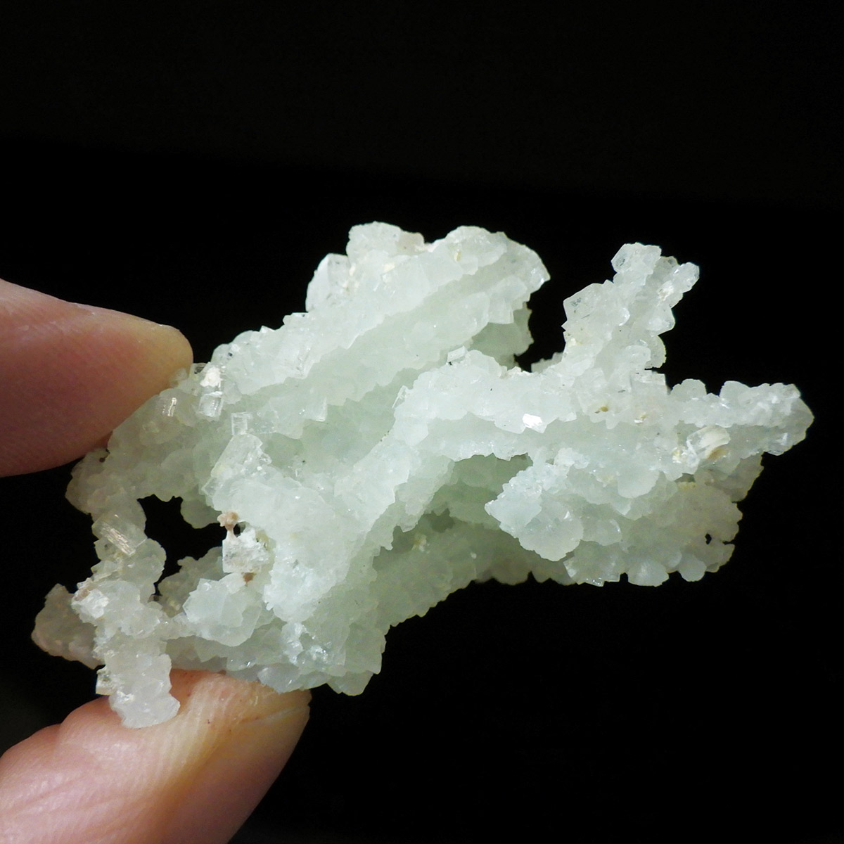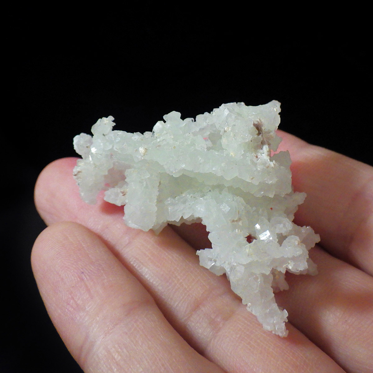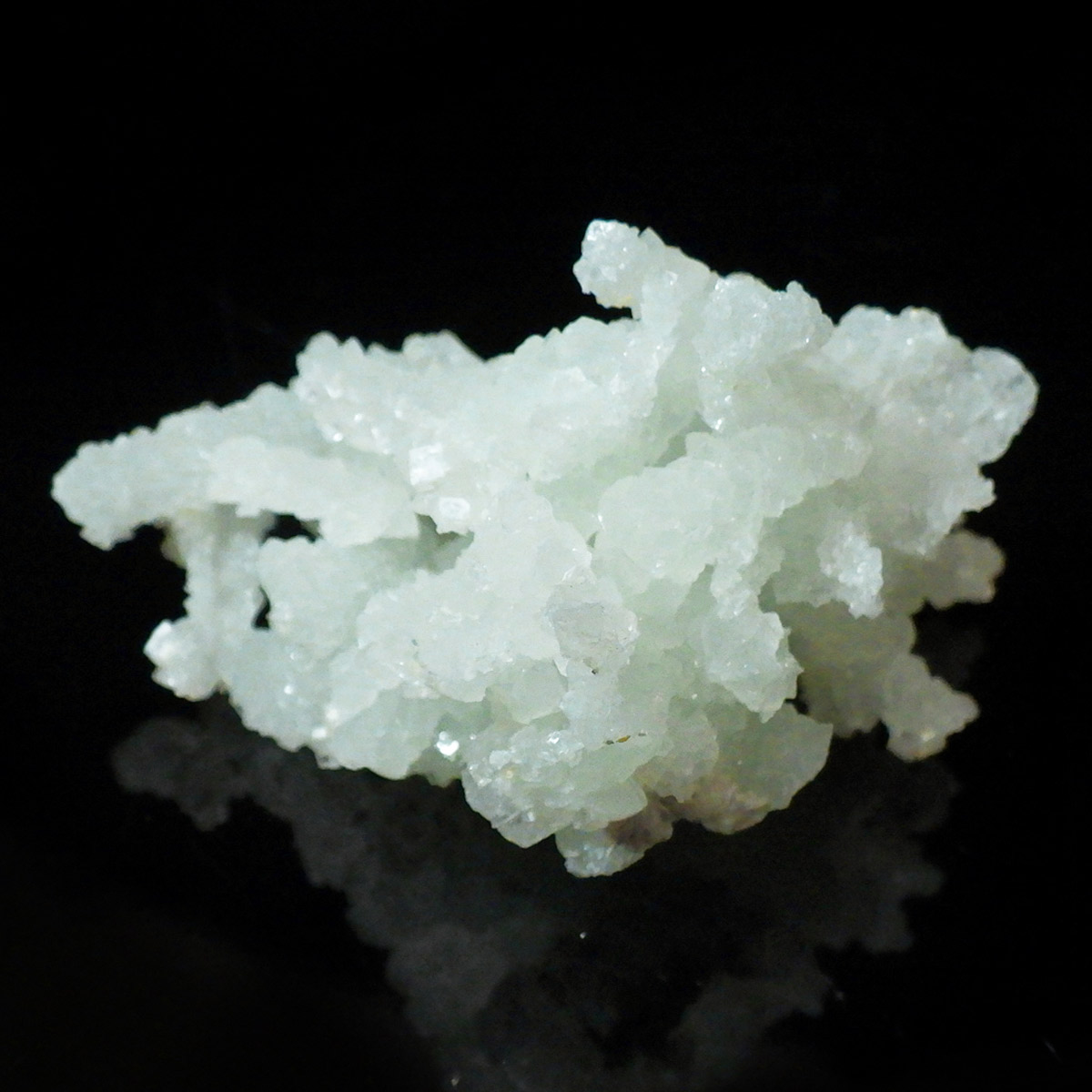 インド産のプレナイト、原石です。プレナイトは、淡い青緑から黄色にかけての色合いの石。1788年に南アフリカで初めてこの石を発見したフォン・プレーン大佐にちなんで名付けられました。葡萄石という和名は、産出時に見た目が葡萄のようであったことから名づけられました。多くのプレナイトは葡萄のような丸っこいフォルムをしていますが、稀にこちらの原石の様に柱状の集合体で産出されます。表面は粗粒の結晶が無数に集合した珍しい状態の原石です。