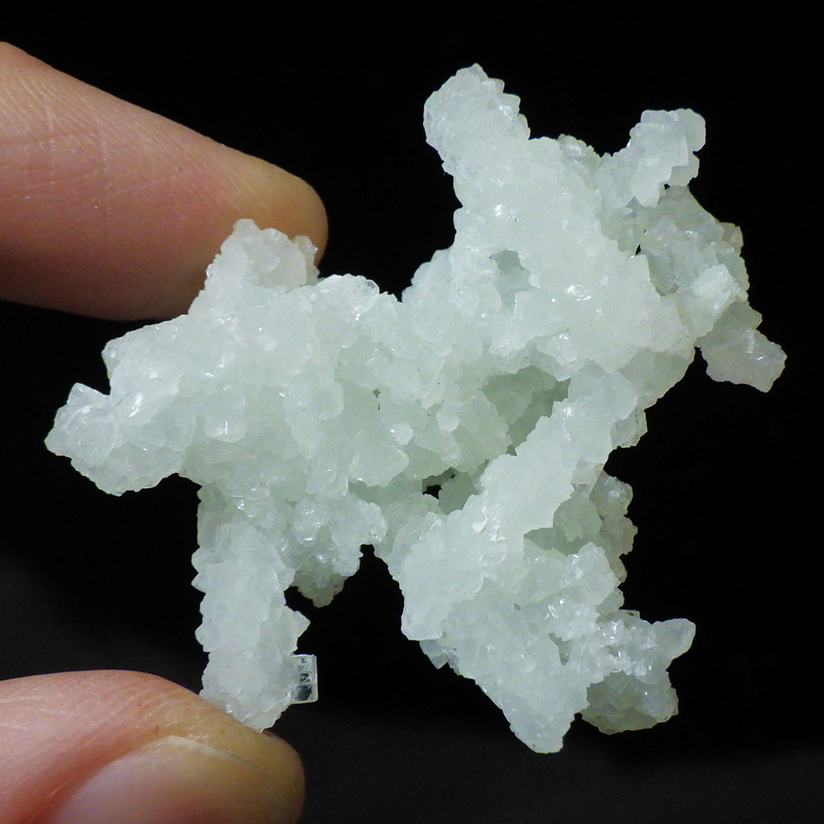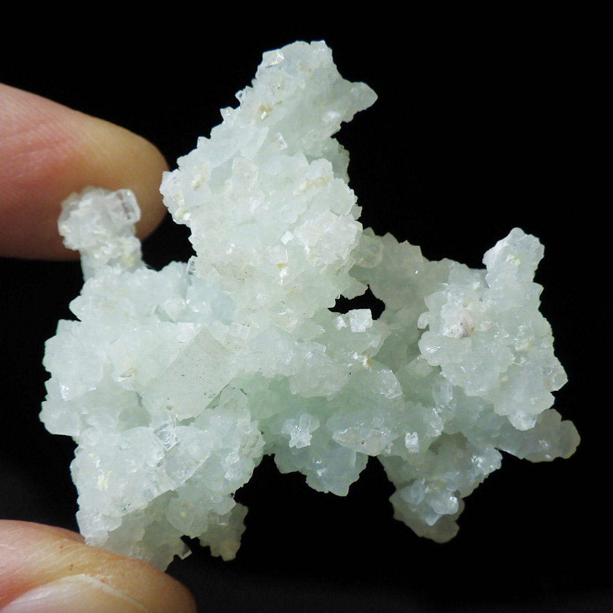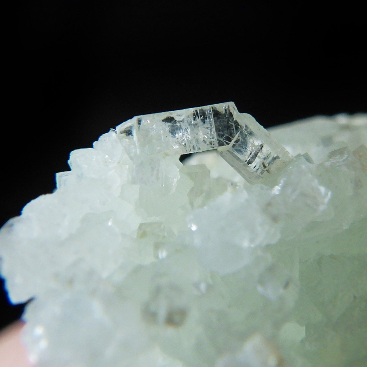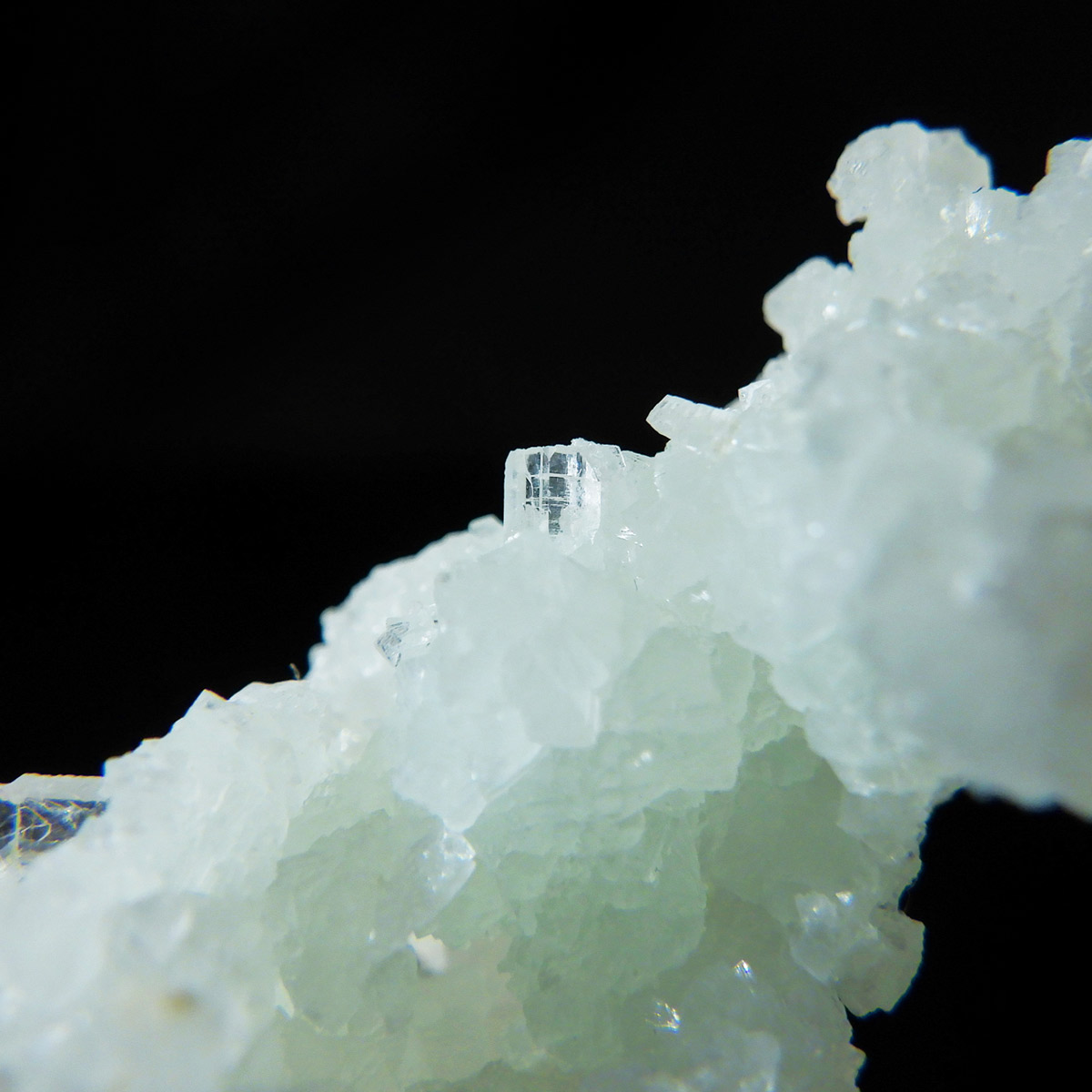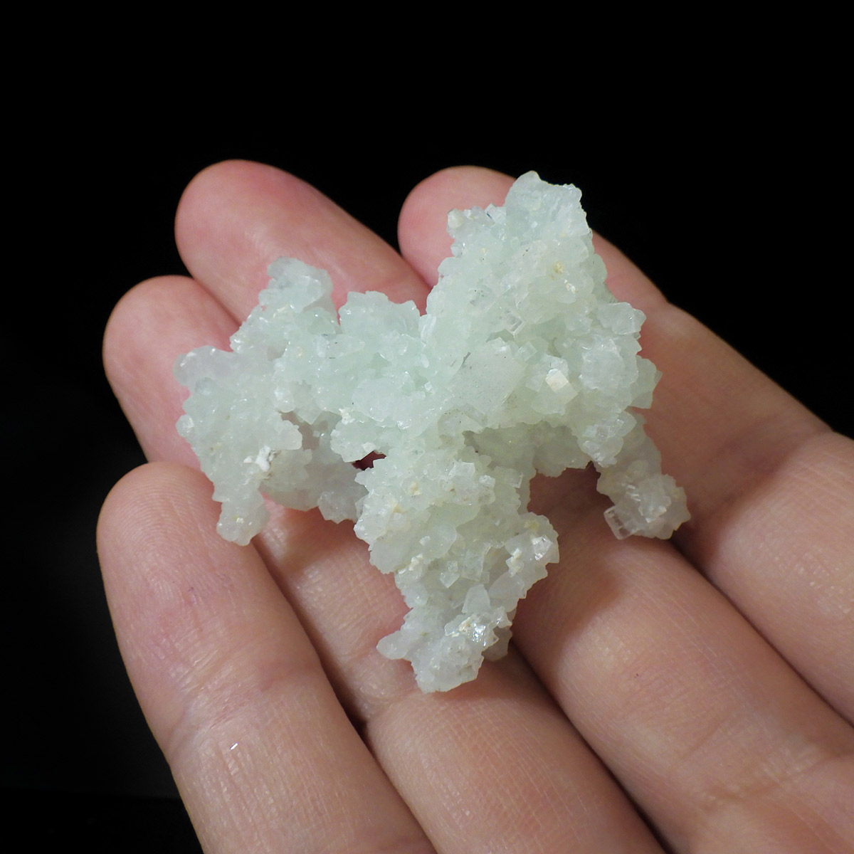 インド産のプレナイト、原石です。プレナイトは、淡い青緑から黄色にかけての色合いの石。1788年に南アフリカで初めてこの石を発見したフォン・プレーン大佐にちなんで名付けられました。葡萄石という和名は、産出時に見た目が葡萄のようであったことから名づけられました。多くのプレナイトは葡萄のような丸っこいフォルムをしていますが、稀にこちらの原石の様に柱状の集合体で産出されます。表面は粗粒の結晶が無数に集合した珍しい状態の原石です。