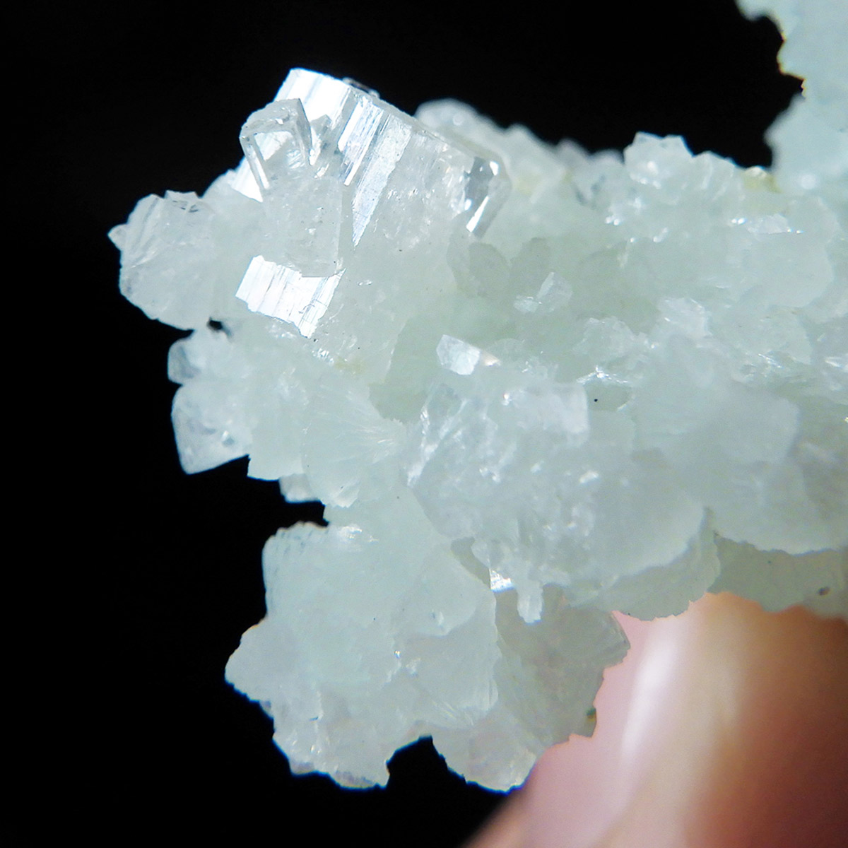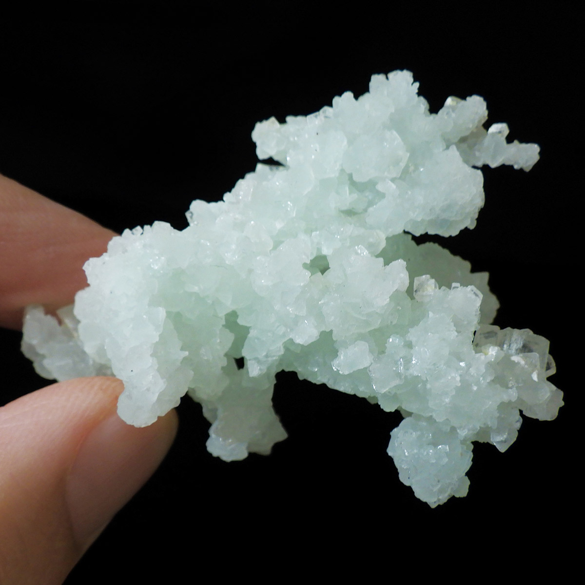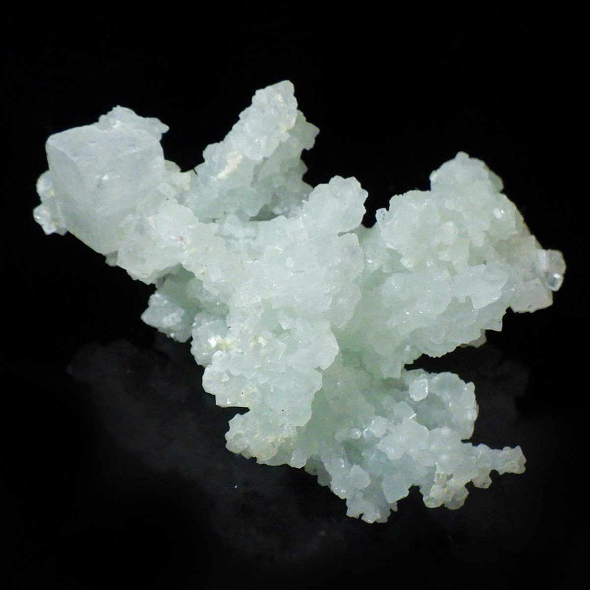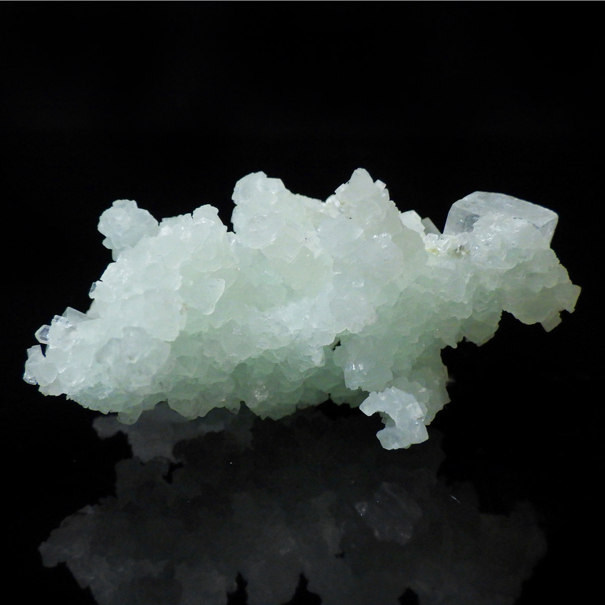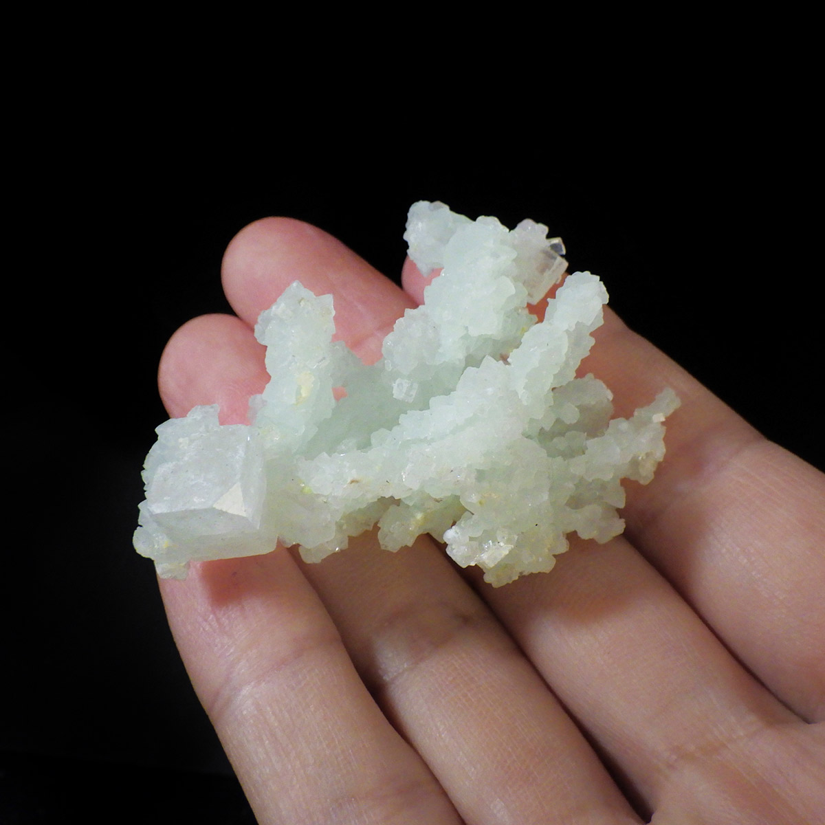 インド産のプレナイト、原石です。プレナイトは、淡い青緑から黄色にかけての色合いの石。1788年に南アフリカで初めてこの石を発見したフォン・プレーン大佐にちなんで名付けられました。葡萄石という和名は、産出時に見た目が葡萄のようであったことから名づけられました。多くのプレナイトは葡萄のような丸っこいフォルムをしていますが、稀にこちらの原石の様に柱状の集合体で産出されます。表面は粗粒の結晶が無数に集合した珍しい状態の原石です。