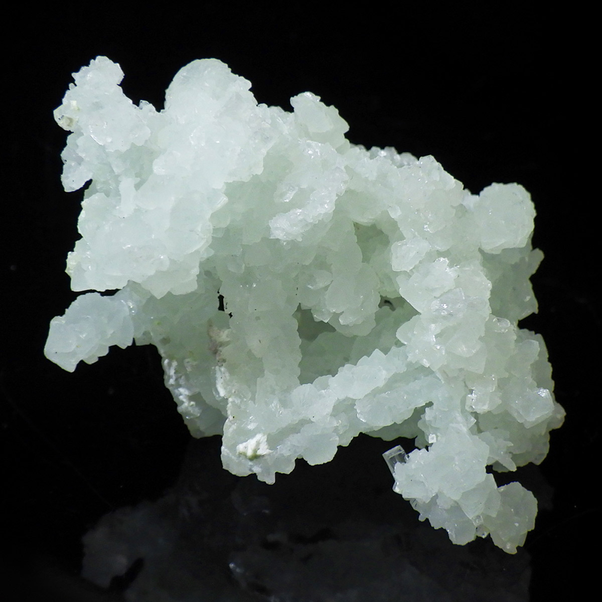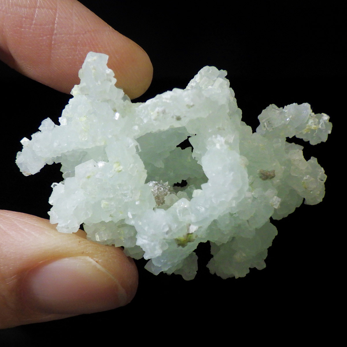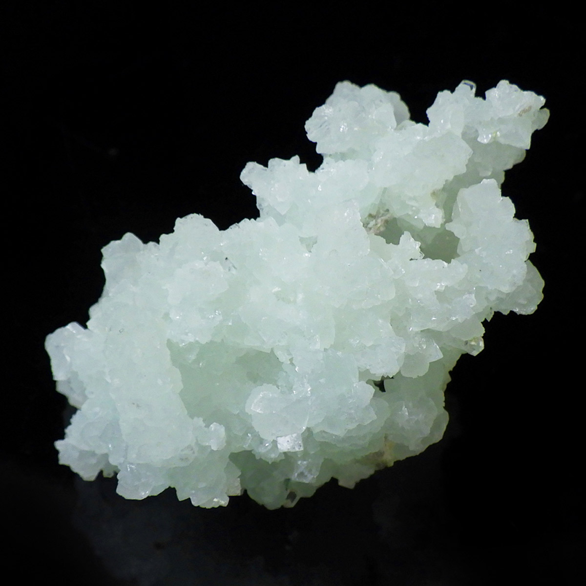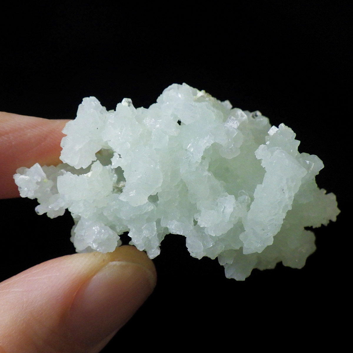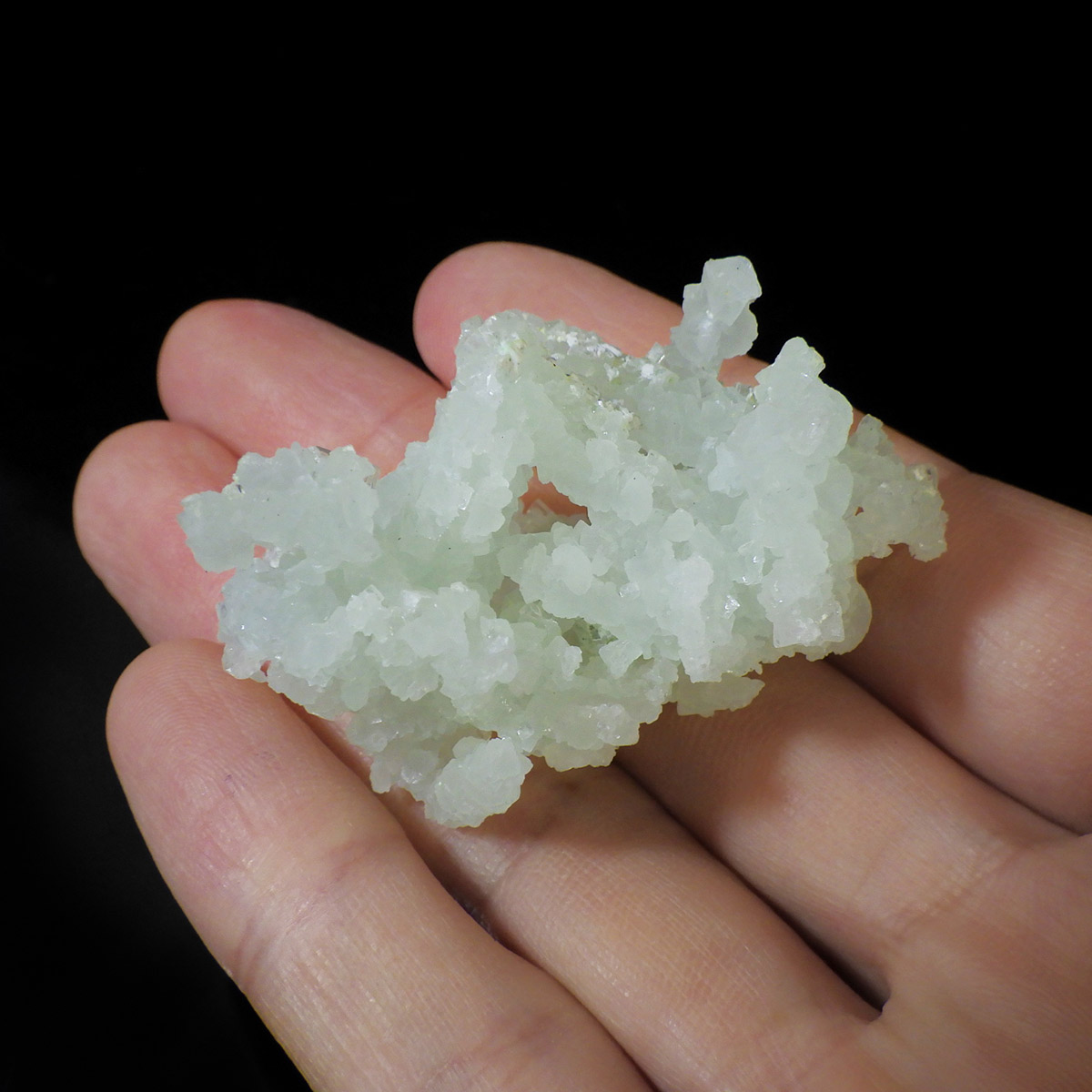 インド産のプレナイト、原石です。プレナイトは、淡い青緑から黄色にかけての色合いの石。1788年に南アフリカで初めてこの石を発見したフォン・プレーン大佐にちなんで名付けられました。葡萄石という和名は、産出時に見た目が葡萄のようであったことから名づけられました。多くのプレナイトは葡萄のような丸っこいフォルムをしていますが、稀にこちらの原石の様に柱状の集合体で産出されます。表面は粗粒の結晶が無数に集合した珍しい状態の原石です。