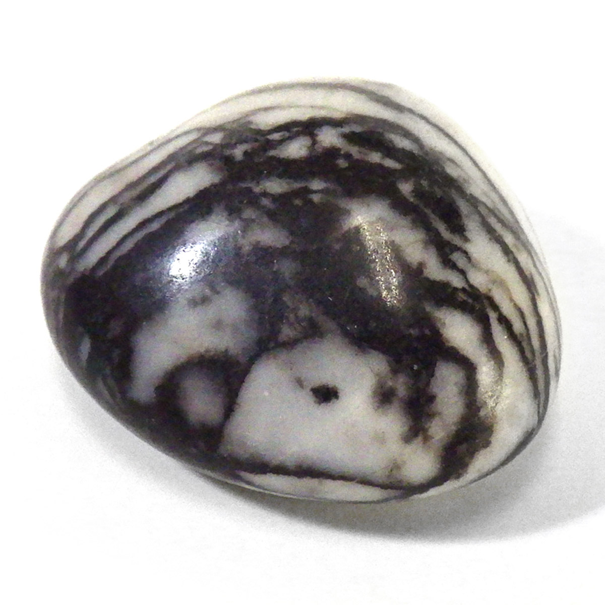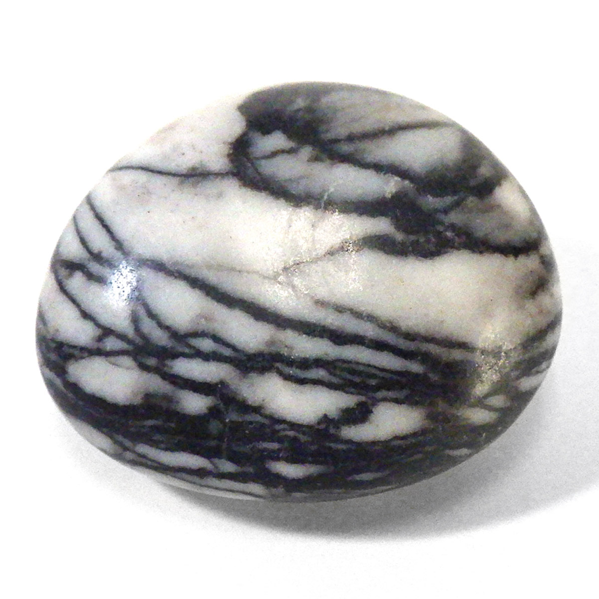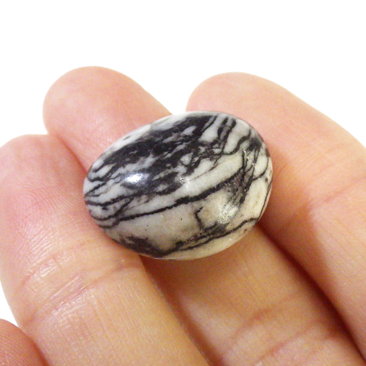 アメリカ産のスパイダーウェブジャスパー、タンブルです。ジャスパーは様々な不純物を含んだ石英の総称です。白地に黒く細い線を有した模様のジャスパーを蜘蛛の巣に見えることからスパイダーウェブジャスパーを呼ばれています。ジャスパーはダルメシアンジャスパーやゼブラジャスパーなどその見た目から名前が付けられているものがいくつかあります。スパイダーウェブジャスパーは意味合いとしては愛を絡めとる石として知られています。