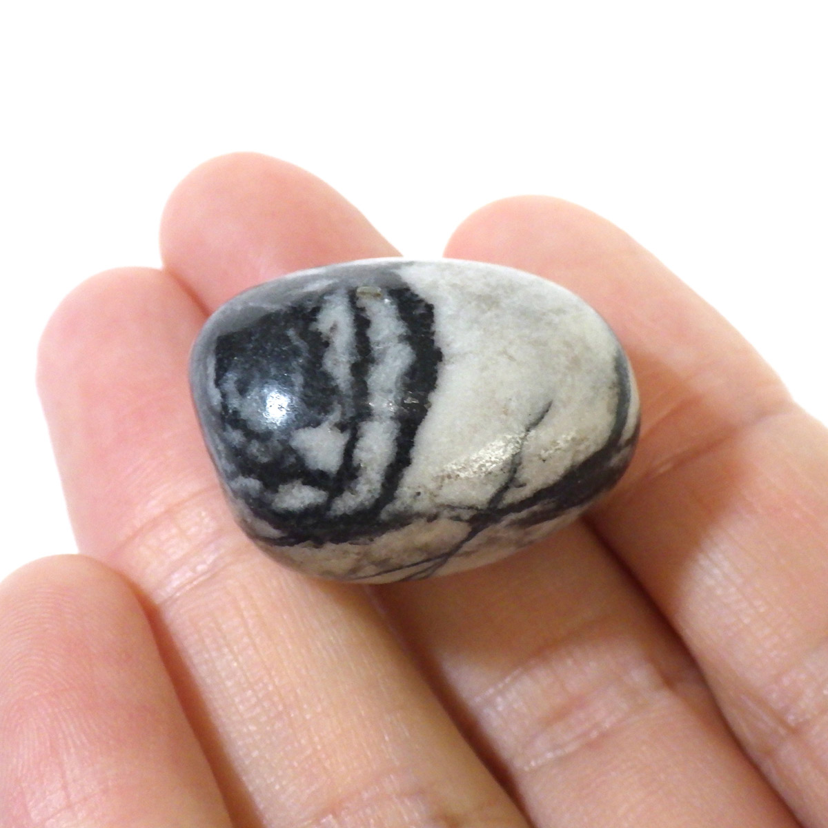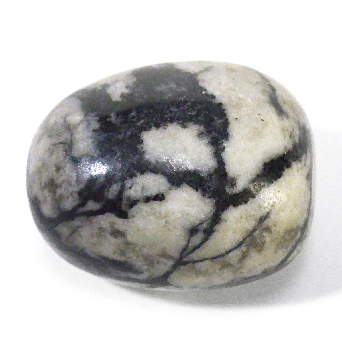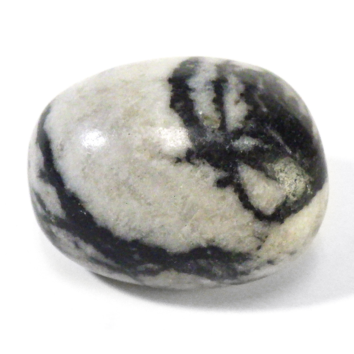 アメリカ産のスパイダーウェブジャスパー、タンブルです。ジャスパーは様々な不純物を含んだ石英の総称です。白地に黒く細い線を有した模様のジャスパーを蜘蛛の巣に見えることからスパイダーウェブジャスパーを呼ばれています。ジャスパーはダルメシアンジャスパーやゼブラジャスパーなどその見た目から名前が付けられているものがいくつかあります。スパイダーウェブジャスパーは意味合いとしては愛を絡めとる石として知られています。