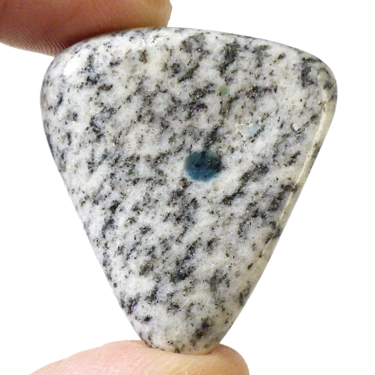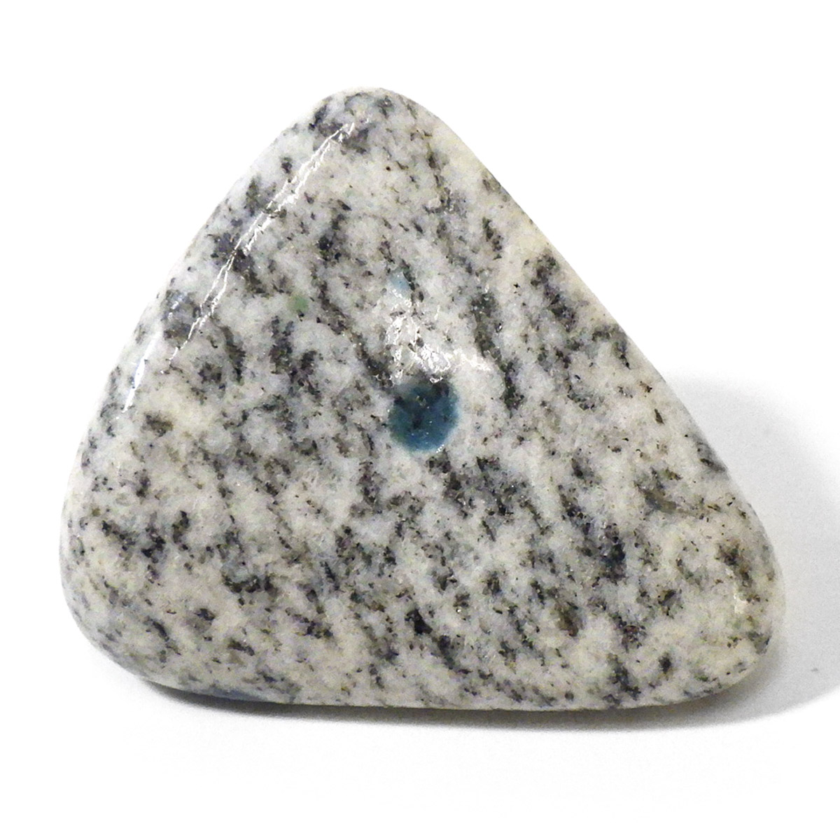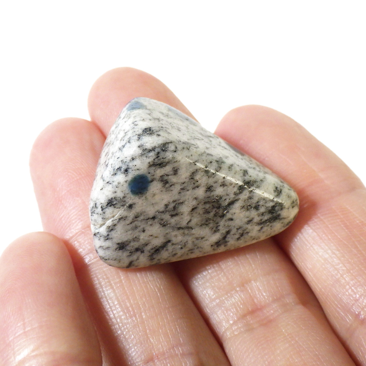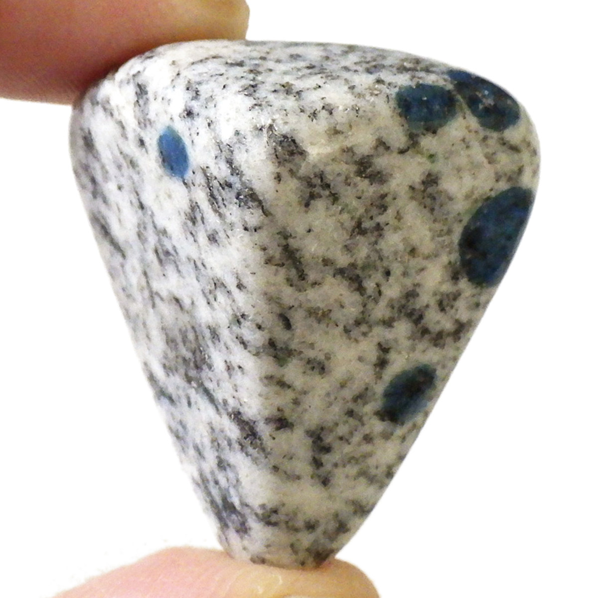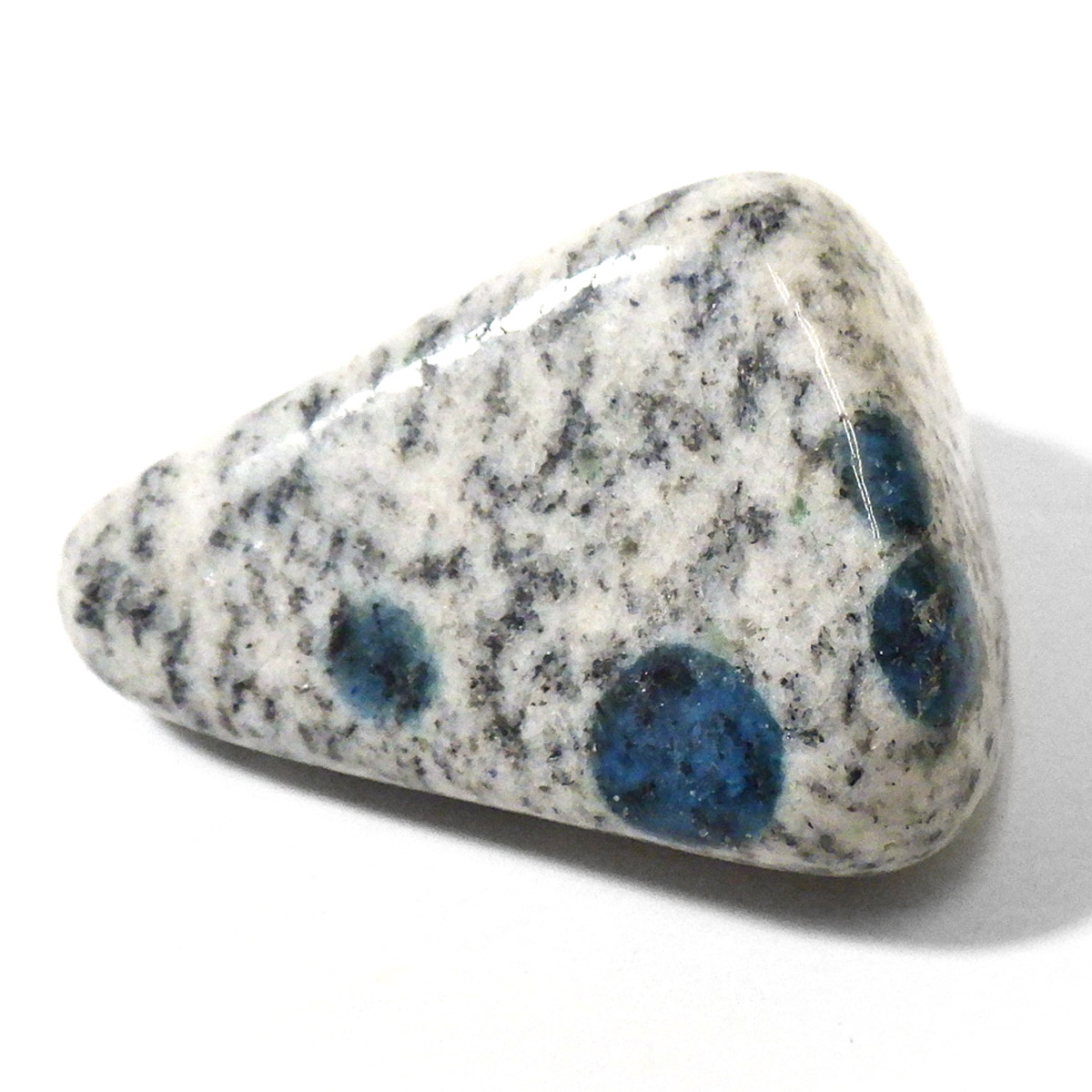 パキスタン産のK2ストーン、タンブルです。パキスタン・インド・中国の国境付近に横たわる、標高世界第二位のカラコルム山脈のK2マウンテンで発見されたことから、流通名として「K2ストーン」「K2アズライト」「K2ブルー」などと呼ばれています。世界一登ることが難しい山と言われ、登頂が大変困難なことからK2ストーンは希少とされています。青い結晶のアズライトが(藍銅鉱)が花崗岩に内包しています。鉱物名ではアズライトイングラナイトです。