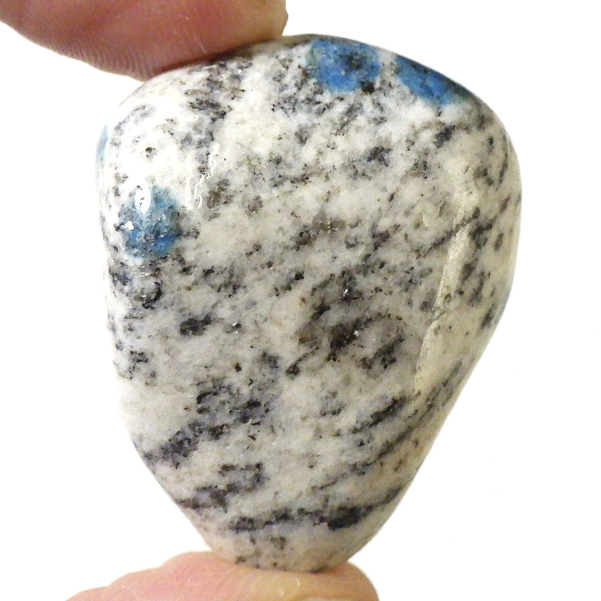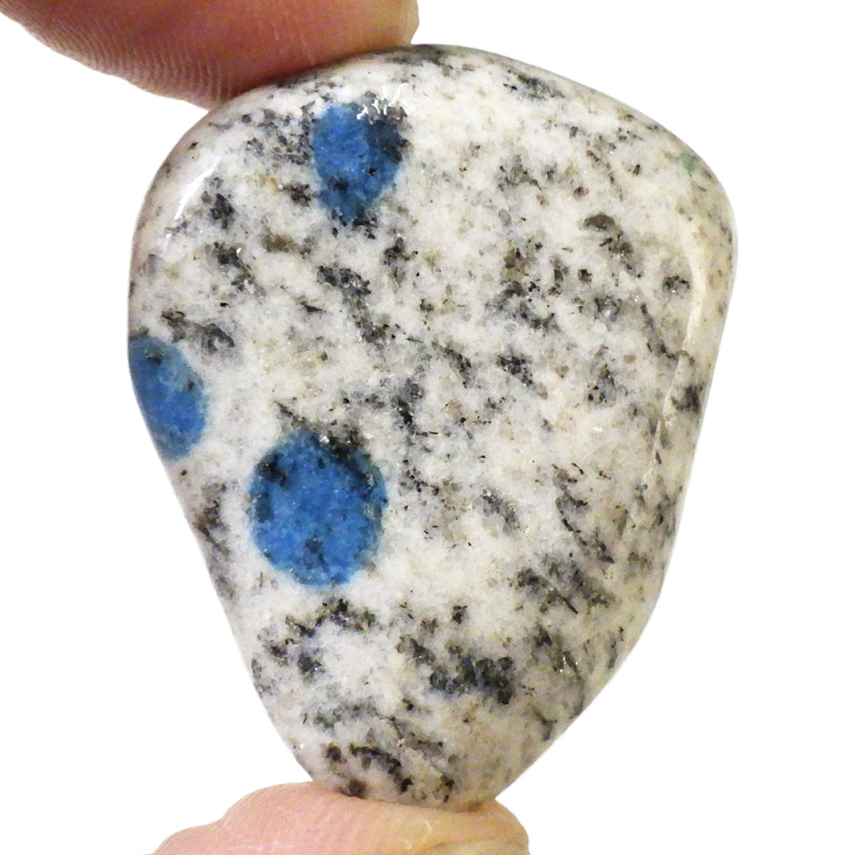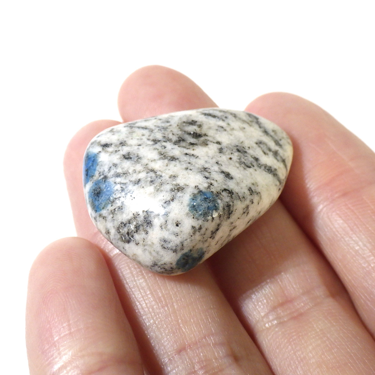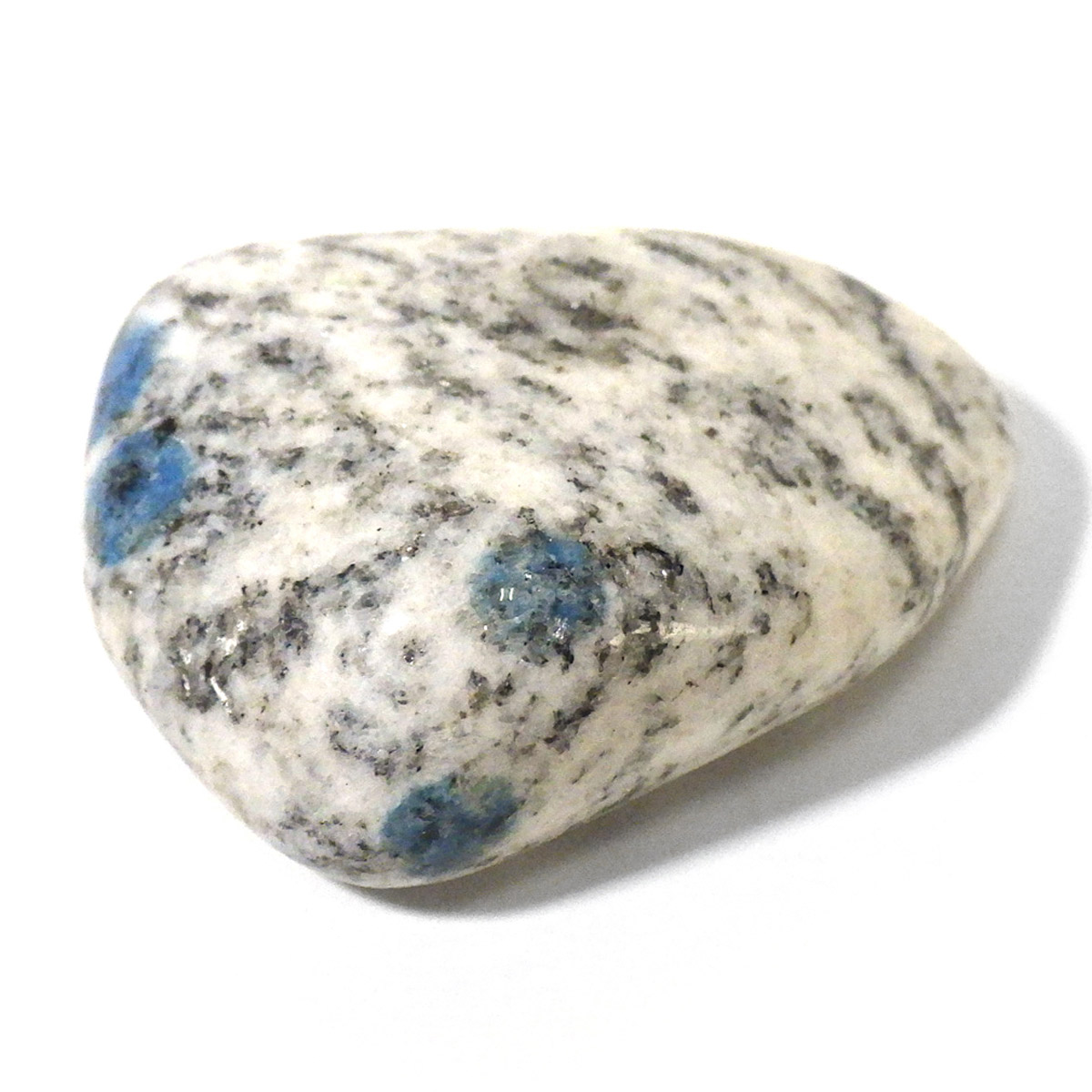 パキスタン産のK2ストーン、タンブルです。パキスタン・インド・中国の国境付近に横たわる、標高世界第二位のカラコルム山脈のK2マウンテンで発見されたことから、流通名として「K2ストーン」「K2アズライト」「K2ブルー」などと呼ばれています。世界一登ることが難しい山と言われ、登頂が大変困難なことからK2ストーンは希少とされています。青い結晶のアズライトが(藍銅鉱)が花崗岩に内包しています。鉱物名ではアズライトイングラナイトです。