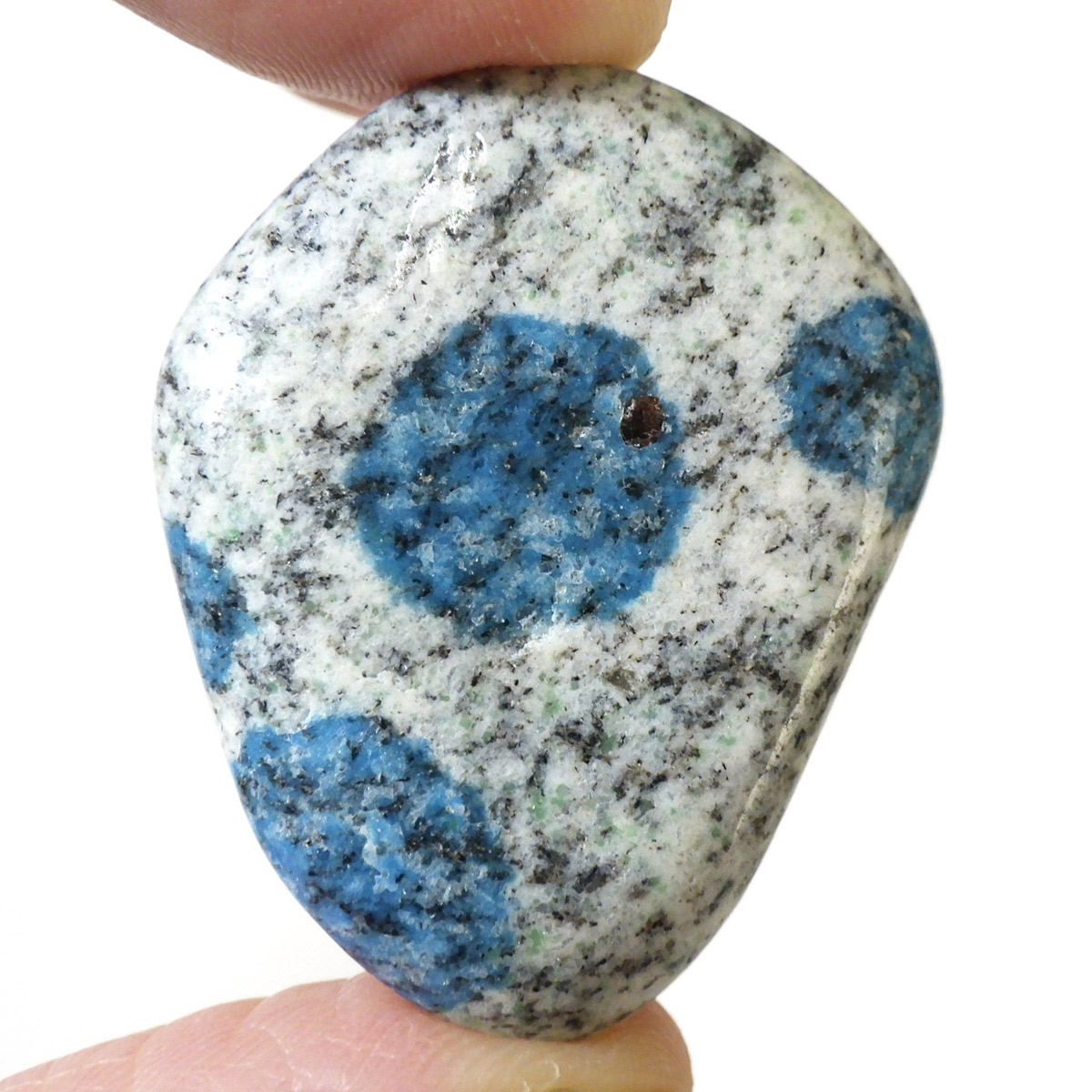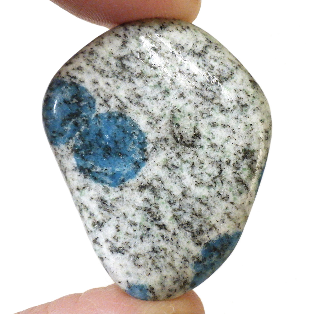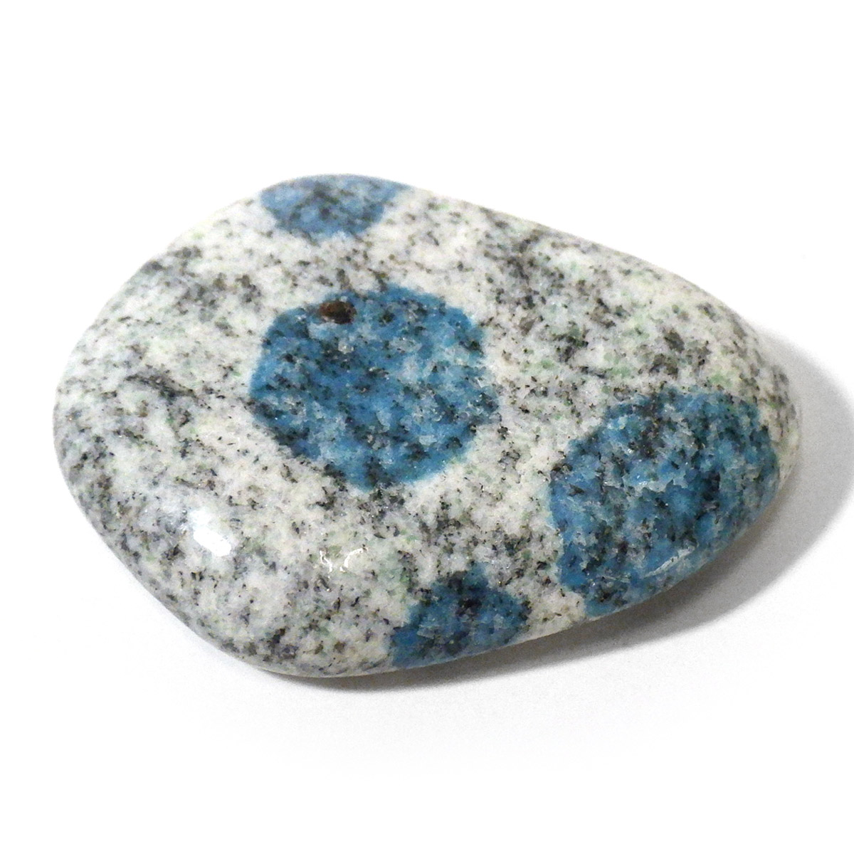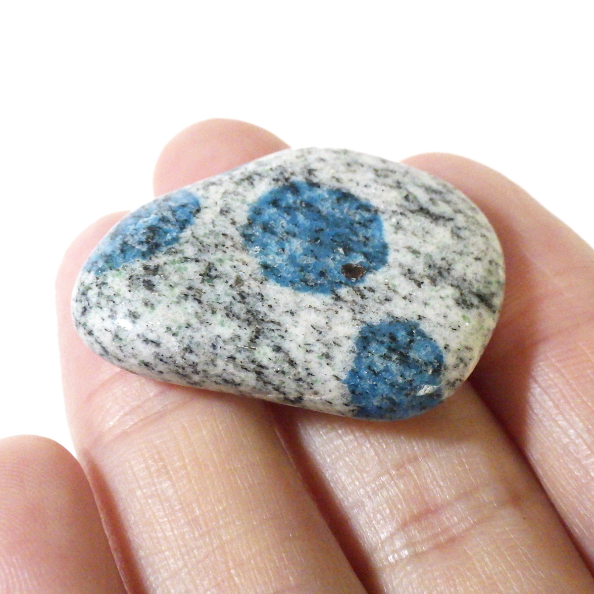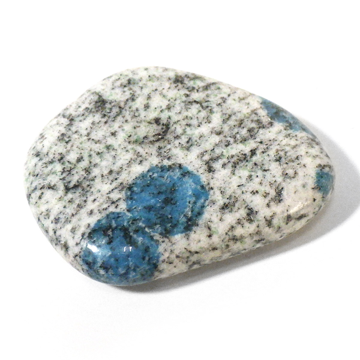 パキスタン産のK2ストーン、タンブルです。パキスタン・インド・中国の国境付近に横たわる、標高世界第二位のカラコルム山脈のK2マウンテンで発見されたことから、流通名として「K2ストーン」「K2アズライト」「K2ブルー」などと呼ばれています。世界一登ることが難しい山と言われ、登頂が大変困難なことからK2ストーンは希少とされています。青い結晶のアズライトが(藍銅鉱)が花崗岩に内包しています。鉱物名ではアズライトイングラナイトです。