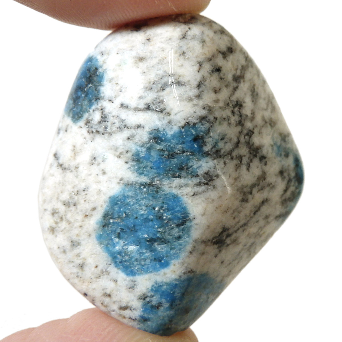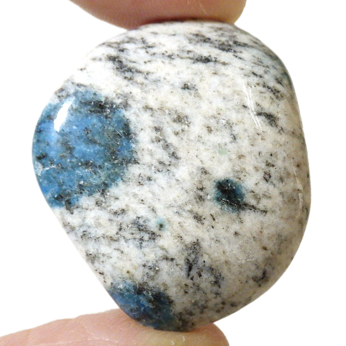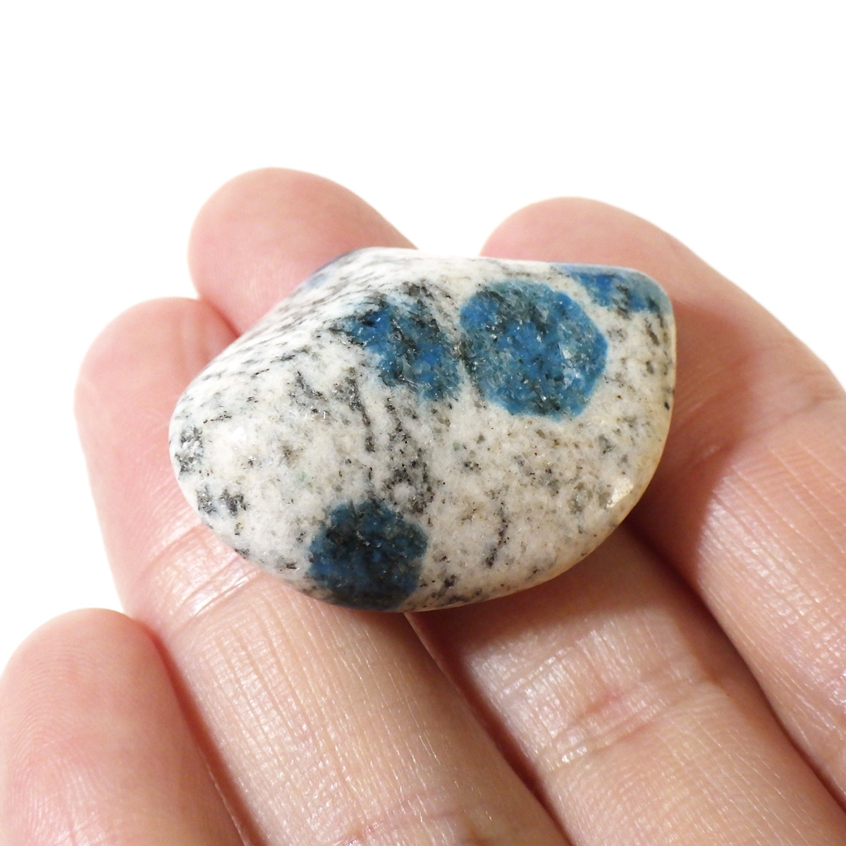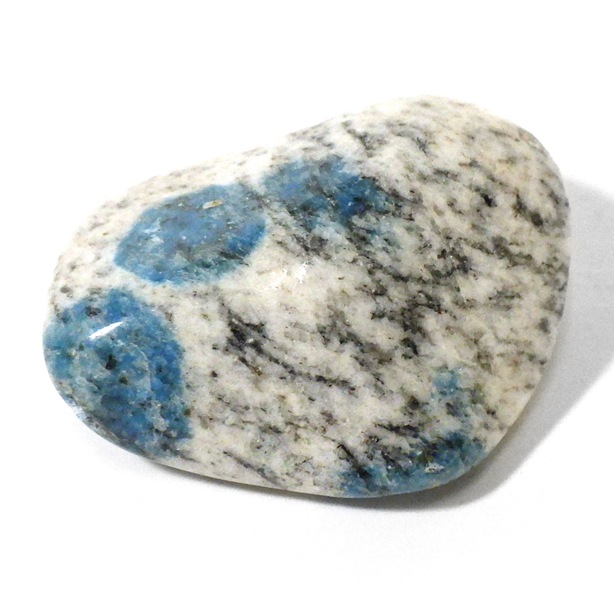 パキスタン産のK2ストーン、タンブルです。パキスタン・インド・中国の国境付近に横たわる、標高世界第二位のカラコルム山脈のK2マウンテンで発見されたことから、流通名として「K2ストーン」「K2アズライト」「K2ブルー」などと呼ばれています。世界一登ることが難しい山と言われ、登頂が大変困難なことからK2ストーンは希少とされています。青い結晶のアズライトが(藍銅鉱)が花崗岩に内包しています。鉱物名ではアズライトイングラナイトです。