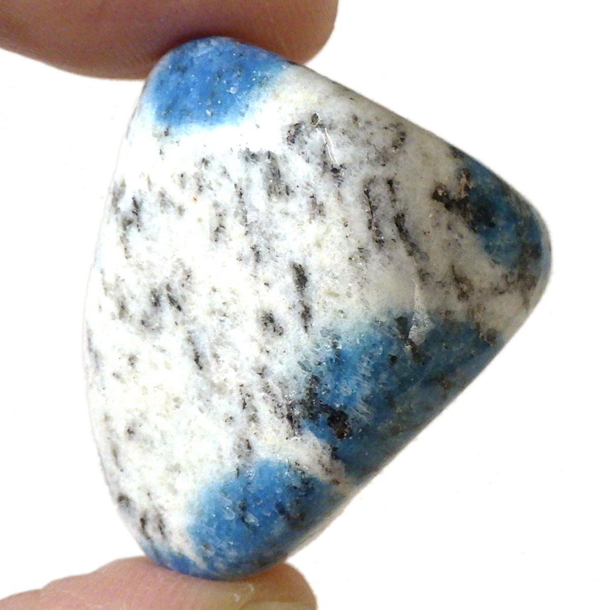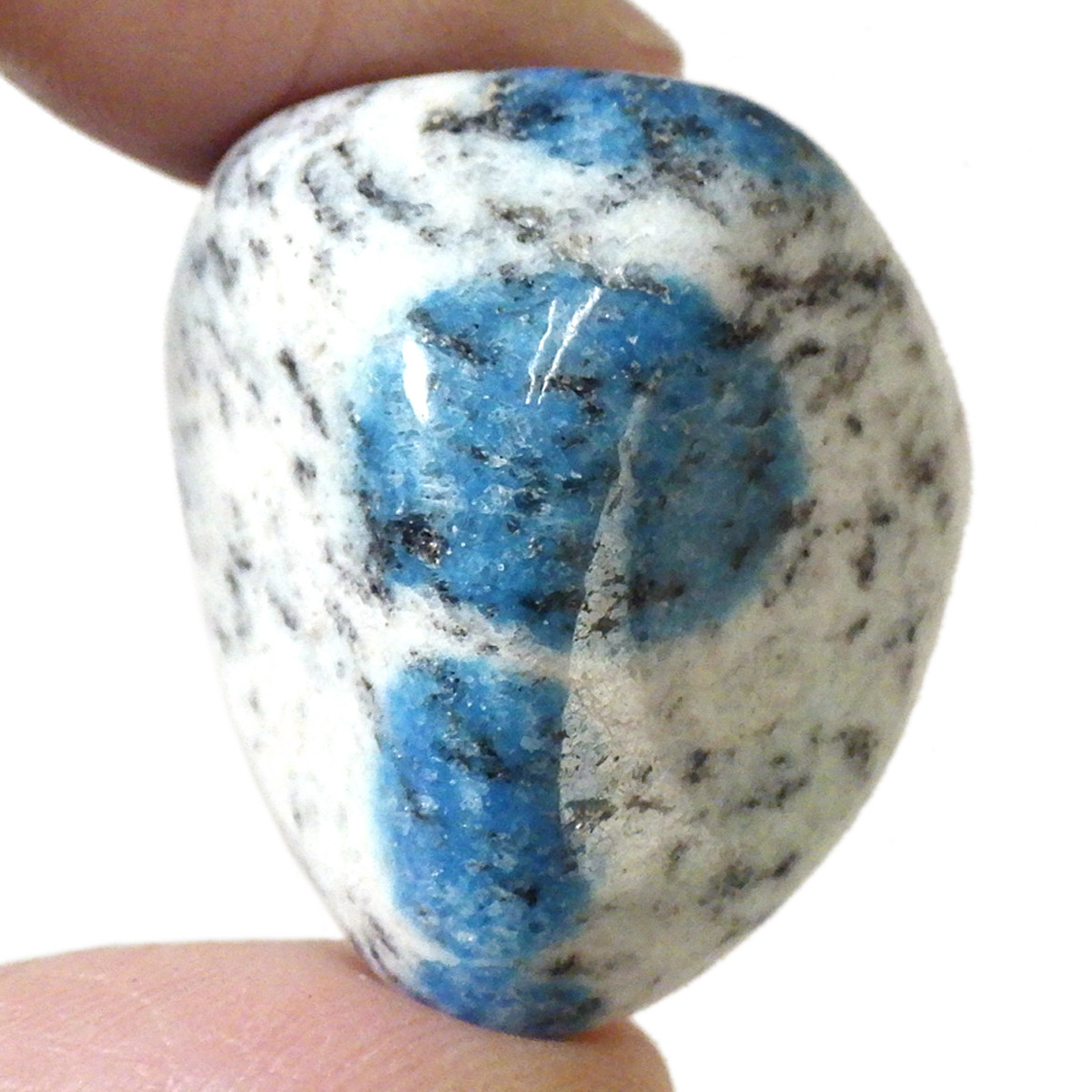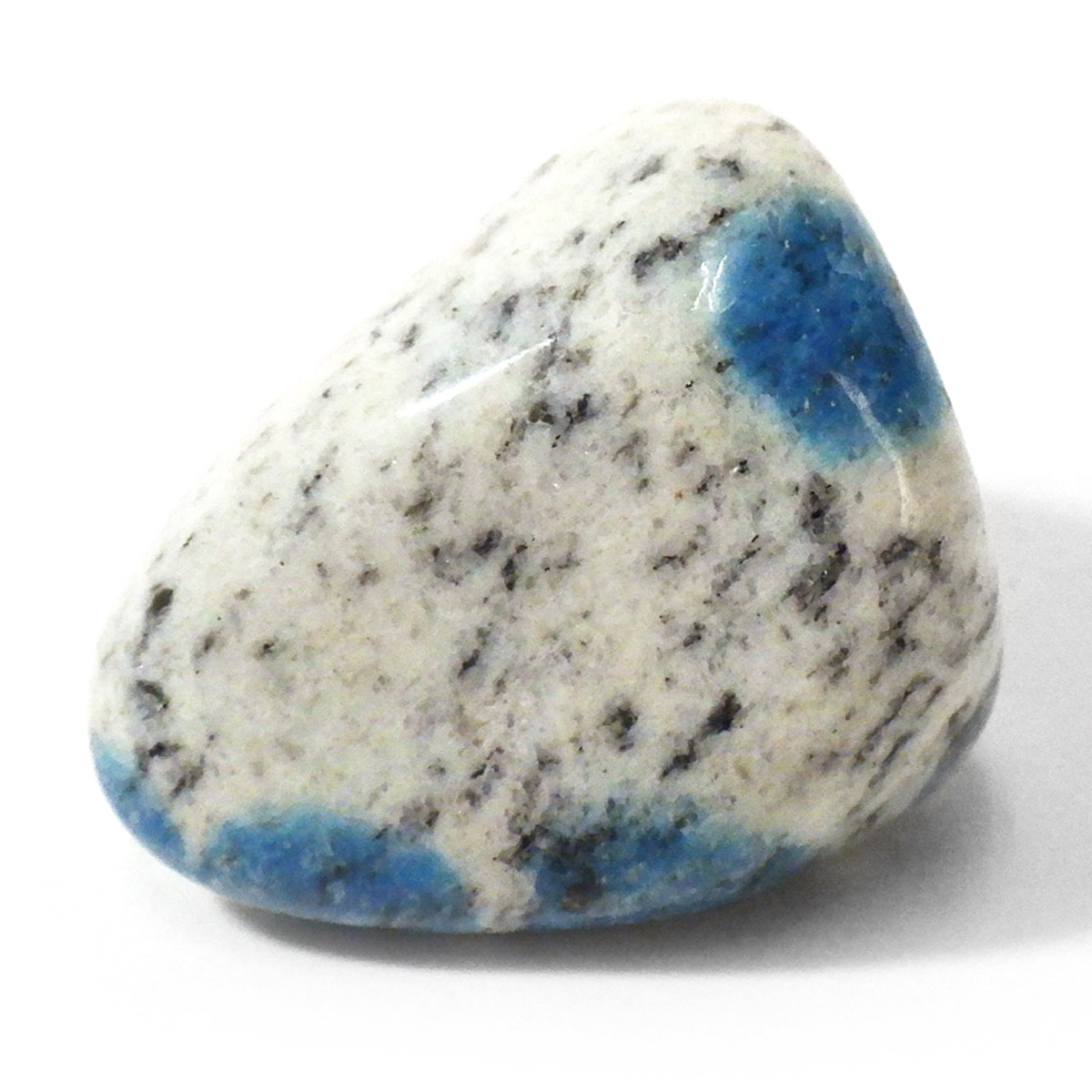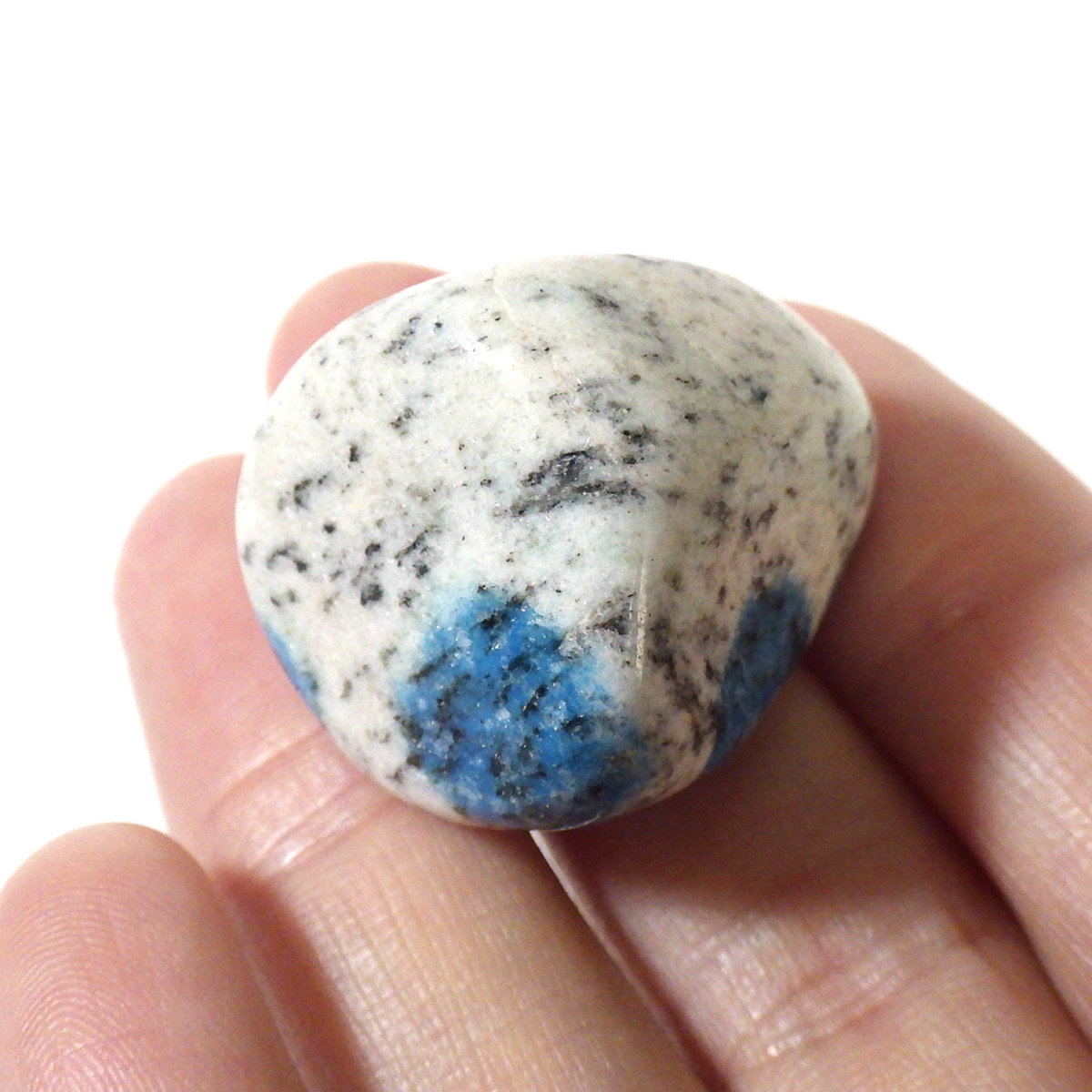 パキスタン産のK2ストーン、タンブルです。パキスタン・インド・中国の国境付近に横たわる、標高世界第二位のカラコルム山脈のK2マウンテンで発見されたことから、流通名として「K2ストーン」「K2アズライト」「K2ブルー」などと呼ばれています。世界一登ることが難しい山と言われ、登頂が大変困難なことからK2ストーンは希少とされています。青い結晶のアズライトが(藍銅鉱)が花崗岩に内包しています。鉱物名ではアズライトイングラナイトです。