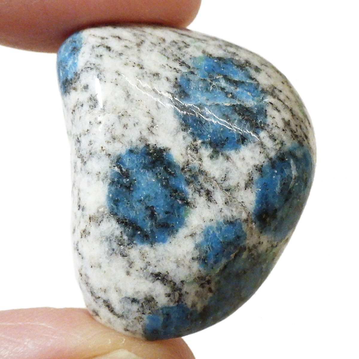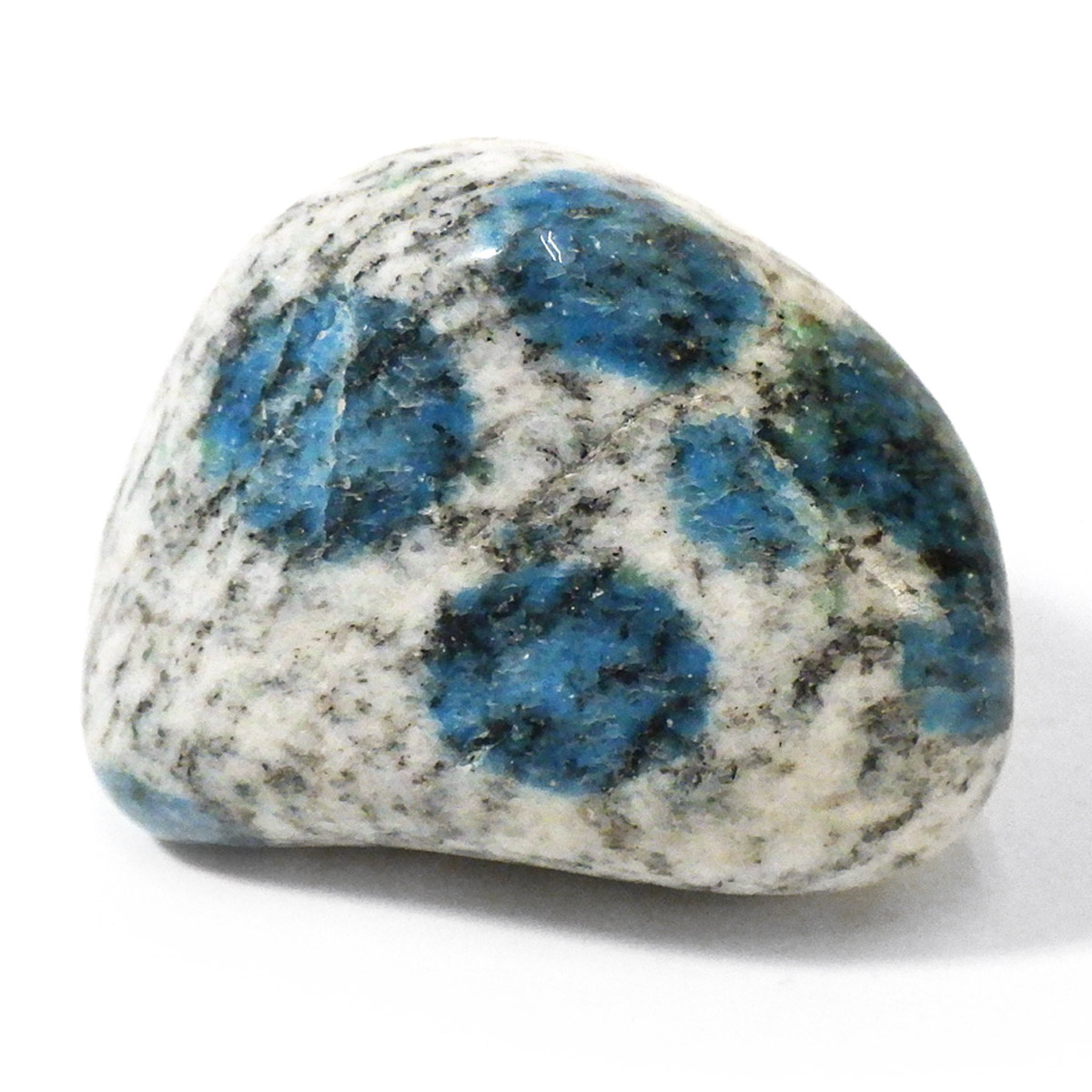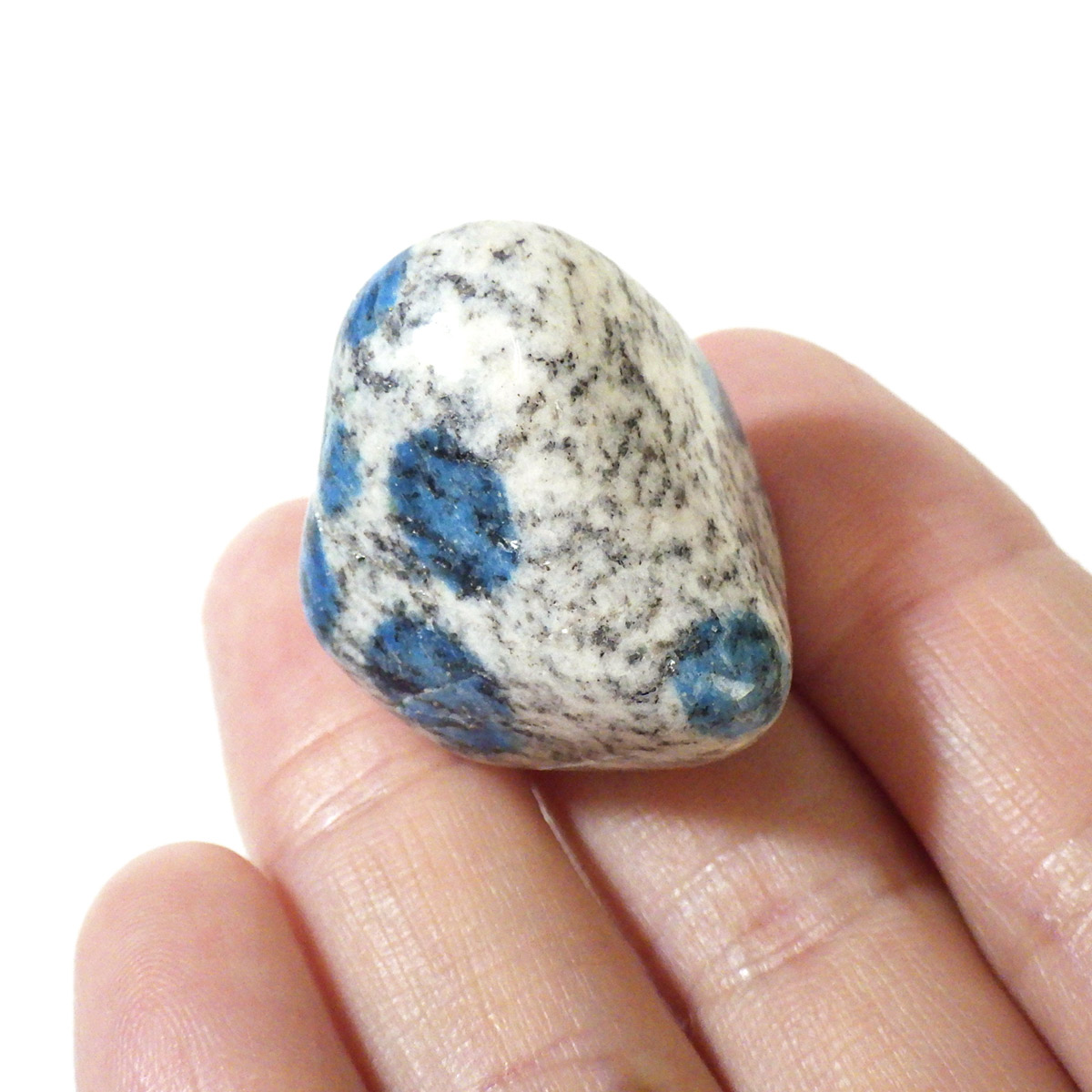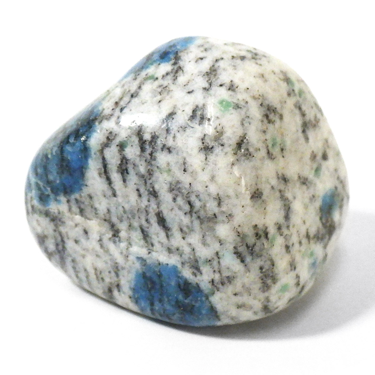 パキスタン産のK2ストーン、タンブルです。パキスタン・インド・中国の国境付近に横たわる、標高世界第二位のカラコルム山脈のK2マウンテンで発見されたことから、流通名として「K2ストーン」「K2アズライト」「K2ブルー」などと呼ばれています。世界一登ることが難しい山と言われ、登頂が大変困難なことからK2ストーンは希少とされています。青い結晶のアズライトが(藍銅鉱)が花崗岩に内包しています。鉱物名ではアズライトイングラナイトです。