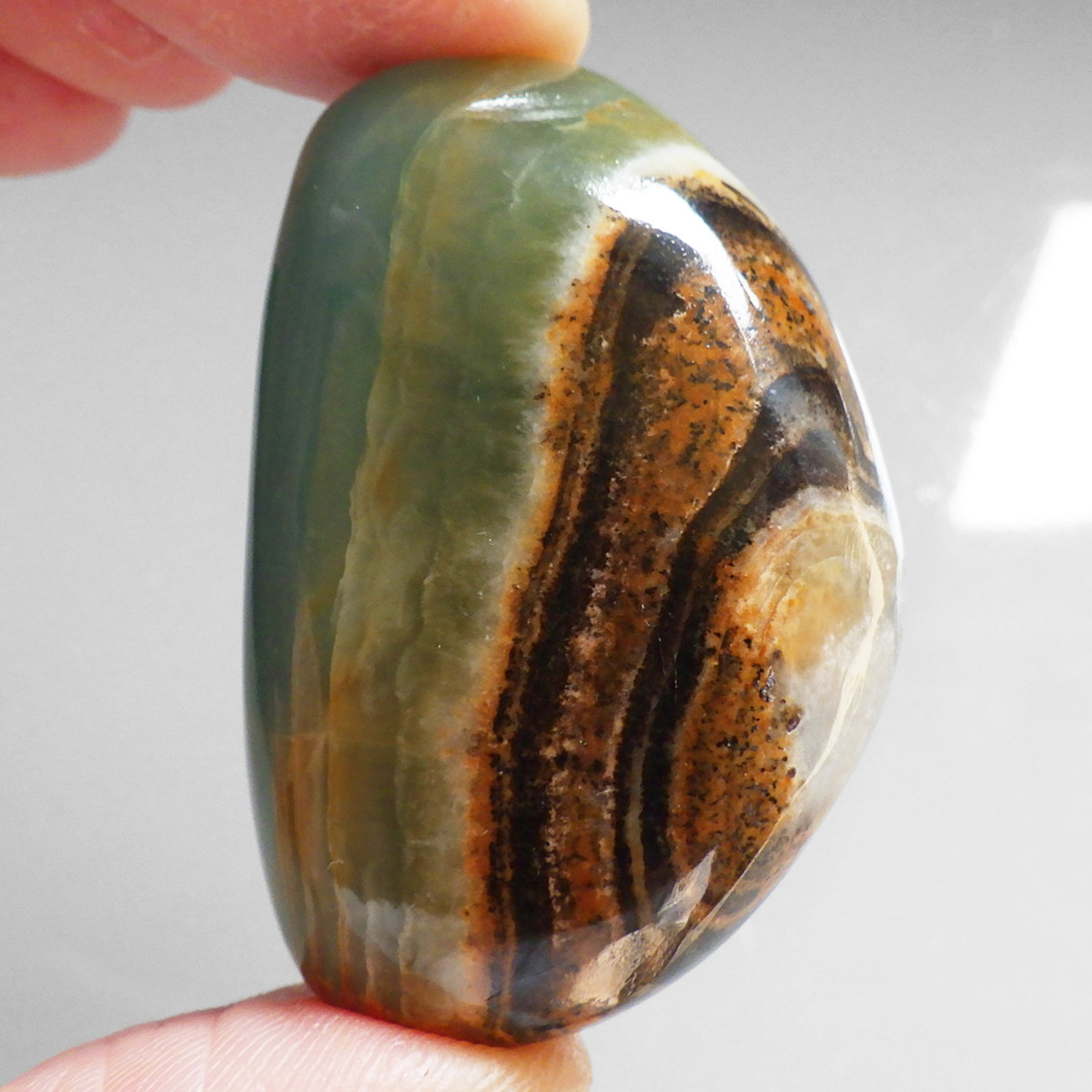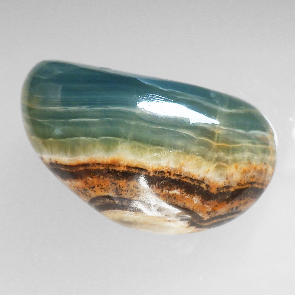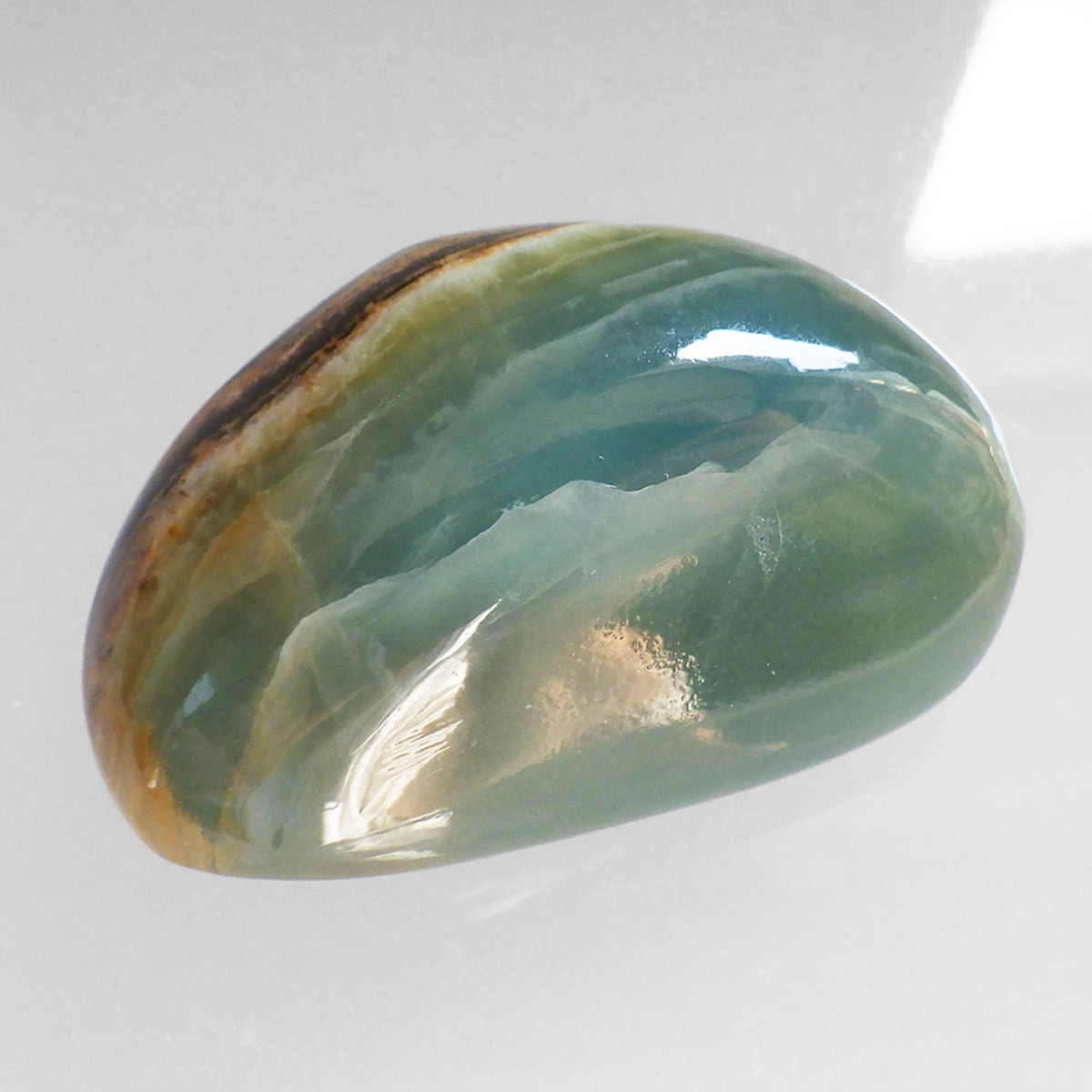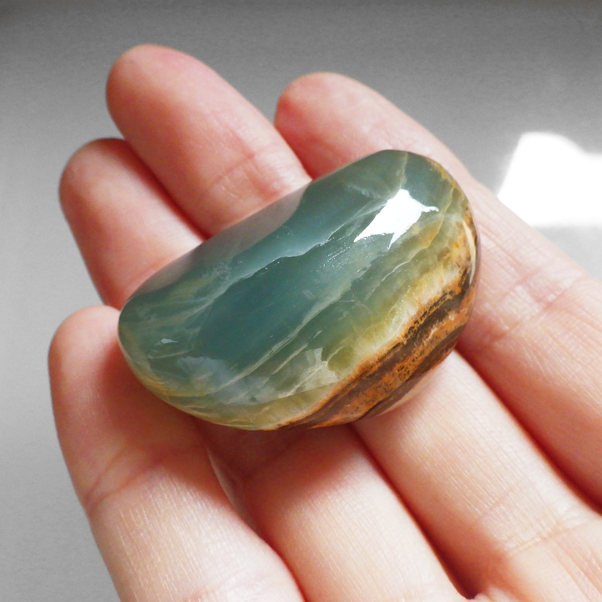 アルゼンチン産のブルーカルサイト、タンブルです。カルサイトは、イエロー、ブルー、ピンクなど様々な色合いを持つ石です。これらの色は、鉱物内に含まれている成分により色が異なります。カルサイトの中で青色のものがブルーカルサイトと呼ばれます。特にアルゼンチンで採れるものは優れた発色からアクアティンカルサイトと特別に呼んでいます。