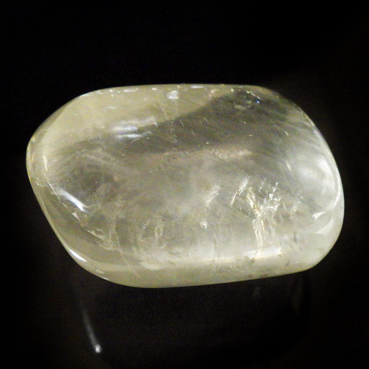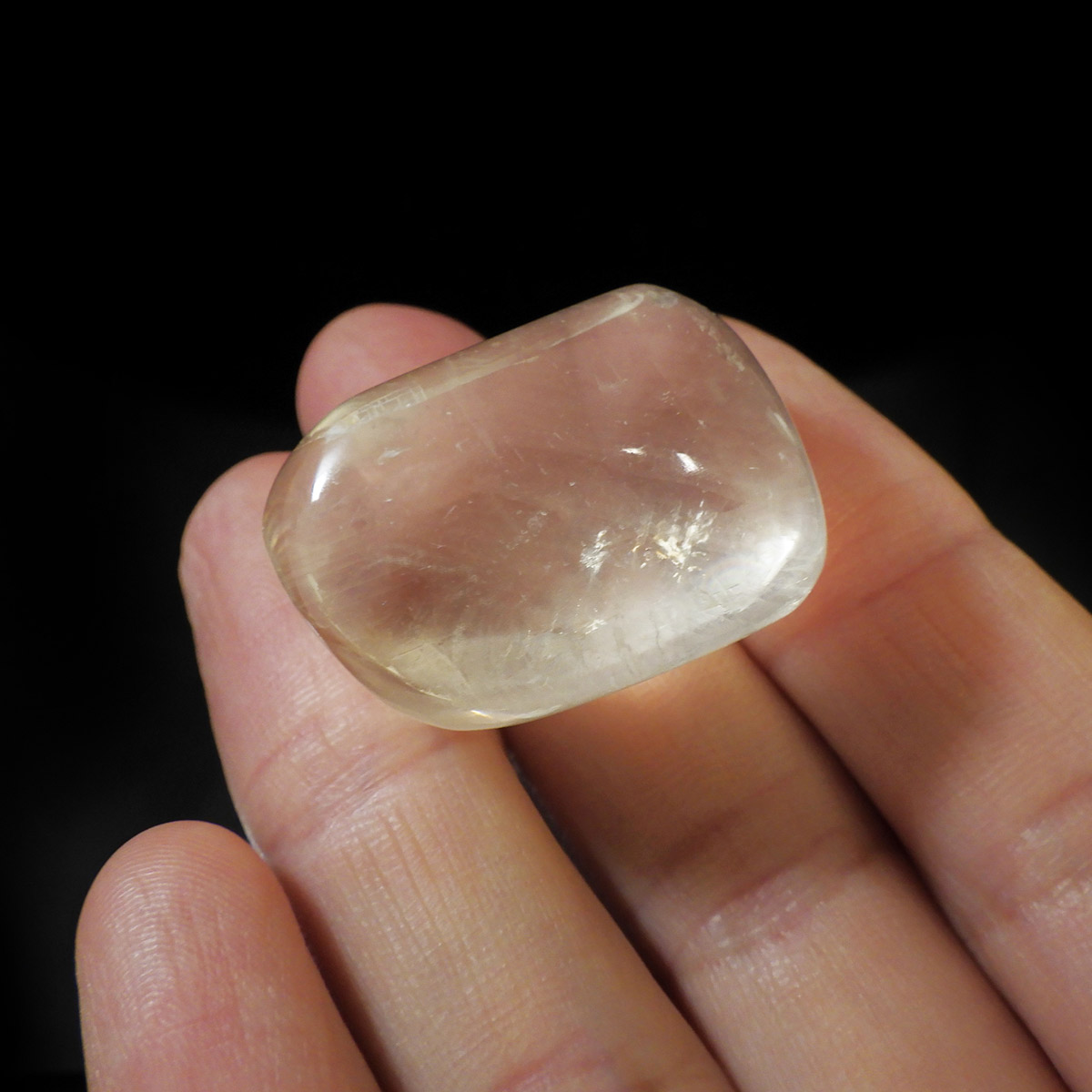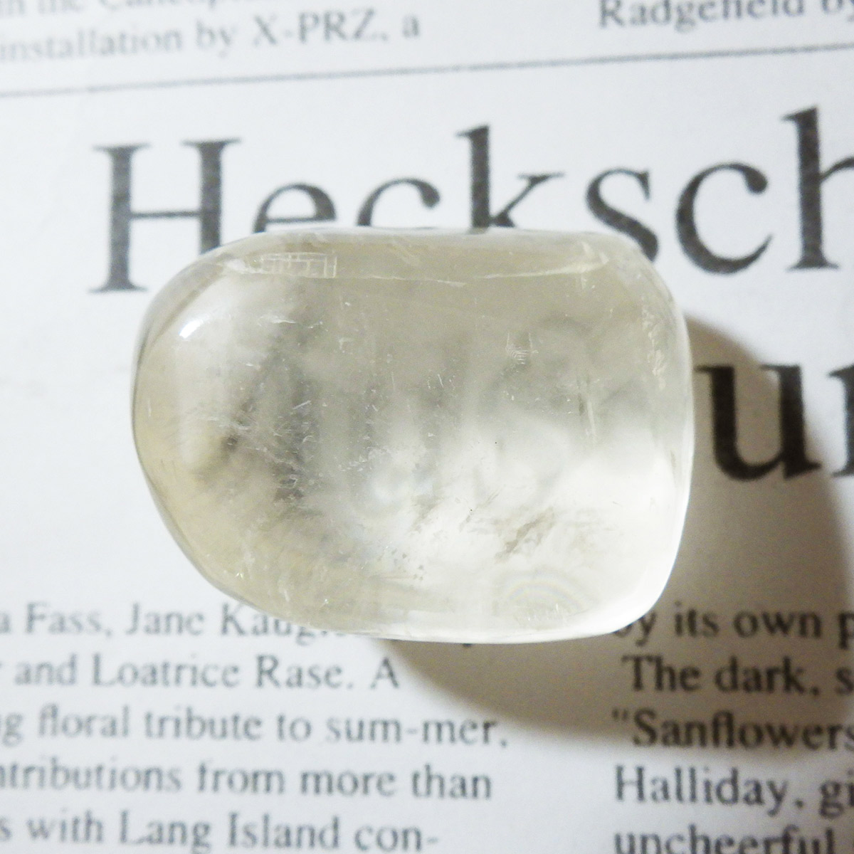 ブラジル産のイエローカルカルサイト、タンブルです。透明度の高いクリアで質の良いイエローカルサイトです。複屈折という光学現象を持ち、文字の上に載せると二つにダブって見える「ダブリング(二重像現象)」のような現象を起こします。透明度が高く、レインボーも見られ、とてもきれいでおすすめです。様々な表情でひかりますので、ぜひ自然光の元、手に乗せて光を楽しんでみてください。