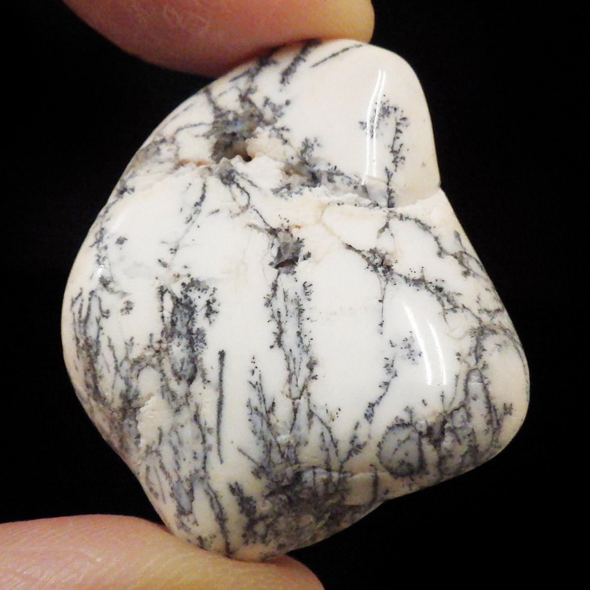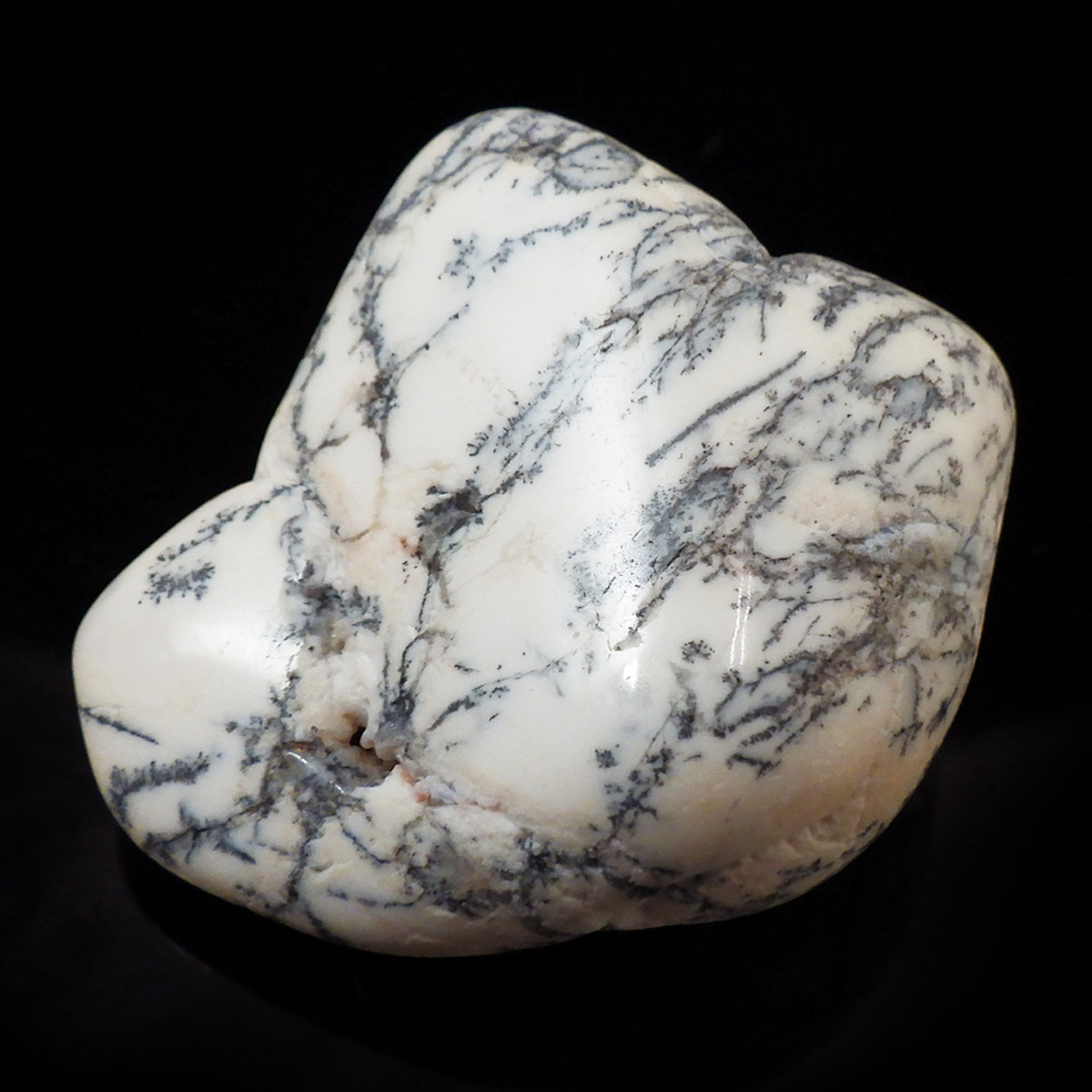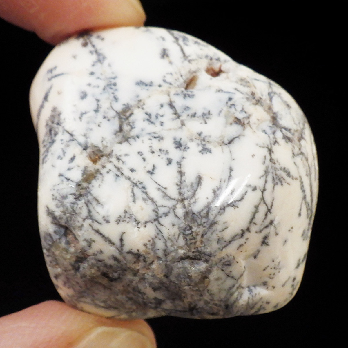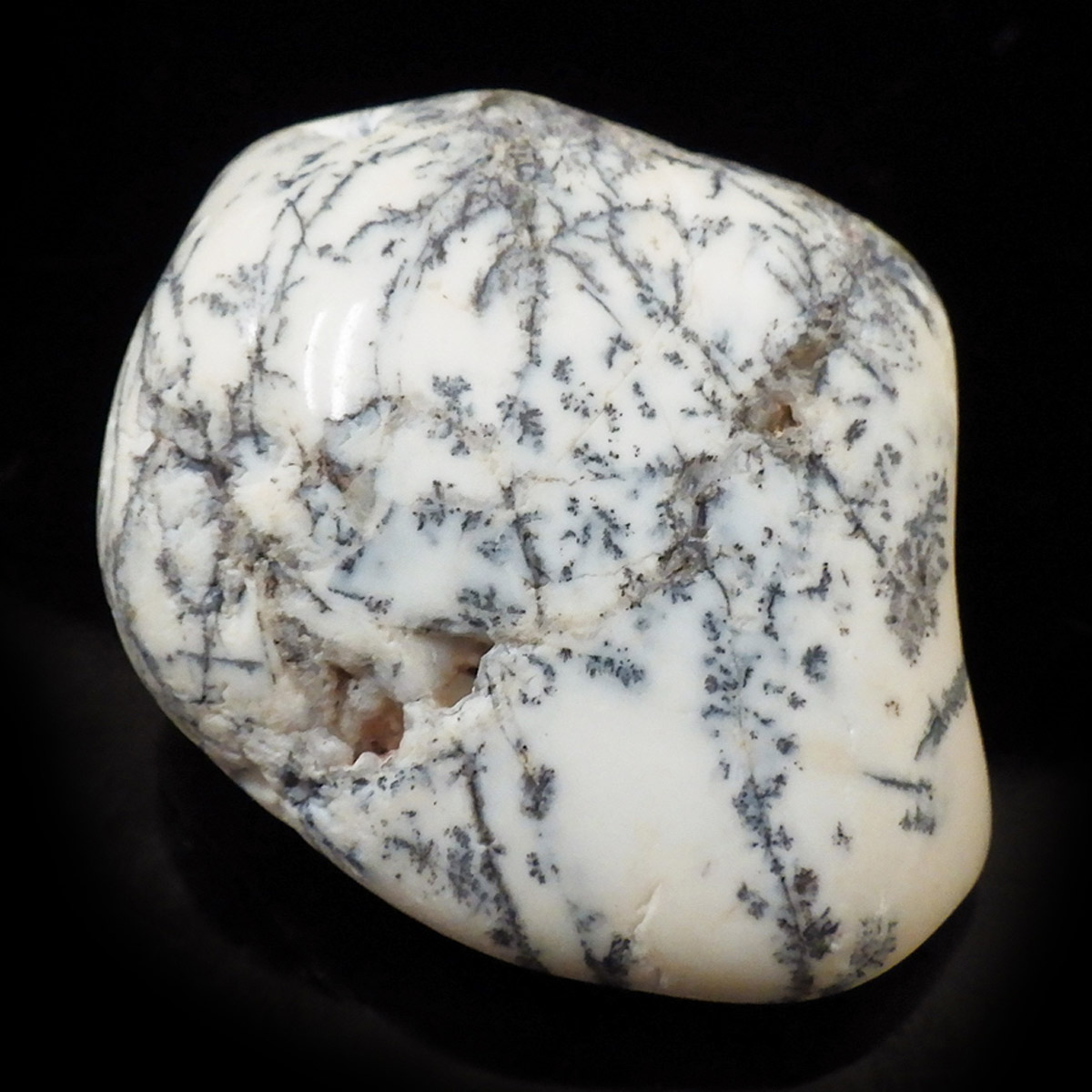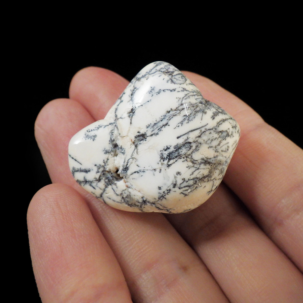 マダガスカル産のデンドリティックアゲート、タンブルです。デンドリティックアゲートはアゲートまたはクォーツ、オパール内に樹枝状のインクルージョンが見られるもののことです。まとめてデンドライトとも呼ばれます。酸化マンガンや酸化鉄が割れ目に侵入して模様ができたとされています。模様を付けたように見えますが、これが自然に生成されているので神秘的です。