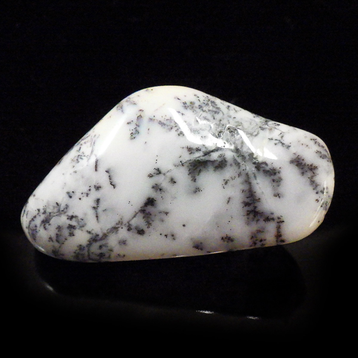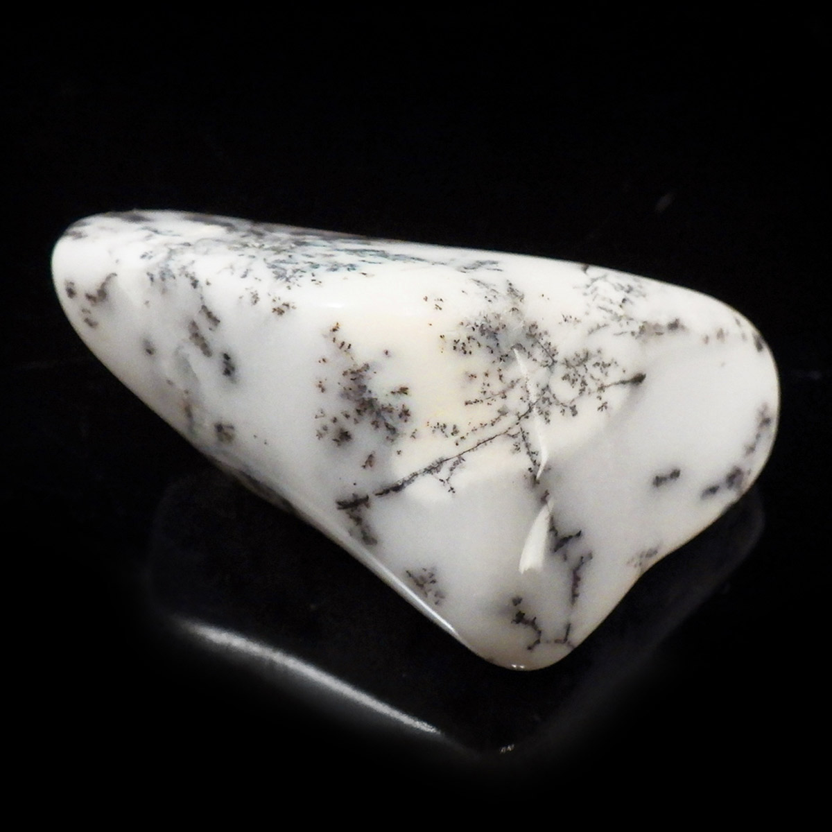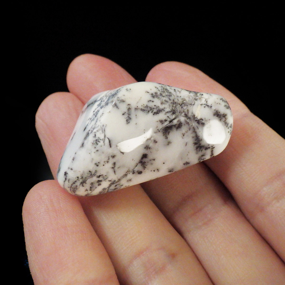 マダガスカル産のデンドリティックアゲート、タンブルです。デンドリティックアゲートはアゲートまたはクォーツ、オパール内に樹枝状のインクルージョンが見られるもののことです。まとめてデンドライトとも呼ばれます。酸化マンガンや酸化鉄が割れ目に侵入して模様ができたとされています。模様を付けたように見えますが、これが自然に生成されているので神秘的です。