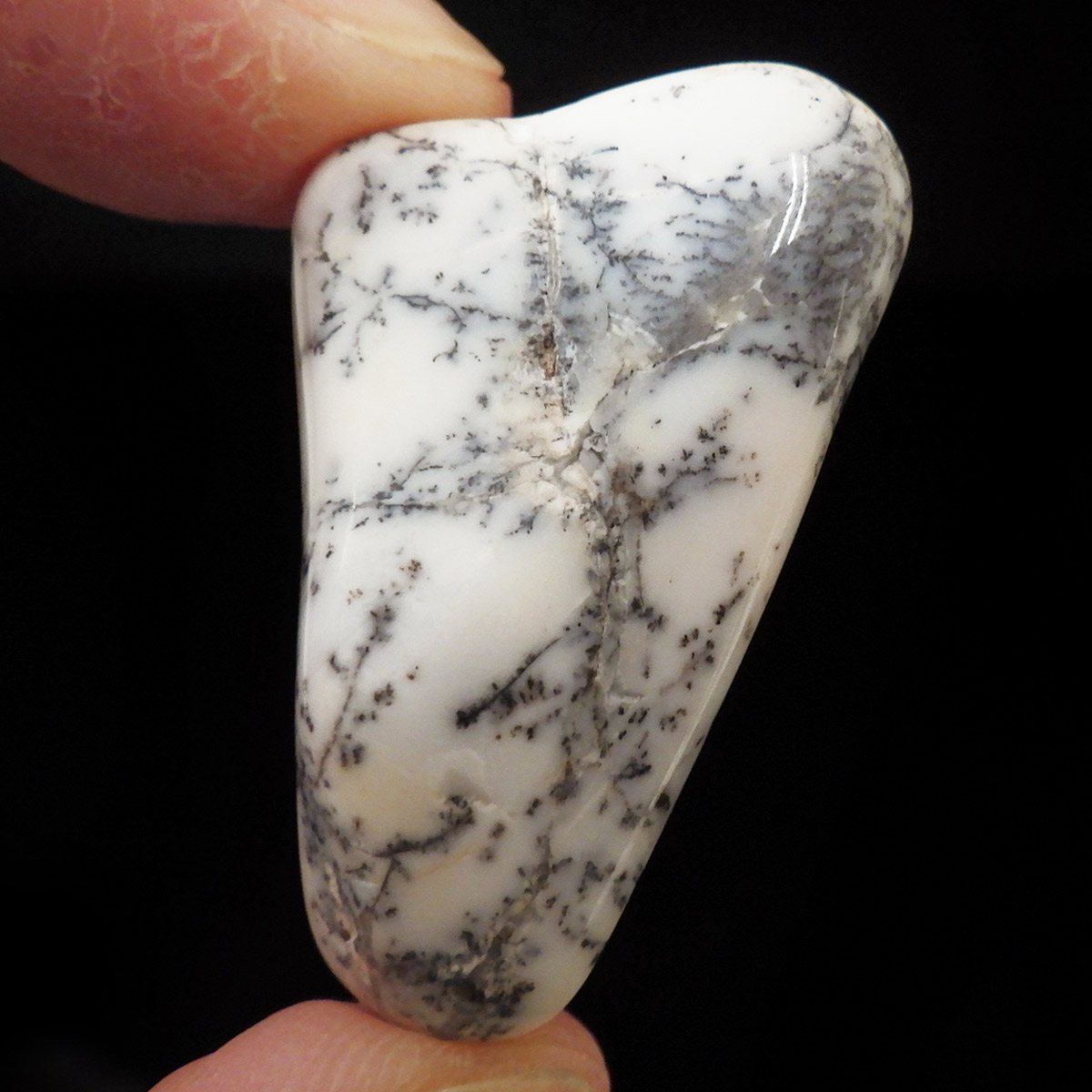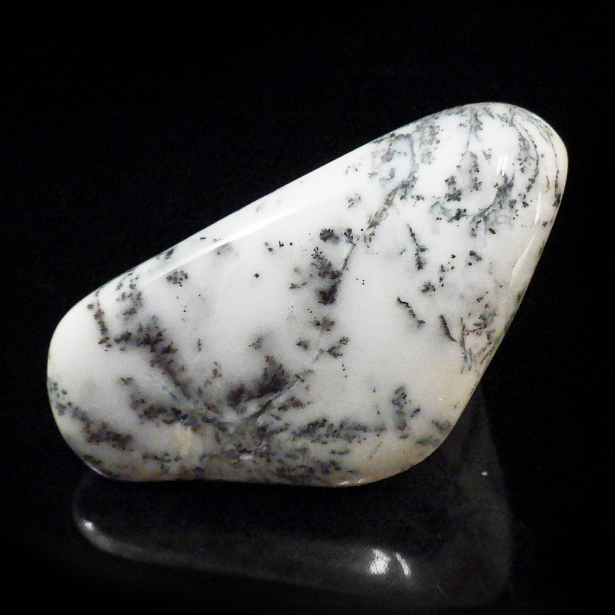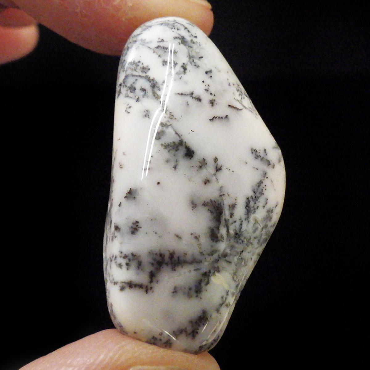 マダガスカル産のデンドリティックアゲート、タンブルです。デンドリティックアゲートはアゲートまたはクォーツ、オパール内に樹枝状のインクルージョンが見られるもののことです。まとめてデンドライトとも呼ばれます。酸化マンガンや酸化鉄が割れ目に侵入して模様ができたとされています。模様を付けたように見えますが、これが自然に生成されているので神秘的です。