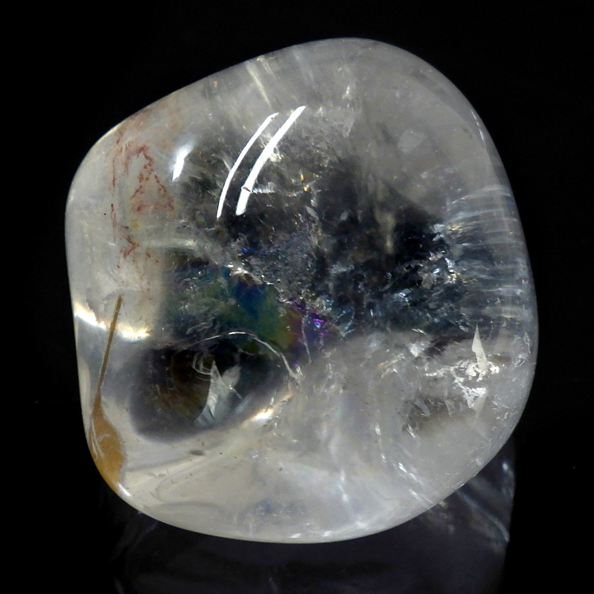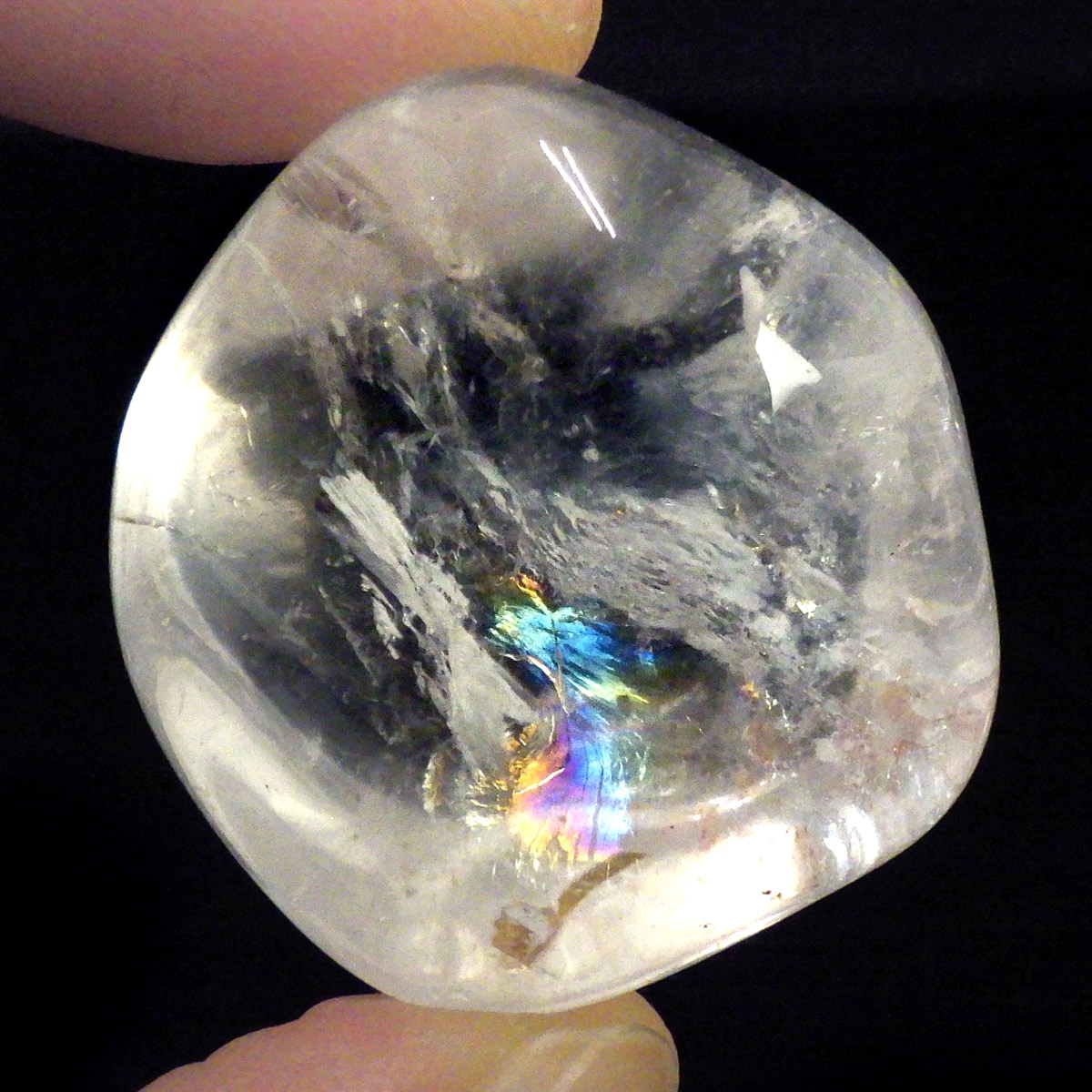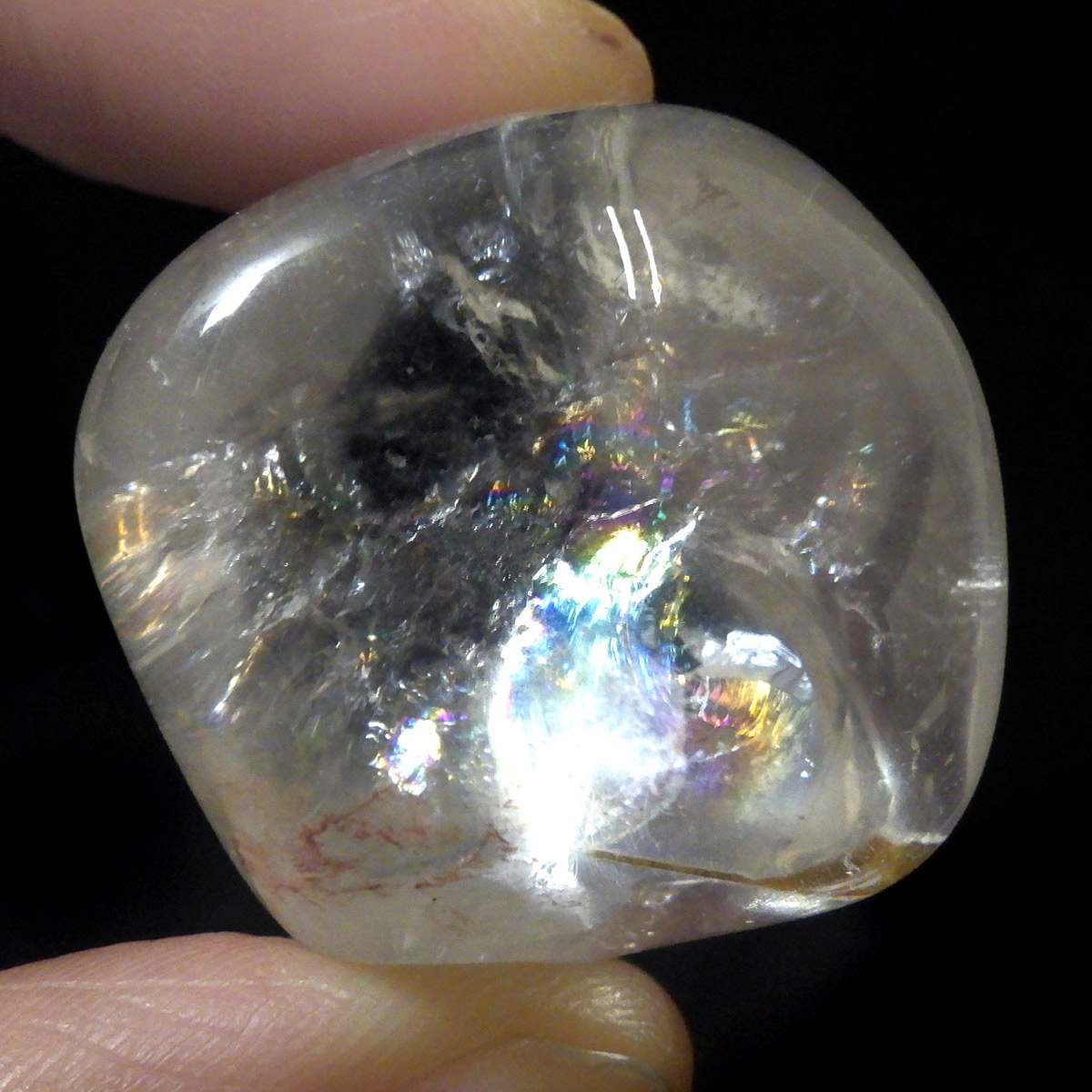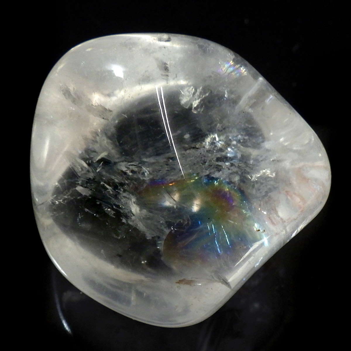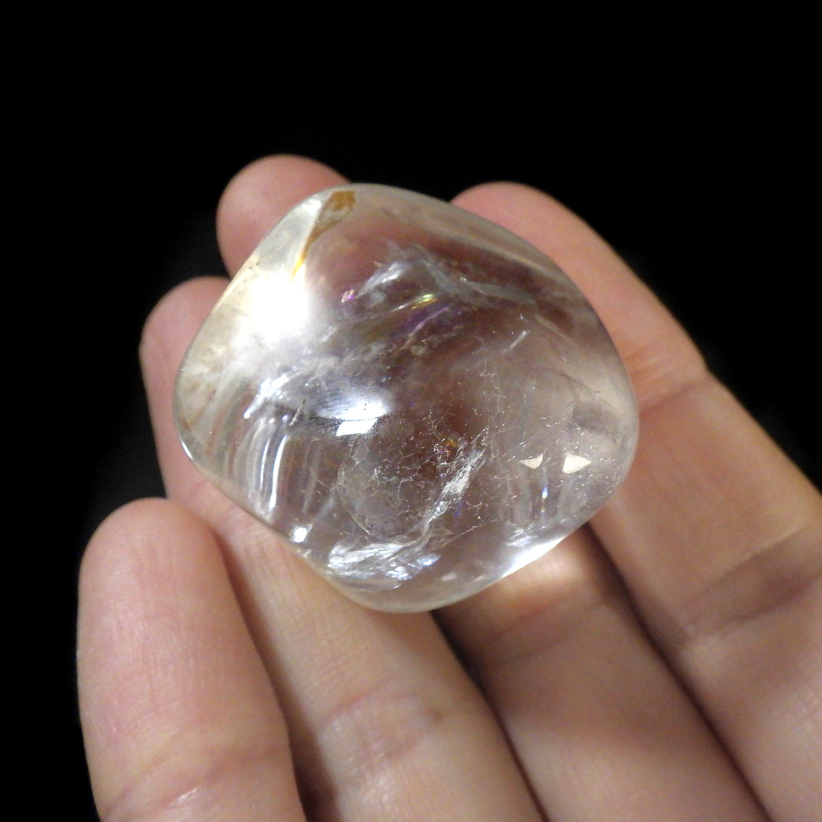 ブラジル産レインボークォーツ(アイリスクォーツ)、タンブルです。 和名は虹入り水晶です。 透明度が高く、大きさもあるタンブルで、しっかりとレインボーが入っています。
