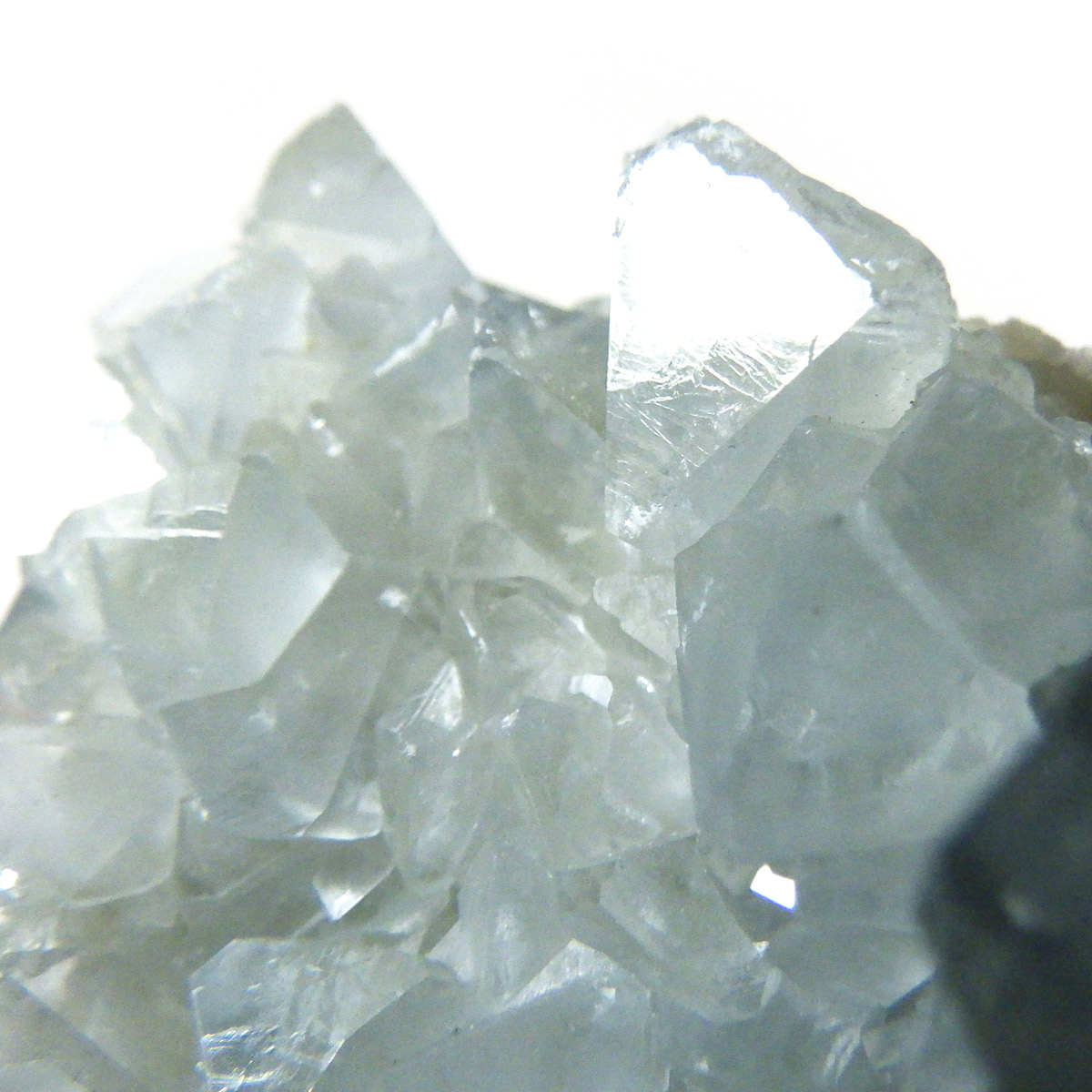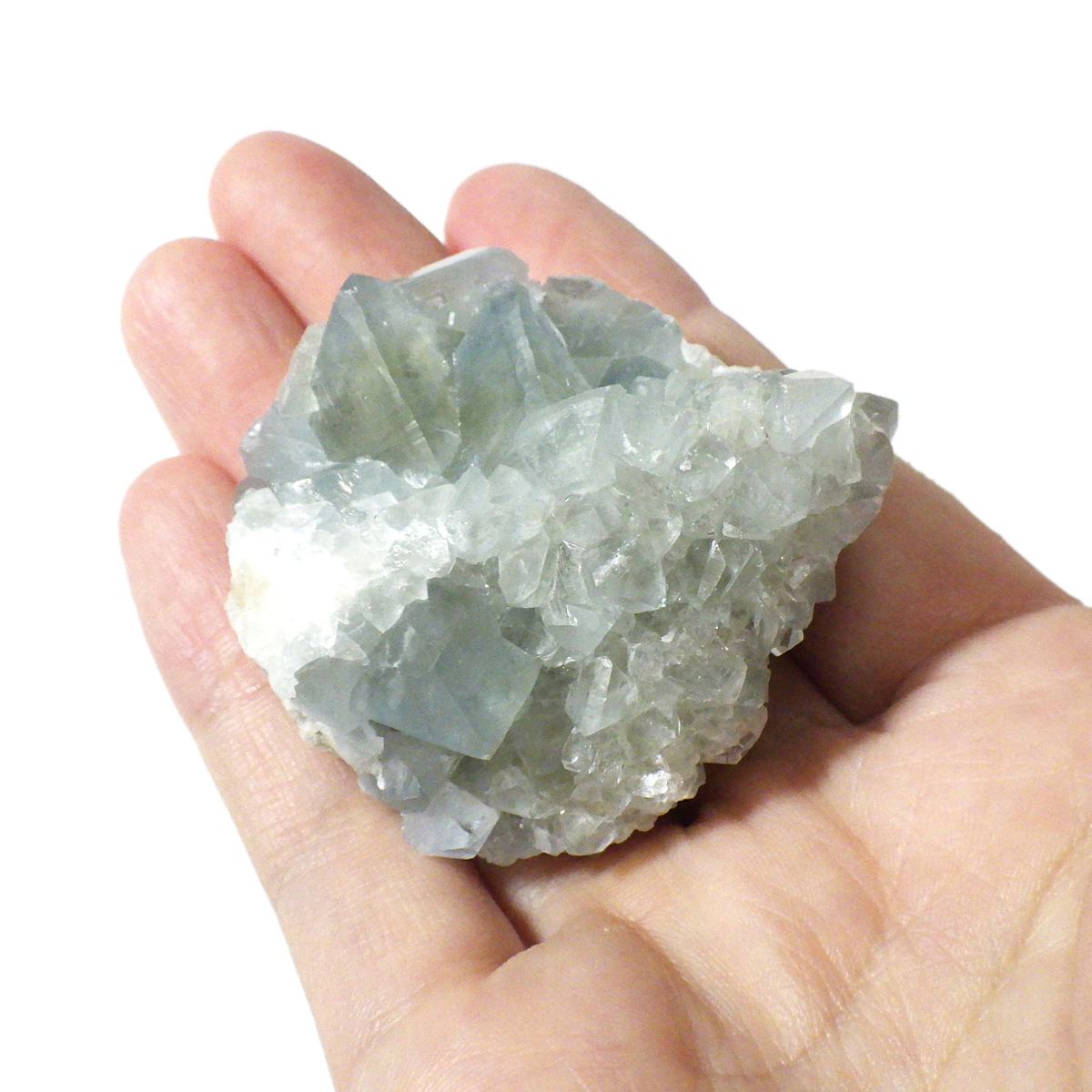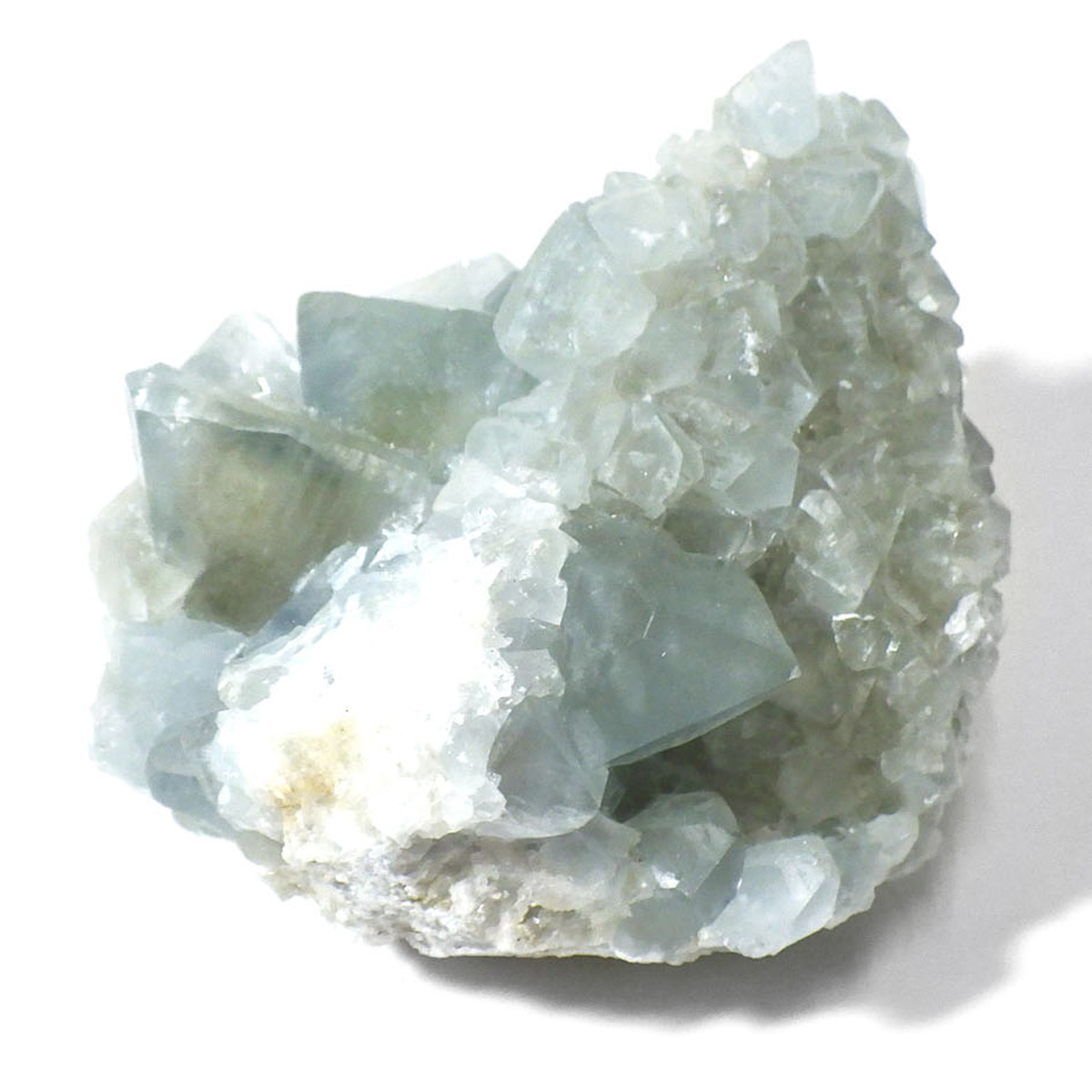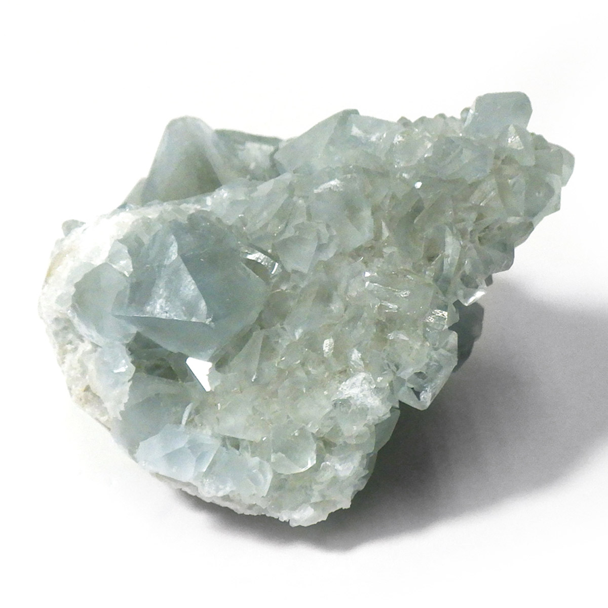 セレスタイト(天青石)母岩付きクラスターです。マダガスカル産のものは、母岩が丸みを帯びており、土台が白っぽいのが特徴です。 丸みを帯びた可愛いフォルムで、透明感ある濃いブルーの結晶は非常に魅力的です。裏表面、どちらも結晶が育っていて見応えのある一点です。