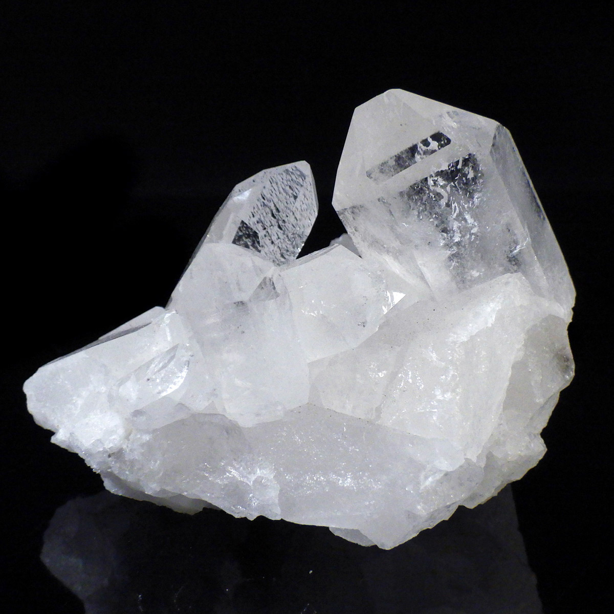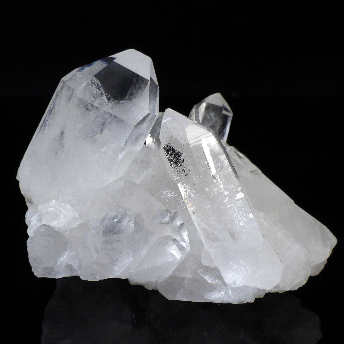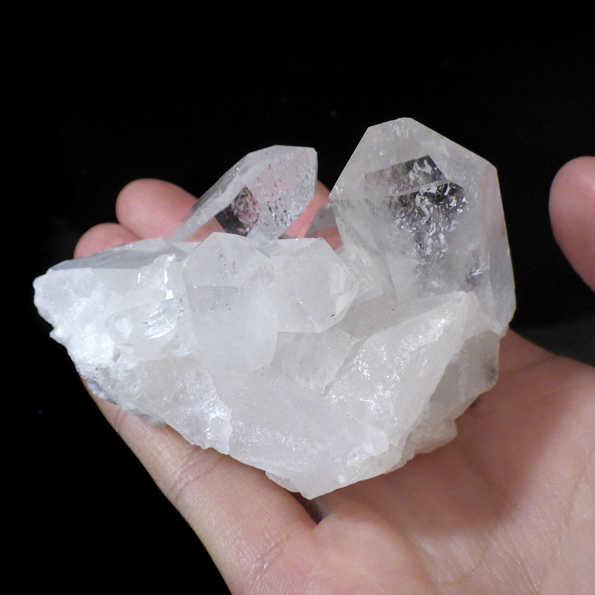 ブラジル トマスゴンサガ産 の水晶クラスターです。トマスゴンサガ産の水晶の特徴は、照りと艶。 光沢が強いため、驚くほどキラキラとしています。 また、水晶柱が放射線状に伸びて立体的な構造を作っているものが多く、「これぞ、水晶クラスター」という形状をしています。 非常に透明度の高い大小様々な結晶が複雑に絡み合い、見る角度によって様々な表情を見せる大変美しいクラスターです。