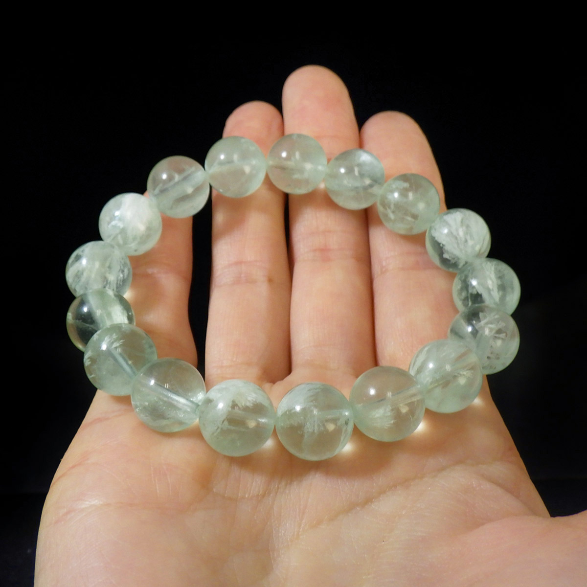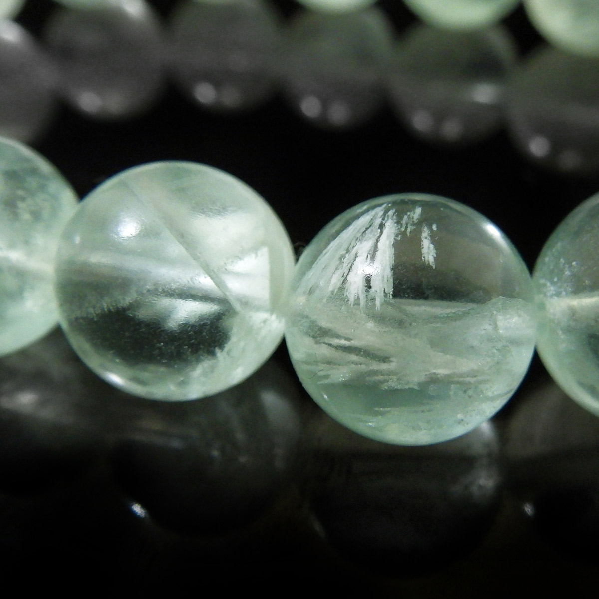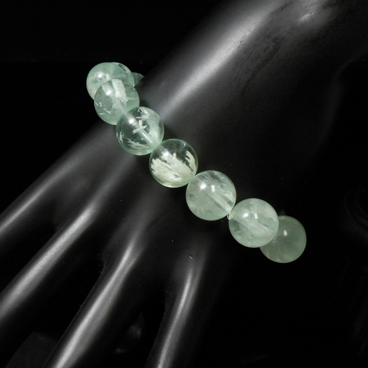チャイナ産エンジェルフェザーフローライト、ブレスレットです。大変透明度が高く、フェザー状の白い内包物をしっかりと確認できます。白く柔らかなフェザーは天使のパワーが宿るとされています。天使の羽根と呼ばれる美しいフェザーを、光に透かすと幻想的な景色を楽しめます。流通量が少ない希少な一点です。
