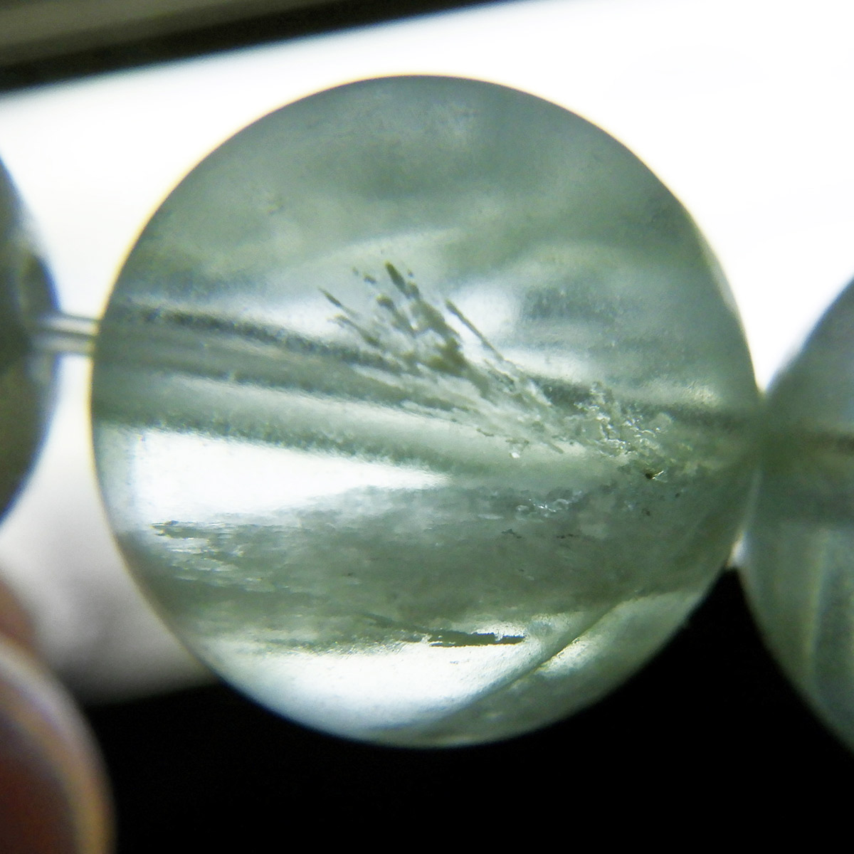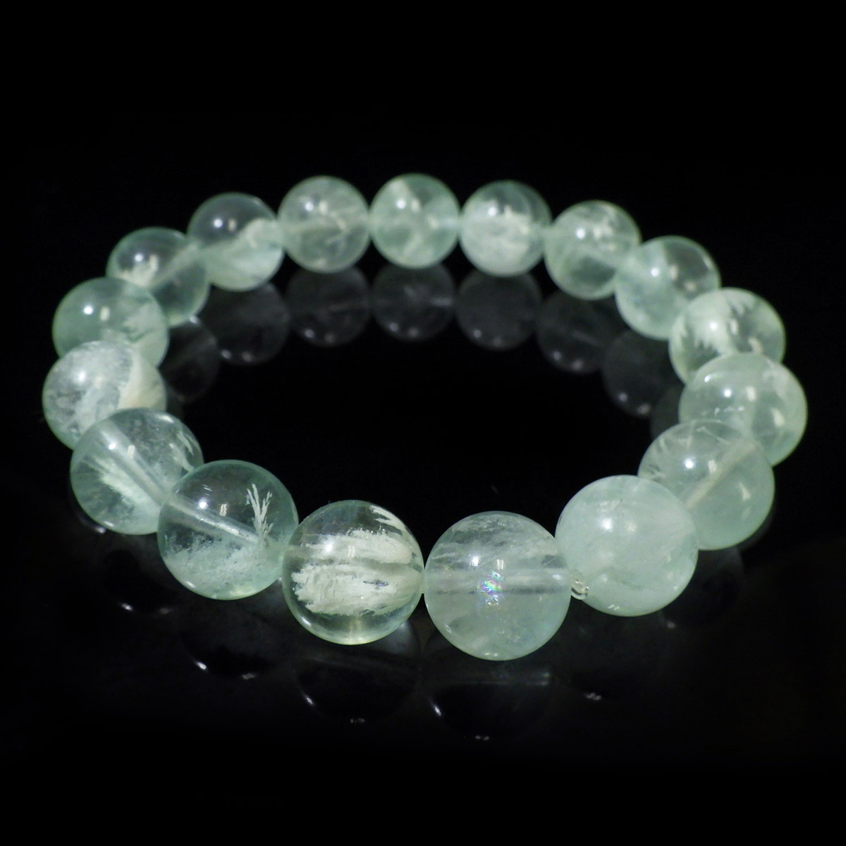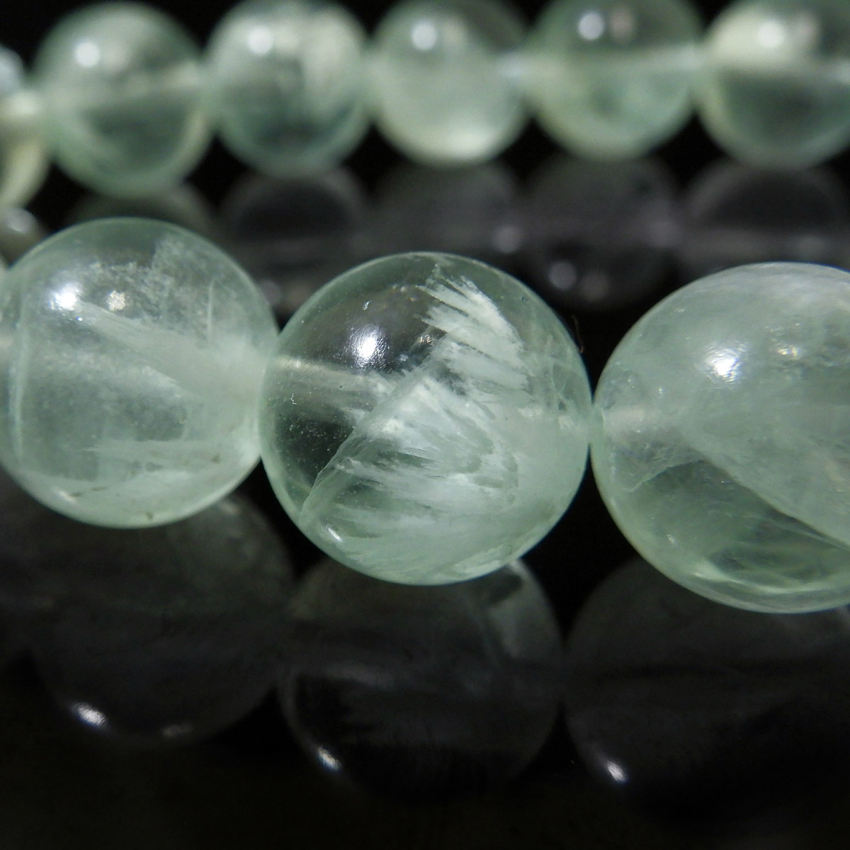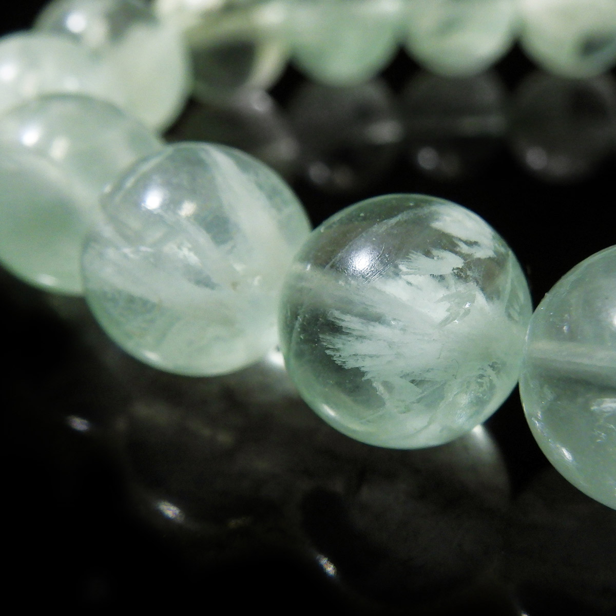 チャイナ産エンジェルフェザーフローライト、ブレスレットです。大変透明度が高く、フェザー状の白い内包物をしっかりと確認できます。白く柔らかなフェザーは天使のパワーが宿るとされています。天使の羽根と呼ばれる美しいフェザーを、光に透かすと幻想的な景色を楽しめます。流通量が少ない希少な一点です。