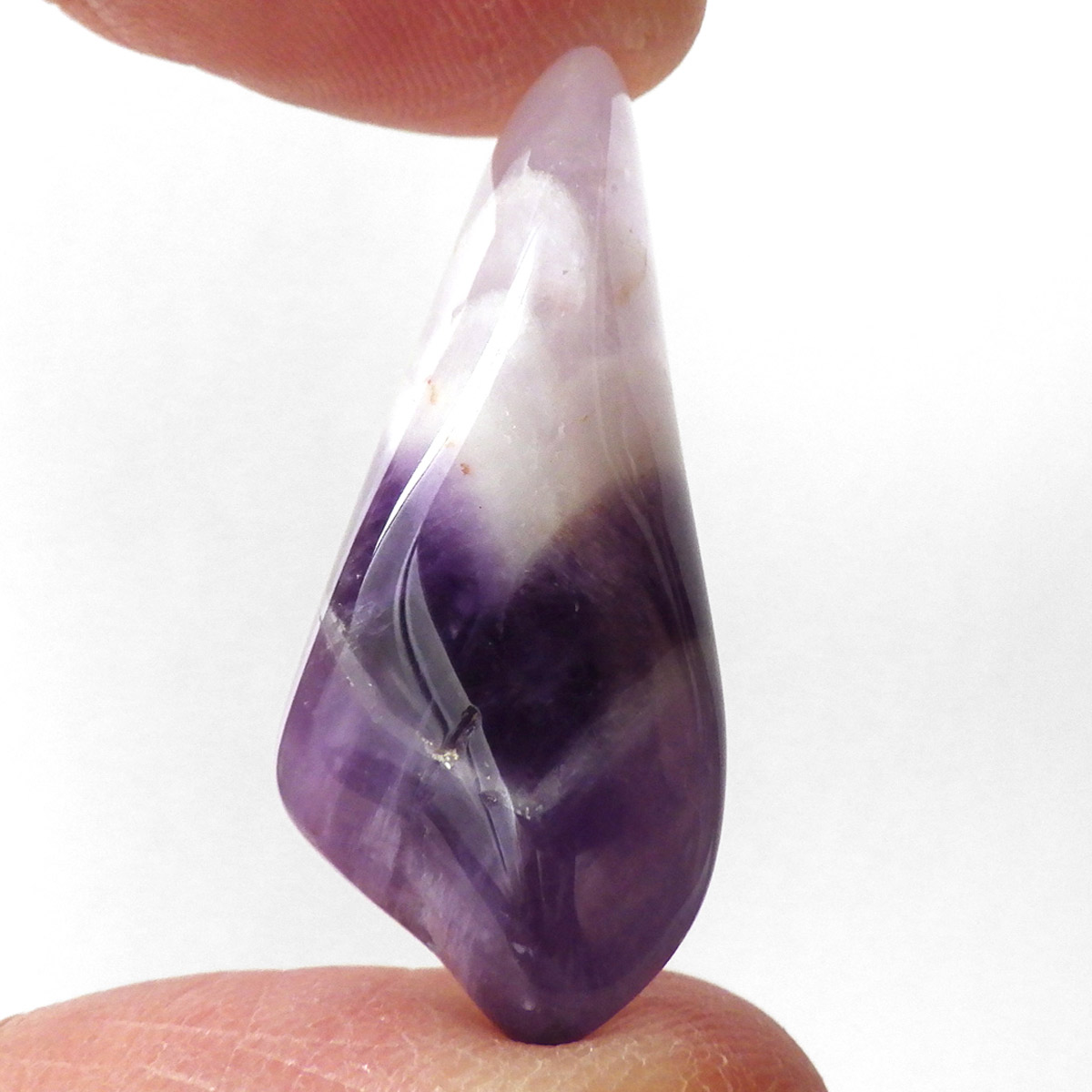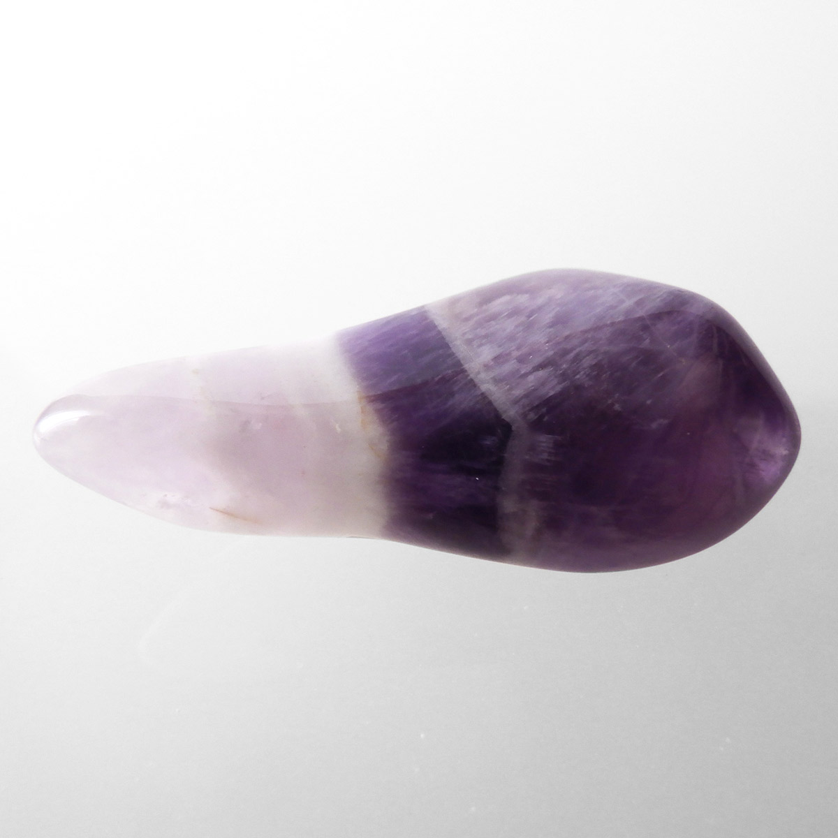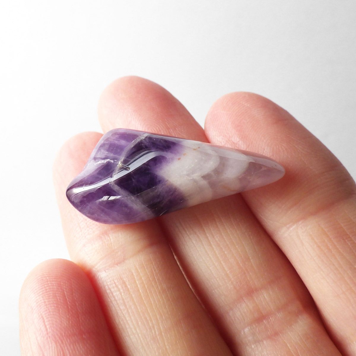 ブラジル産、シェブロンアメジストのタンブルです。 シェブロンとは、層状の紋章模様がギザギザと山形に見えることから、山を意味する言葉です。 シェブロンアメジストは、濃淡のある紫色のアメジストと、細い線状の白色をした石英が交互に重なりながら層状に成長し、このような模様が形成されているのです。ヒーリングの世界でも、大変すぐれた物とされて重宝されているそうです。濃い紫とくっきりとした白い紋章模様のラインが美しい品質の良い一点です。