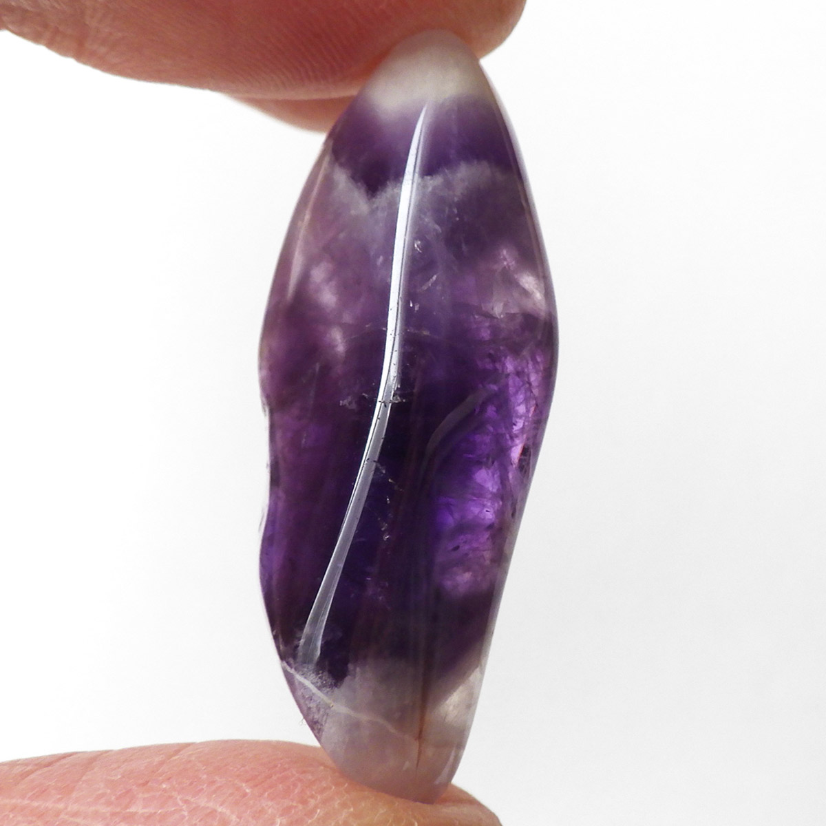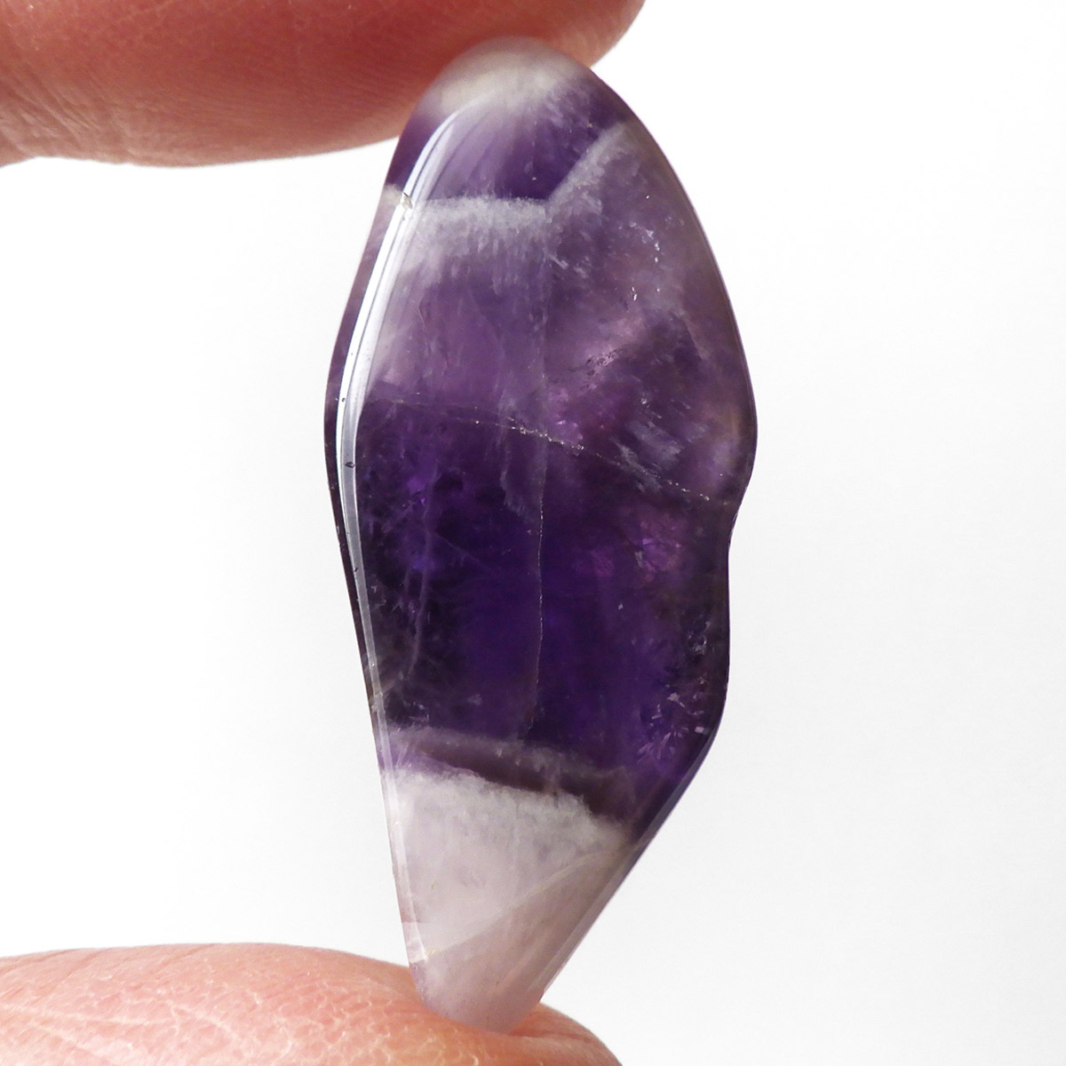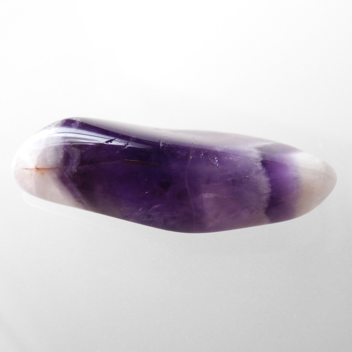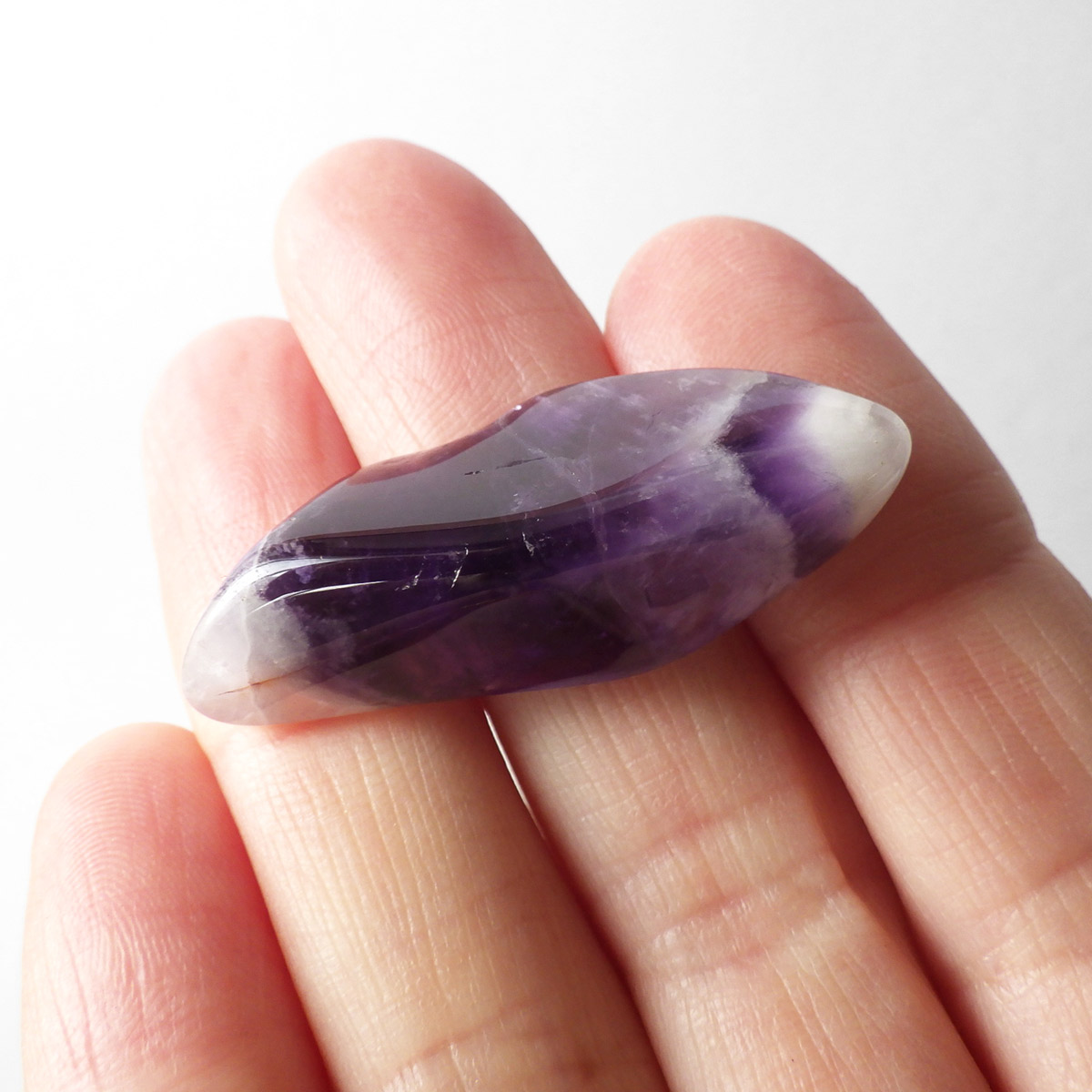 ブラジル産、シェブロンアメジストのタンブルです。 シェブロンとは、層状の紋章模様がギザギザと山形に見えることから、山を意味する言葉です。 シェブロンアメジストは、濃淡のある紫色のアメジストと、細い線状の白色をした石英が交互に重なりながら層状に成長し、このような模様が形成されているのです。ヒーリングの世界でも、大変すぐれた物とされて重宝されているそうです。濃い紫とくっきりとした白い紋章模様のラインが美しい品質の良い一点です。