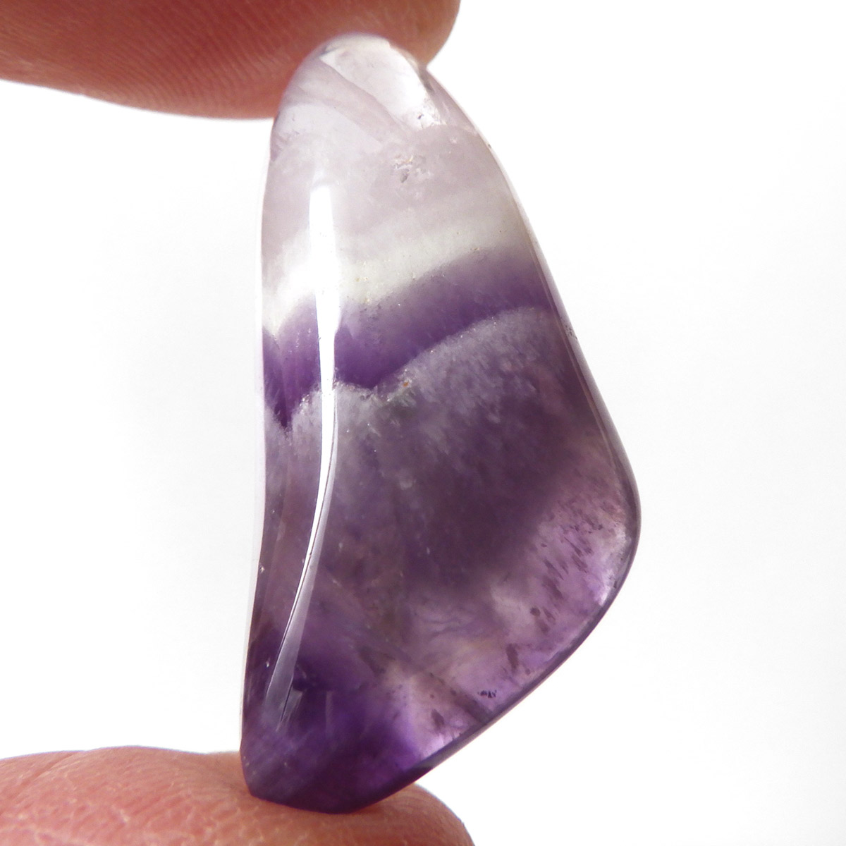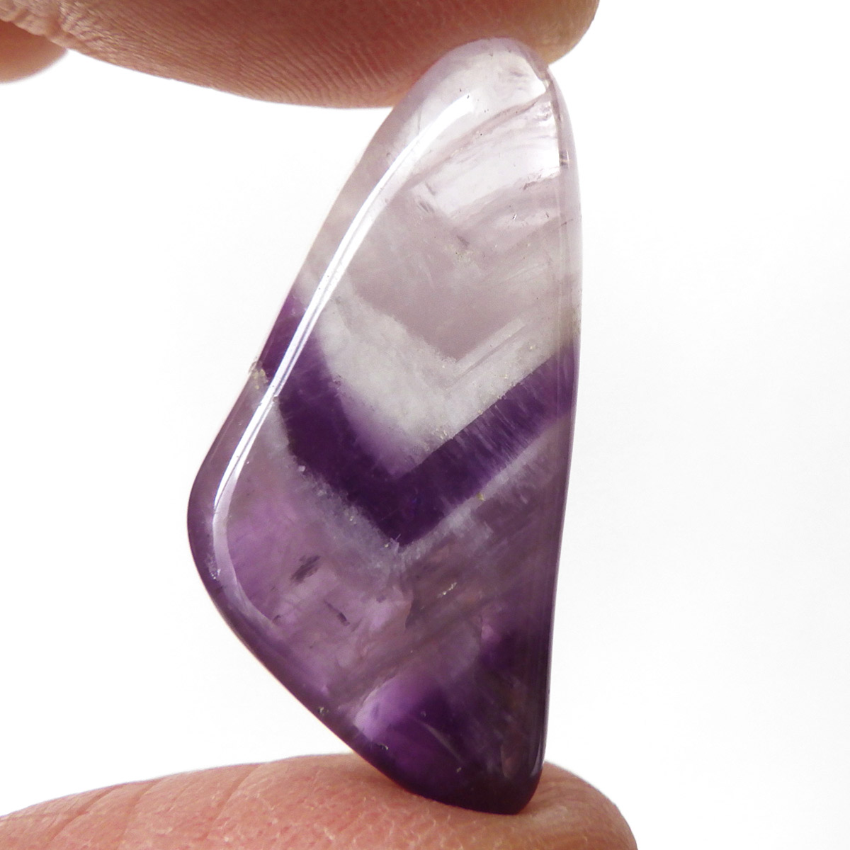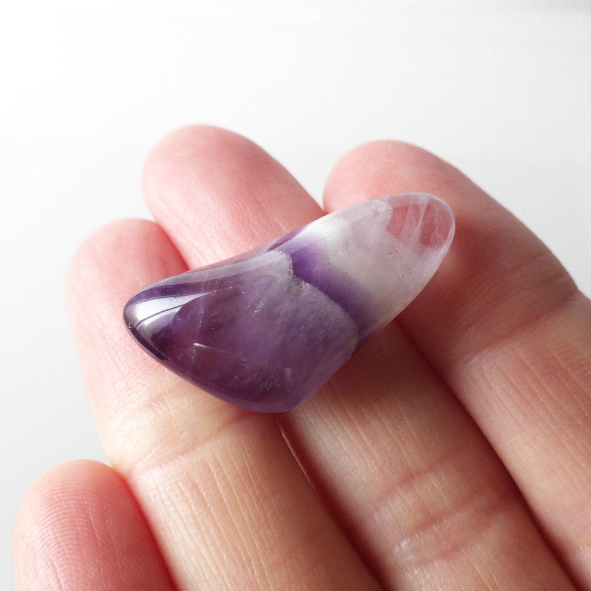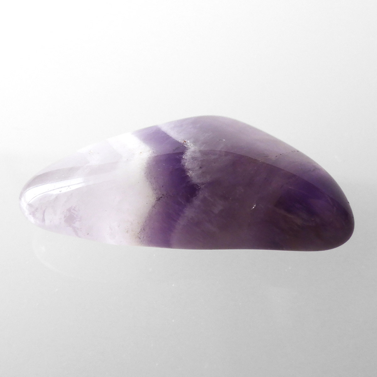 ブラジル産、シェブロンアメジストのタンブルです。 シェブロンとは、層状の紋章模様がギザギザと山形に見えることから、山を意味する言葉です。 シェブロンアメジストは、濃淡のある紫色のアメジストと、細い線状の白色をした石英が交互に重なりながら層状に成長し、このような模様が形成されているのです。ヒーリングの世界でも、大変すぐれた物とされて重宝されているそうです。濃い紫とくっきりとした白い紋章模様のラインが美しい品質の良い一点です。