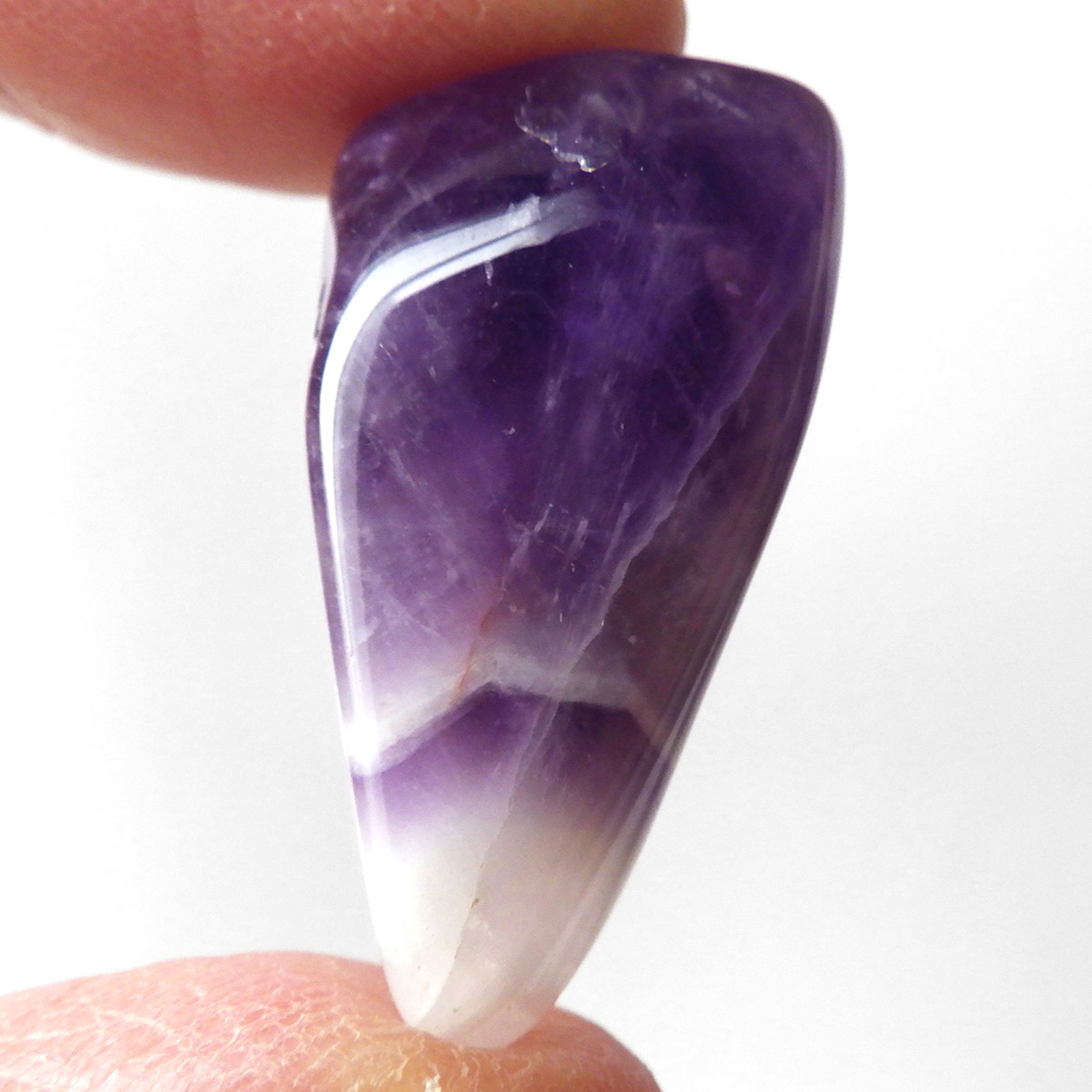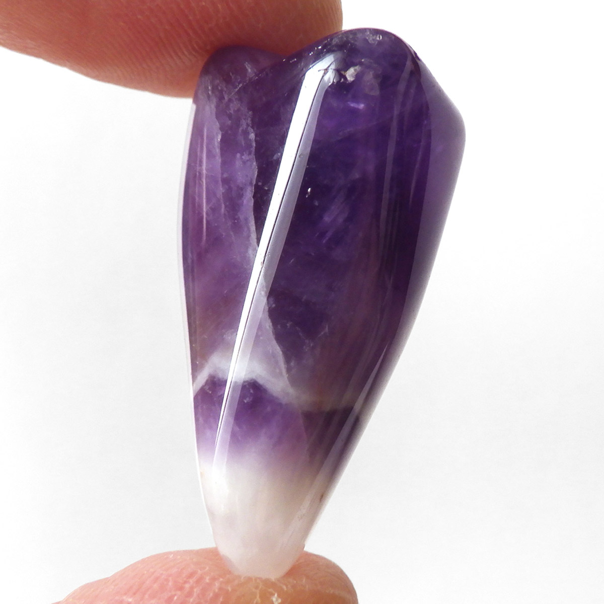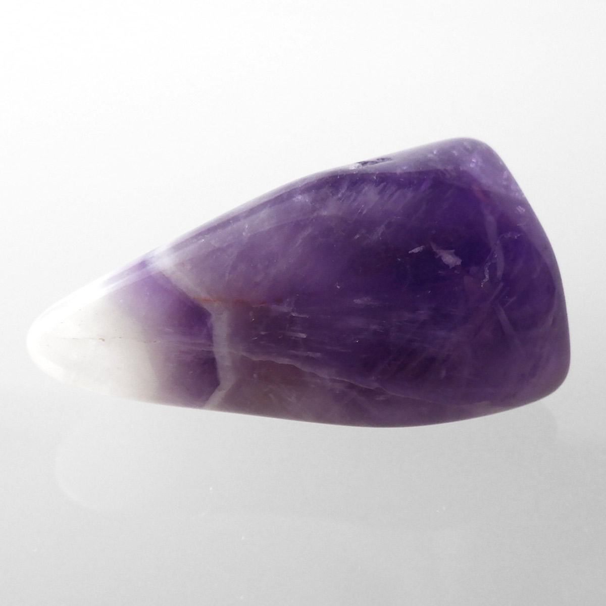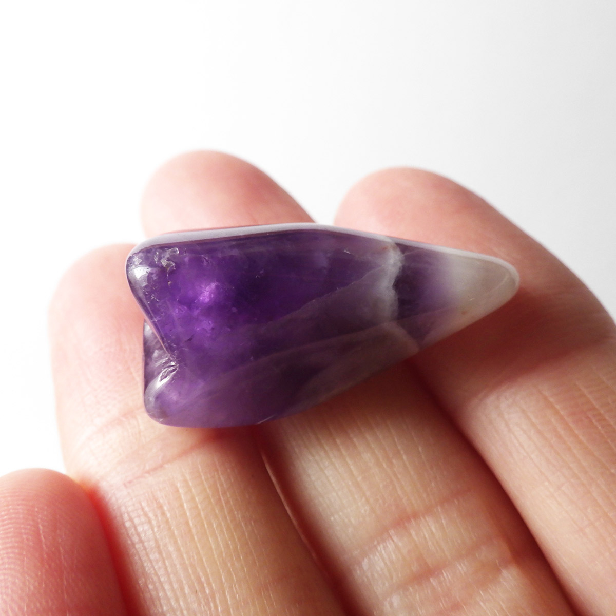 ブラジル産、シェブロンアメジストのタンブルです。 シェブロンとは、層状の紋章模様がギザギザと山形に見えることから、山を意味する言葉です。 シェブロンアメジストは、濃淡のある紫色のアメジストと、細い線状の白色をした石英が交互に重なりながら層状に成長し、このような模様が形成されているのです。ヒーリングの世界でも、大変すぐれた物とされて重宝されているそうです。濃い紫とくっきりとした白い紋章模様のラインが美しい品質の良い一点です。
