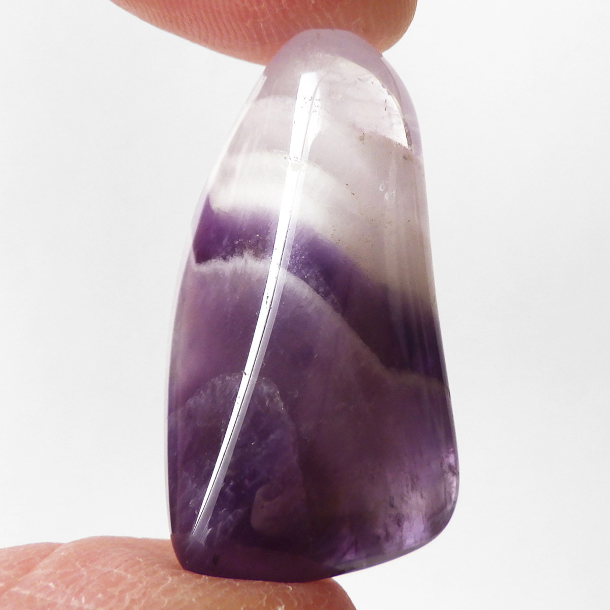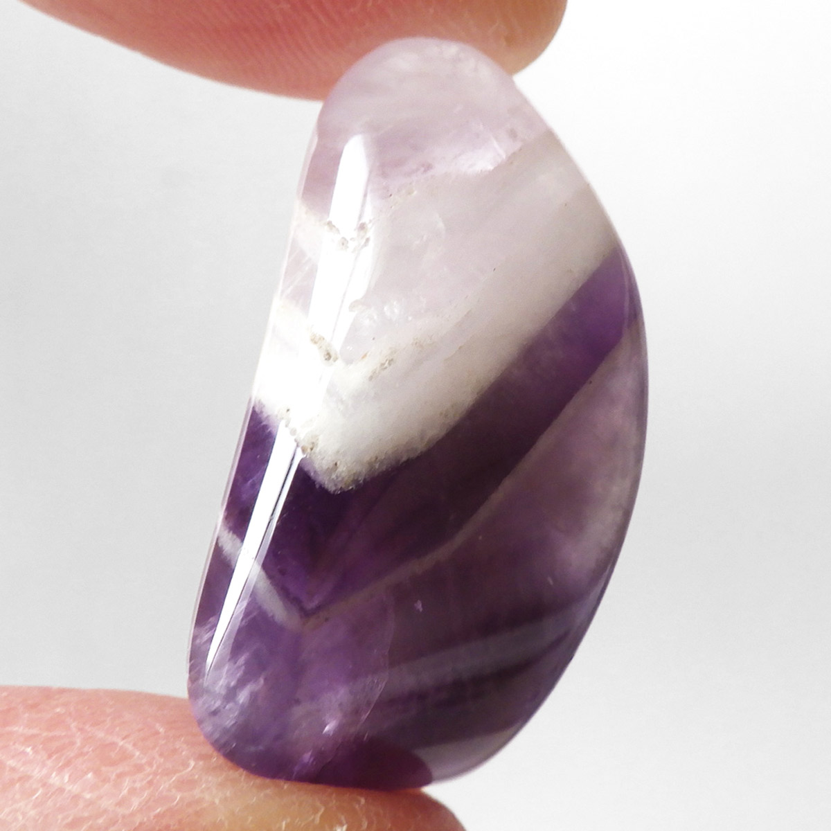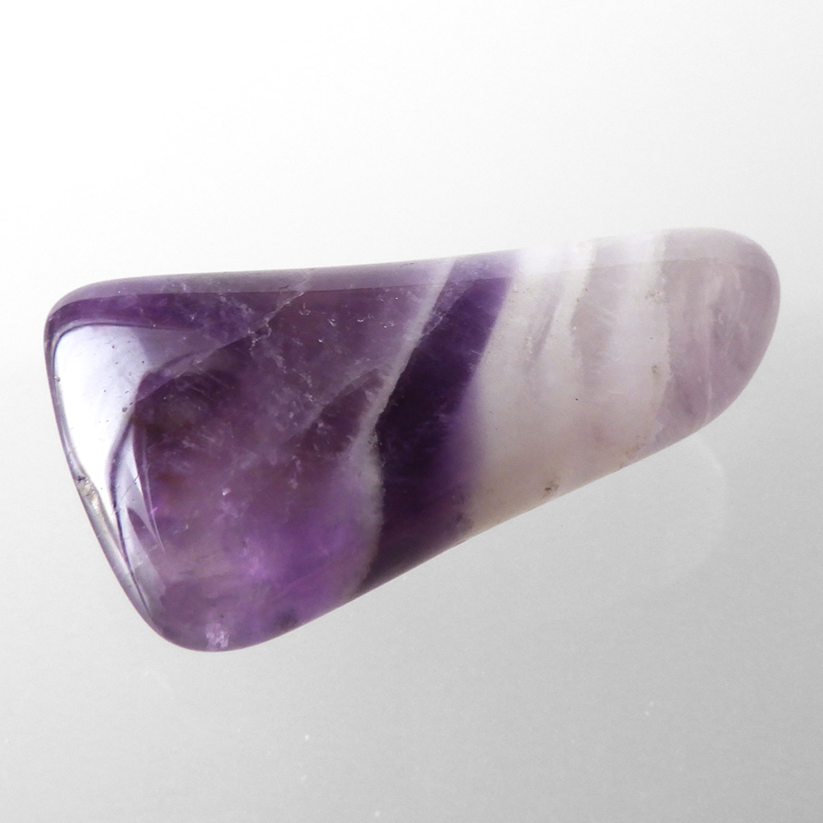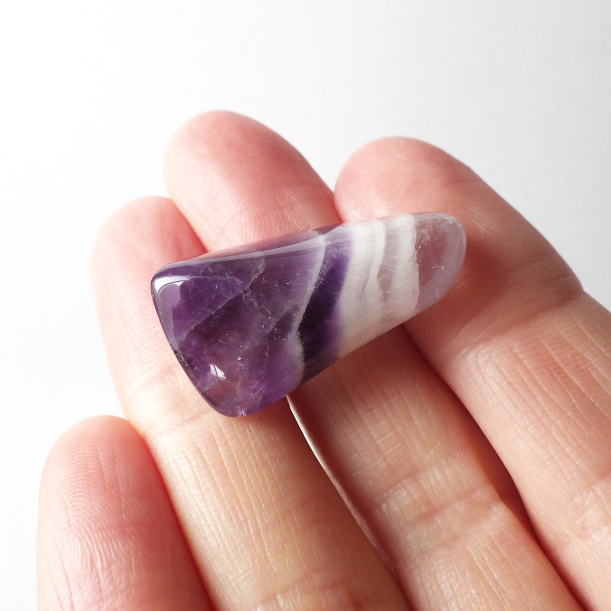 ブラジル産、シェブロンアメジストのタンブルです。 シェブロンとは、層状の紋章模様がギザギザと山形に見えることから、山を意味する言葉です。 シェブロンアメジストは、濃淡のある紫色のアメジストと、細い線状の白色をした石英が交互に重なりながら層状に成長し、このような模様が形成されているのです。ヒーリングの世界でも、大変すぐれた物とされて重宝されているそうです。濃い紫とくっきりとした白い紋章模様のラインが美しい品質の良い一点です。