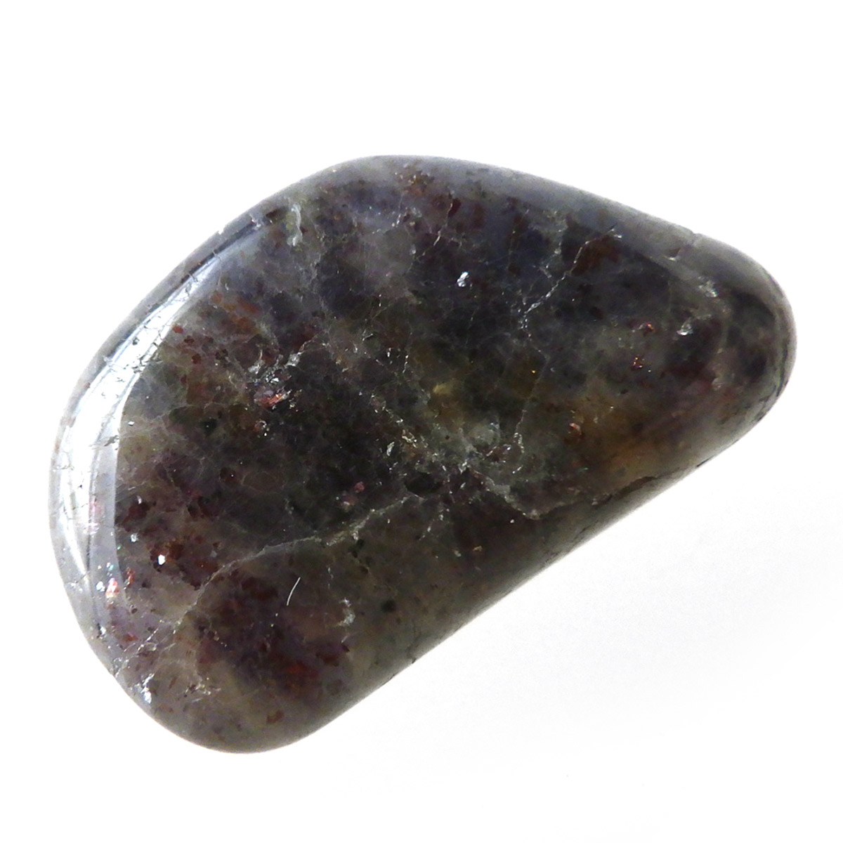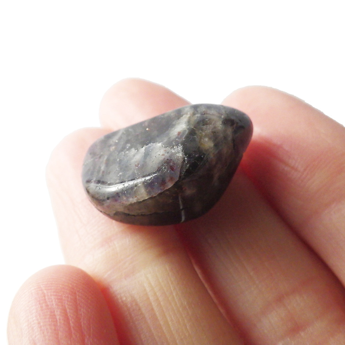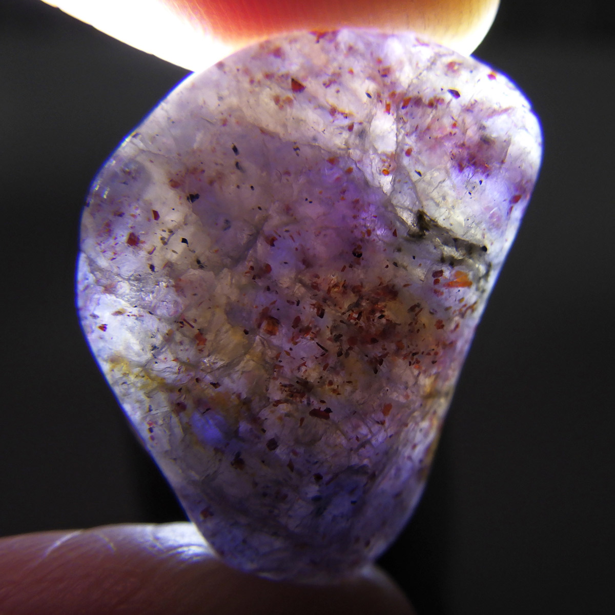 インド産のアイオライト、タンブルです。アイオライトは見る角度によって色が変化するという神秘的な鉱石です。広域変成岩や接触変成岩などで発見されるケイ酸塩鉱物の一種で、多色性が強く、見る角度によって群青色から淡い枯れ草色に変化します。透明度こそ高くはありませんが、光に透かすとブラッドショットと呼ばれる赤い斑点が見られるブラッドショットアイオライトとも呼ばれています。またサンストーンのようなキラキラとしたアベンチュレッセンスも見られます。