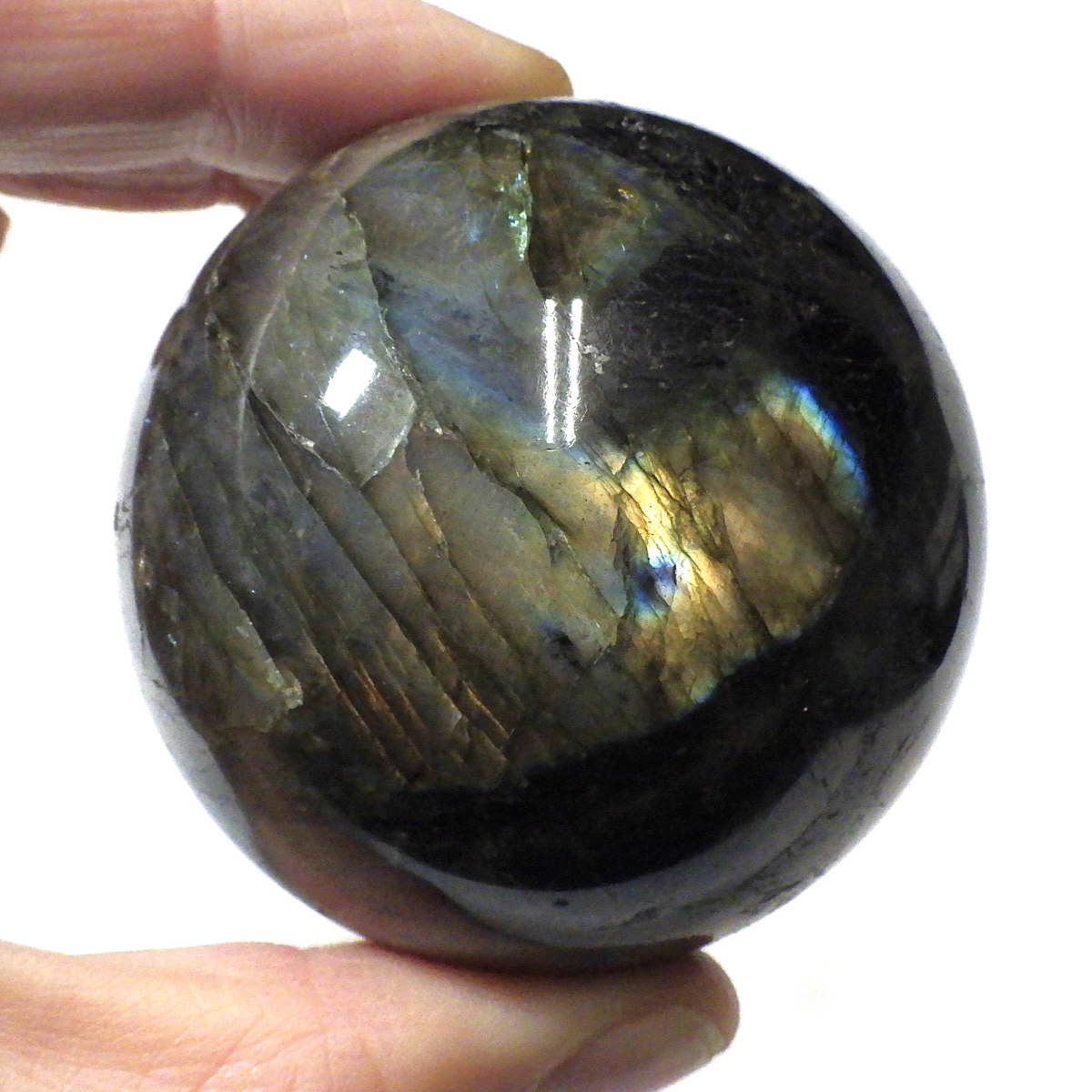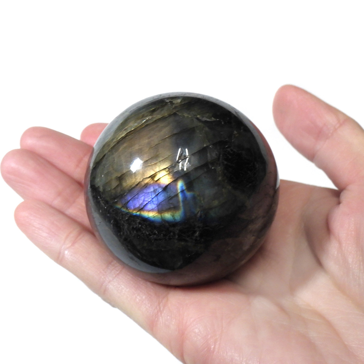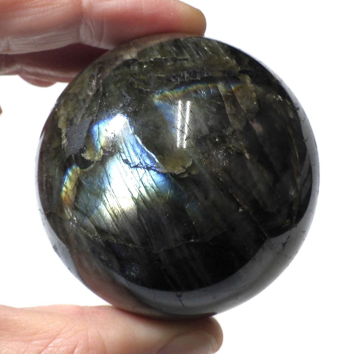 マダガスカル産のラブラドライト スフィアです。 見る角度によってオーロラのような色彩を変える美しい光を持つのが特徴です。 このラブラドライトは、石自体が濃いグレーからグリーンのような色合いで、そこに鮮やかな輝きが浮かび上がります。「アゲハ蝶の羽」に例えられる事もある美しい輝きです。