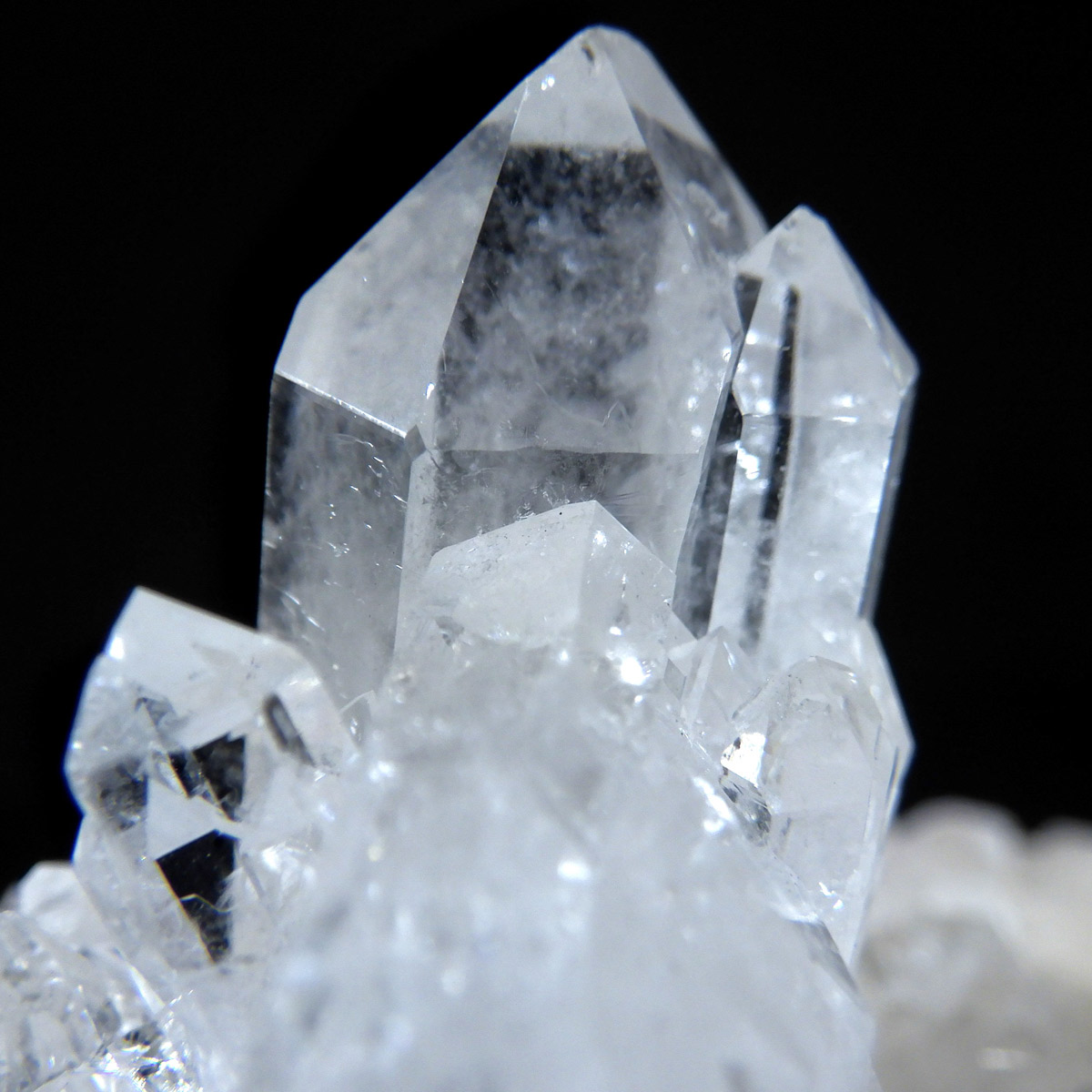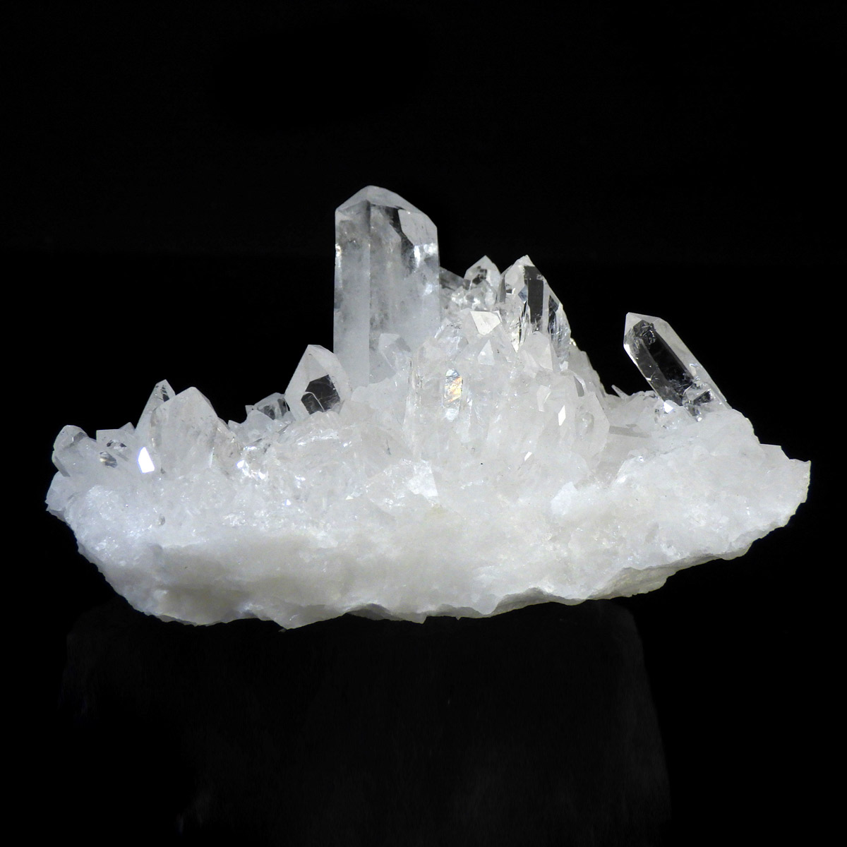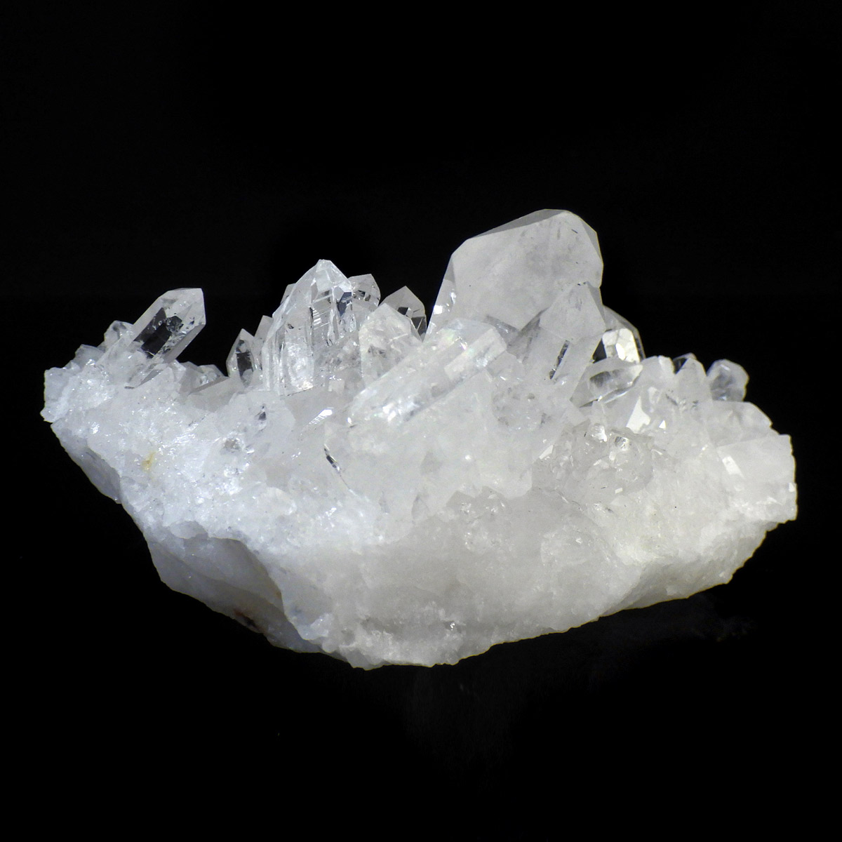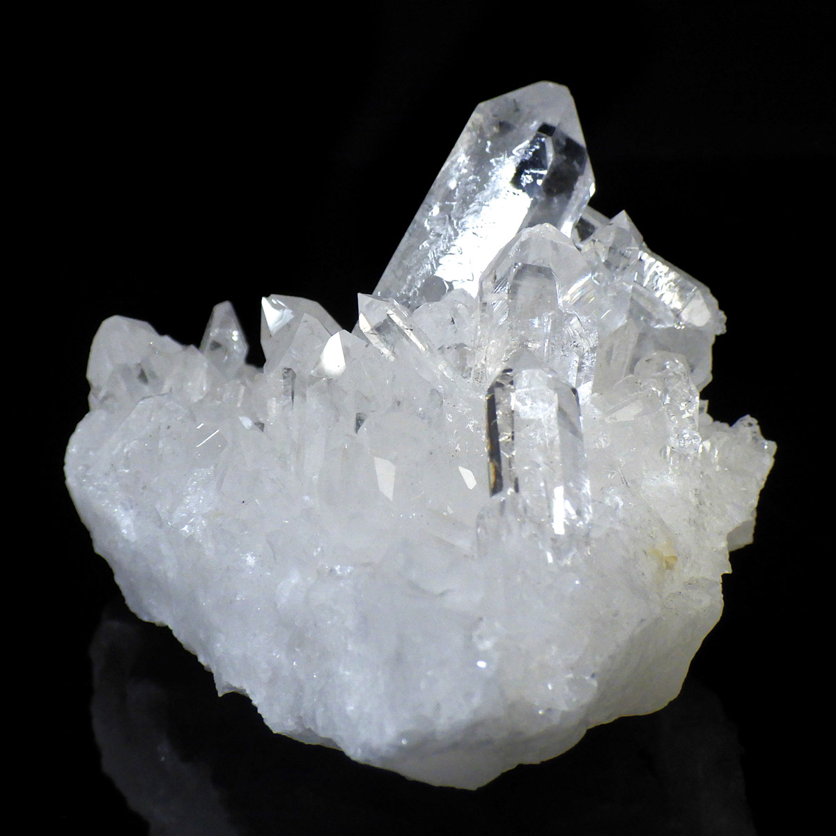 ブラジル トマスゴンサガ産 の水晶クラスターです。トマスゴンサガ産の水晶の特徴は、照りと艶。 光沢が強いため、驚くほどキラキラとしています。 また、水晶柱が放射線状に伸びて立体的な構造を作っているものが多く、「これぞ、水晶クラスター」という形状をしています。 非常に透明度の高い大小様々な結晶が複雑に絡み合い、見る角度によって様々な表情を見せる大変美しいクラスターです。