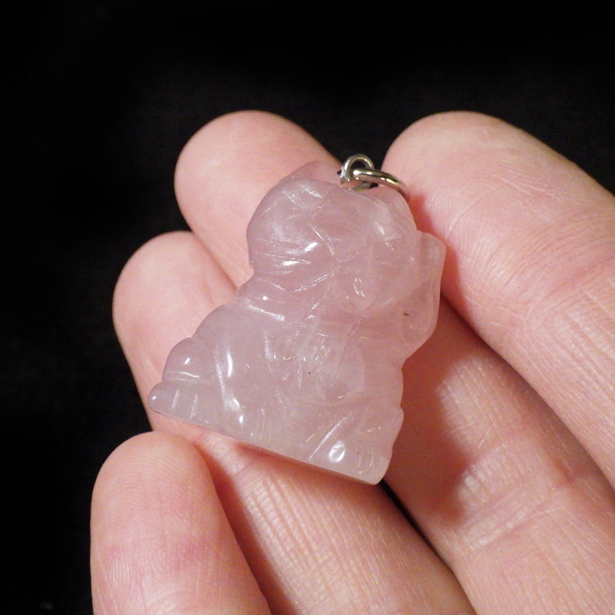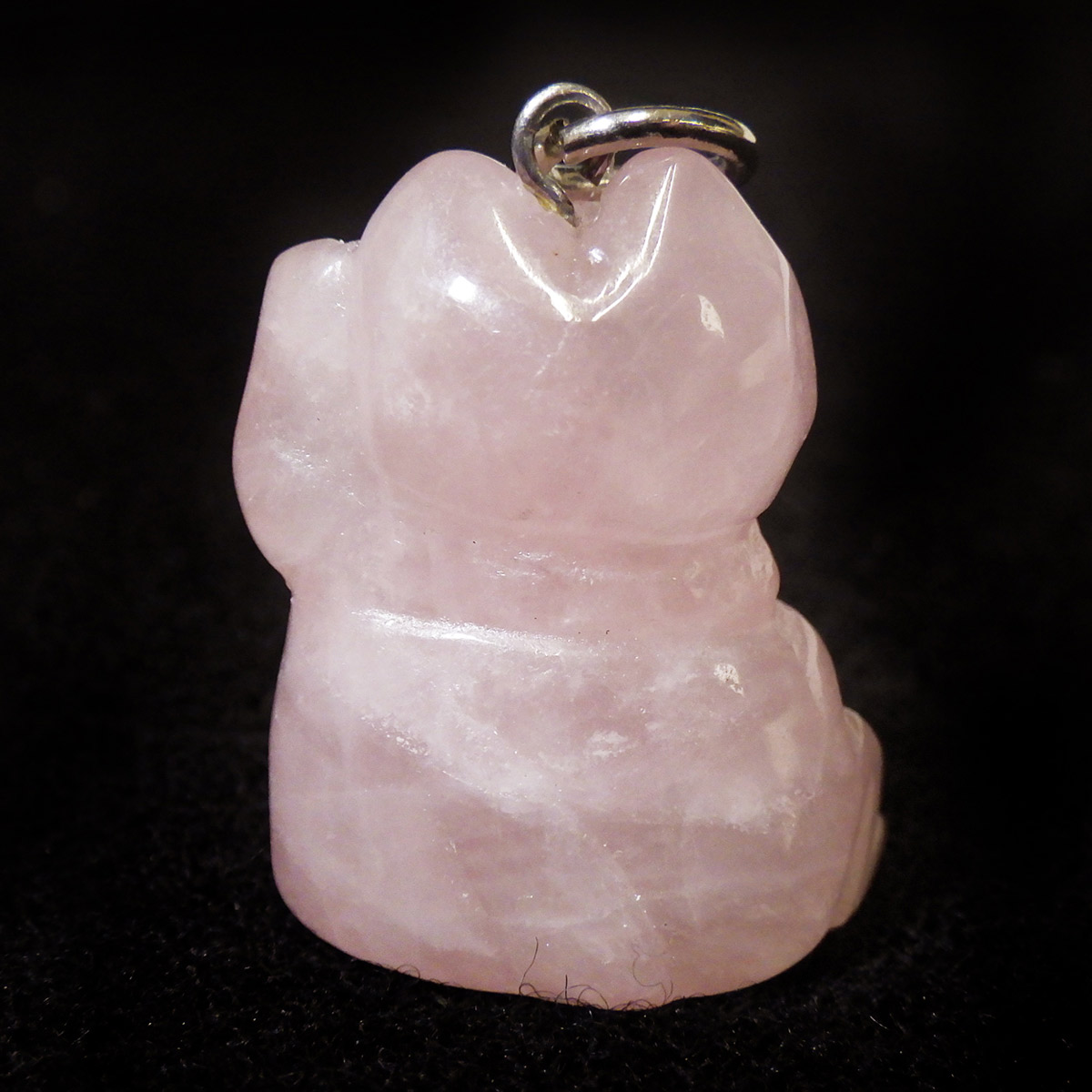 ローズクォーツの招き猫、チャームです。天然石から彫り出しております。招き猫は、良い運を引き寄せて、悪い運を払ってくれるといわれています。右手をあげているものはお金(財運)を招き寄せるとされています。ストラップやキーホルダーなど金具を付けてご使用ください。