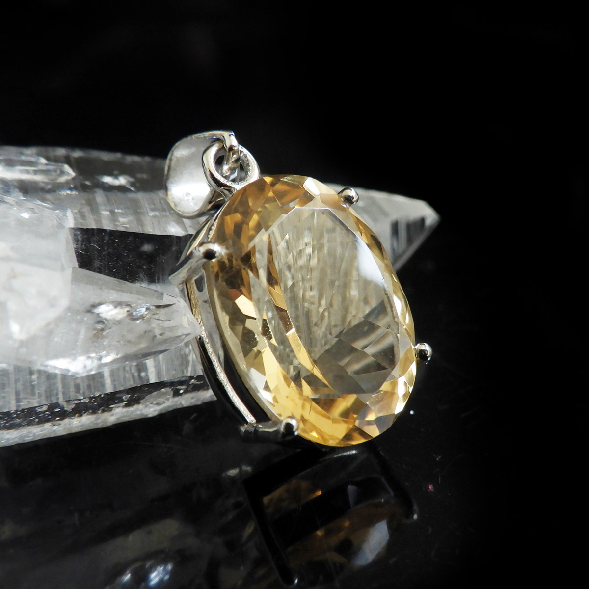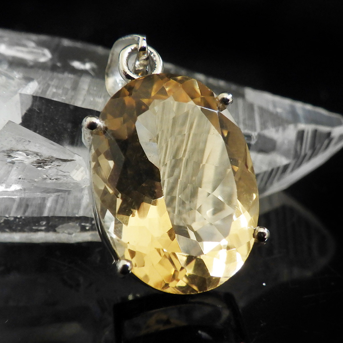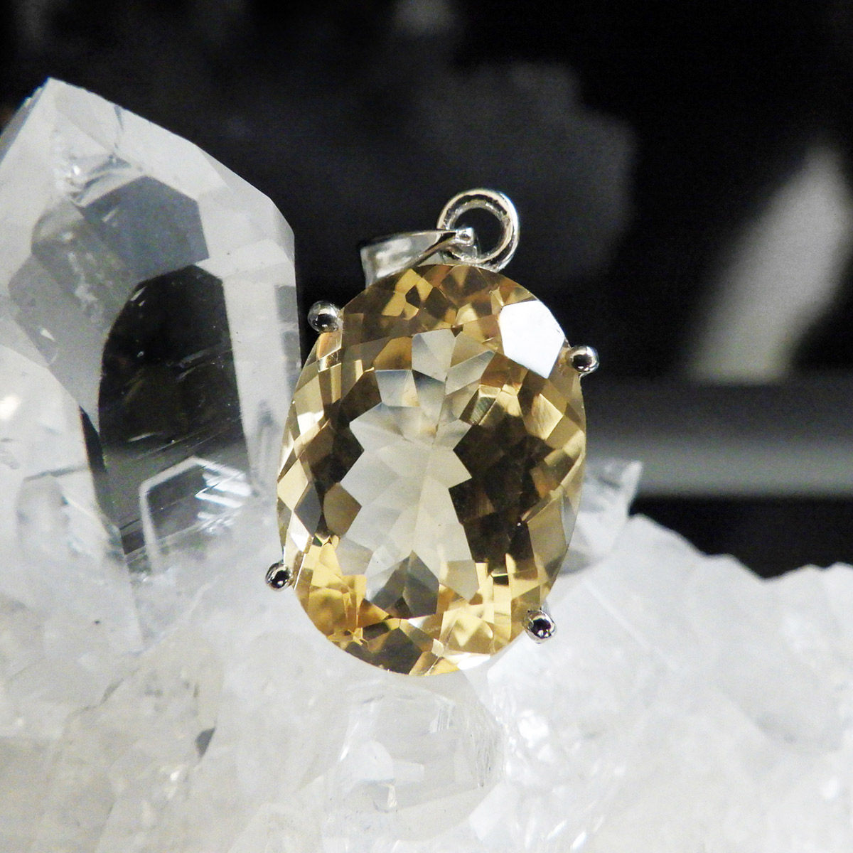 ブラジル産オーバルファセットカットのシトリンペンダントトップです。 宝石質で透明度が高く、発色も素晴らしく、自然な癒されるイエローの良質なシトリンです。オーバルファセットカットとは、楕円形の多面体カットのことで、シトリンの美しさを最大限に引き出しています。