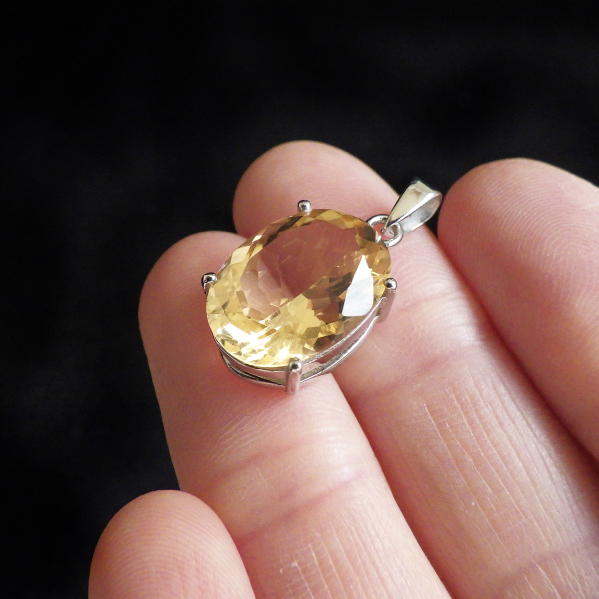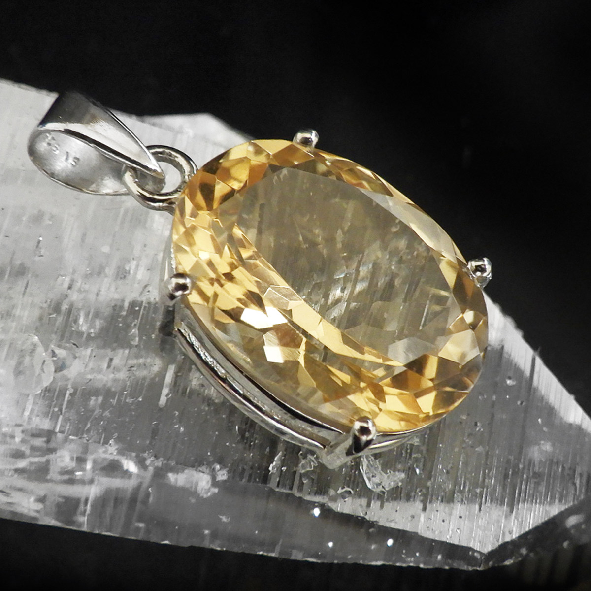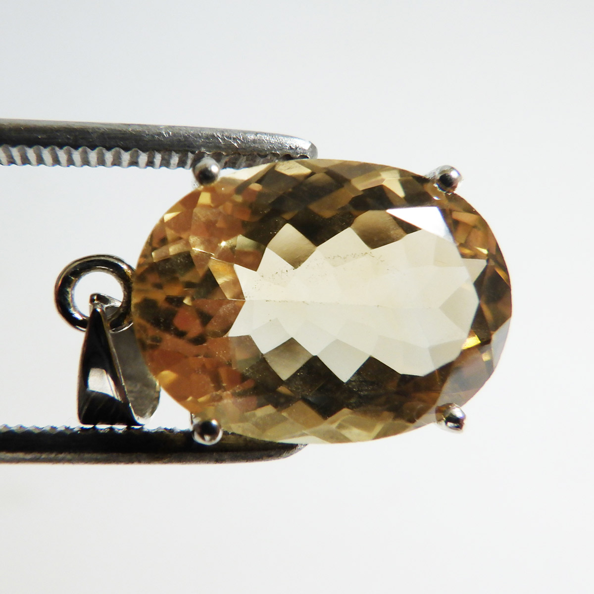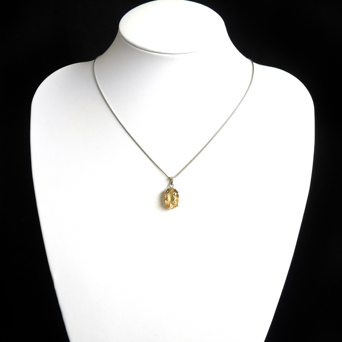 ブラジル産オーバルファセットカットのシトリンペンダントトップです。 宝石質で透明度が高く、発色も素晴らしく、自然な癒されるイエローの良質なシトリンです。オーバルファセットカットとは、楕円形の多面体カットのことで、シトリンの美しさを最大限に引き出しています。