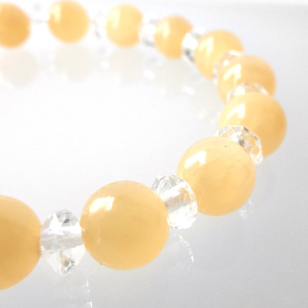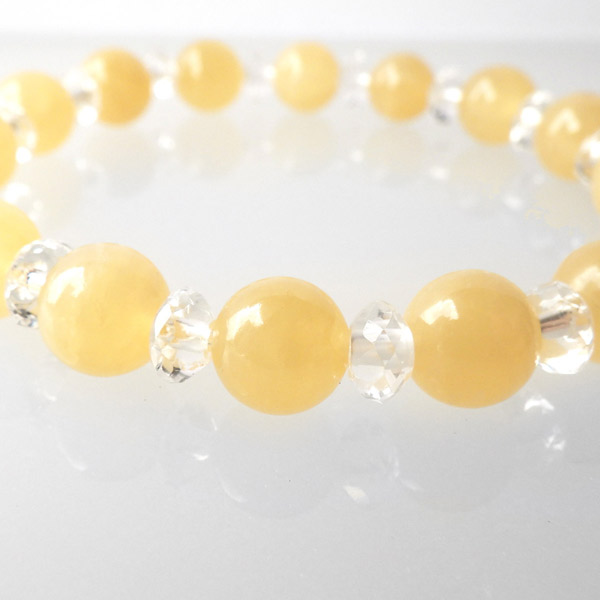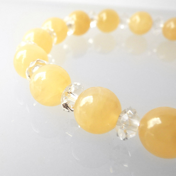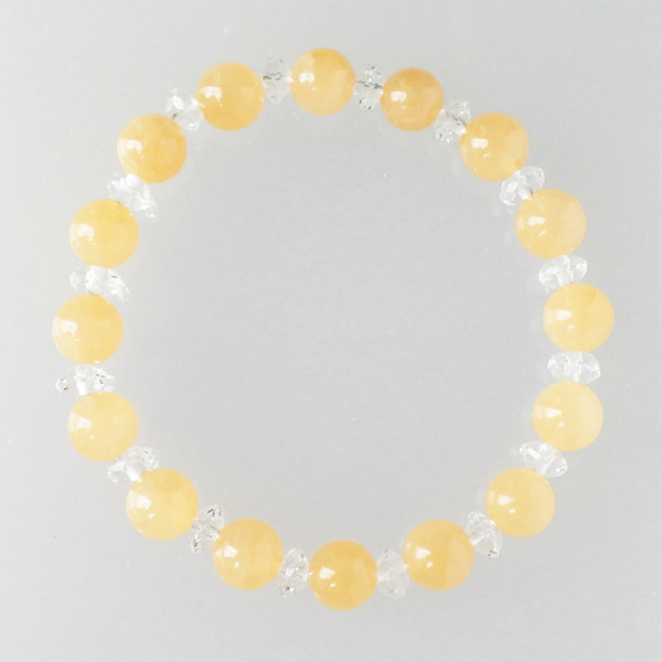 アラゴナイトの8mm玉と水晶のボタンカットを使用した天然石ブレスレットです。明るい暖かみのあるイエローは身に着けるだけで元気を与えてくれそうです。目を引くイエローカラーと結晶のなごりがある質感で、とてもかわいいブレスレットに仕上がっていますよ。