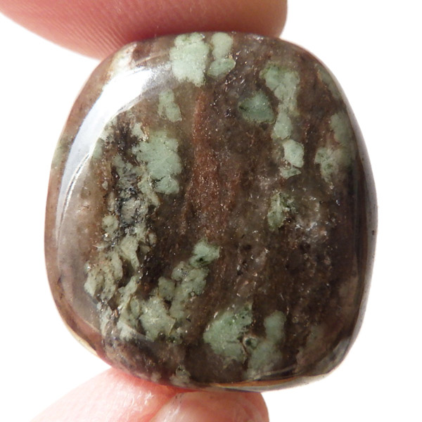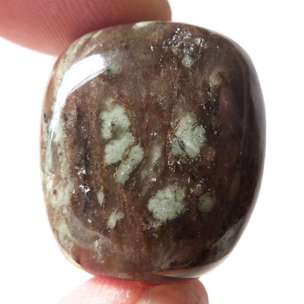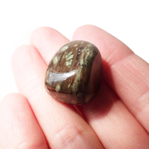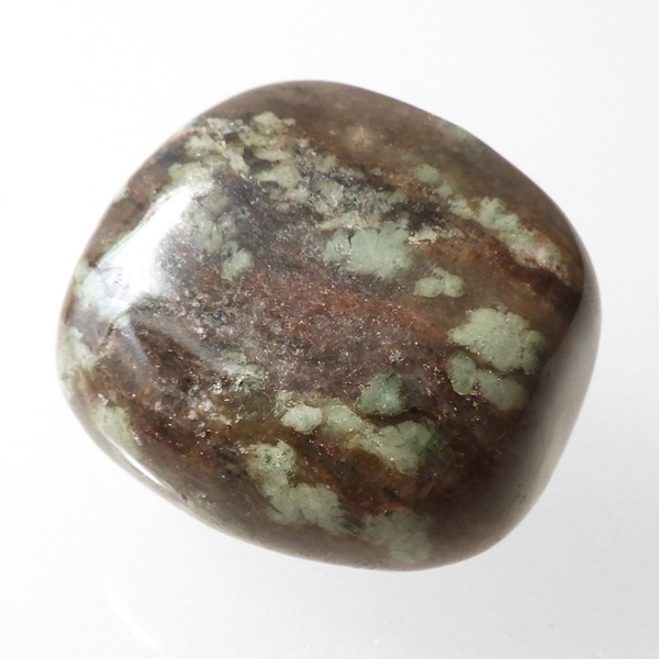 オーストラリア産のナンドライト、タンブルです。ナンドライトはオーストラリア・ニューサウスウェールズ州の小さな町ナンドルが産地である、希少であまり知られていない岩石です。ナンドライトという名前は、この産地に由来しています。ナンドライトの本質的な分類はエジリン閃長岩(エジリン・サイアナイト)にあたります。茶色やベージュ系のサイアナイト母岩の中に、深いグリーンのエジリンがドット状に散りばめられており、その独特な模様と色合いが非常に魅力的です。