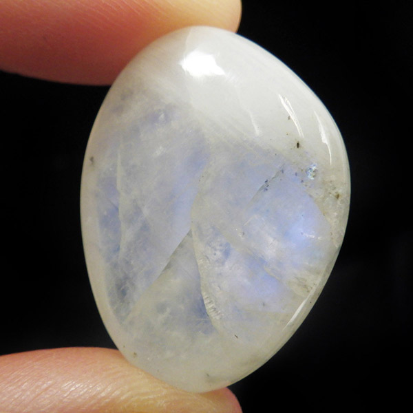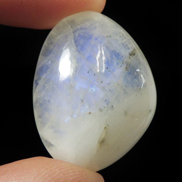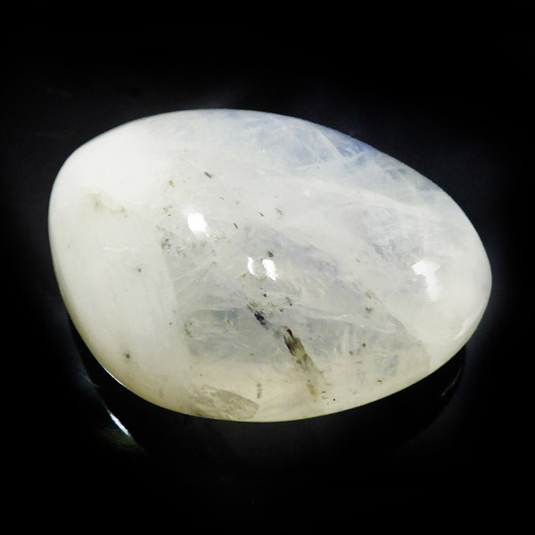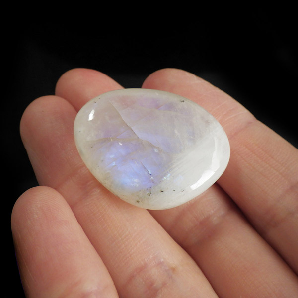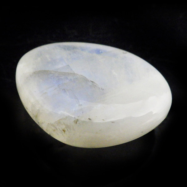インド産のムーンストーンです。ムーンストーンは長石(フェルドスパー)という鉱物グループの一種で、和名を月長石といいます。石の内部にある層が光を乱反射して出現する真珠のような柔らかい光の効果を「シラー効果」と呼び、ムーンストーンに見られる特徴です。その光の色は青白いものから、ピンク、オレンジ、白、グレーなど様々です。