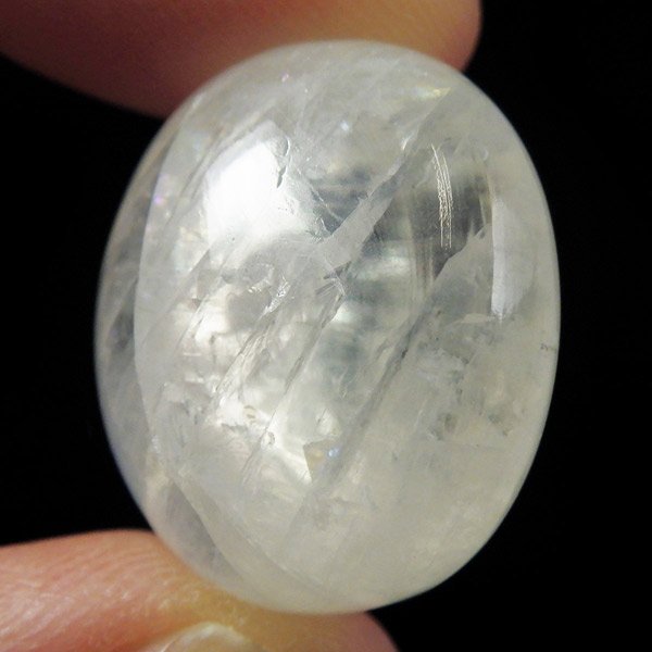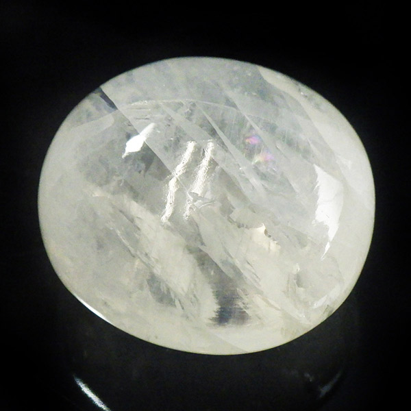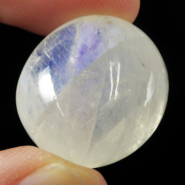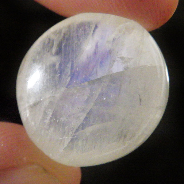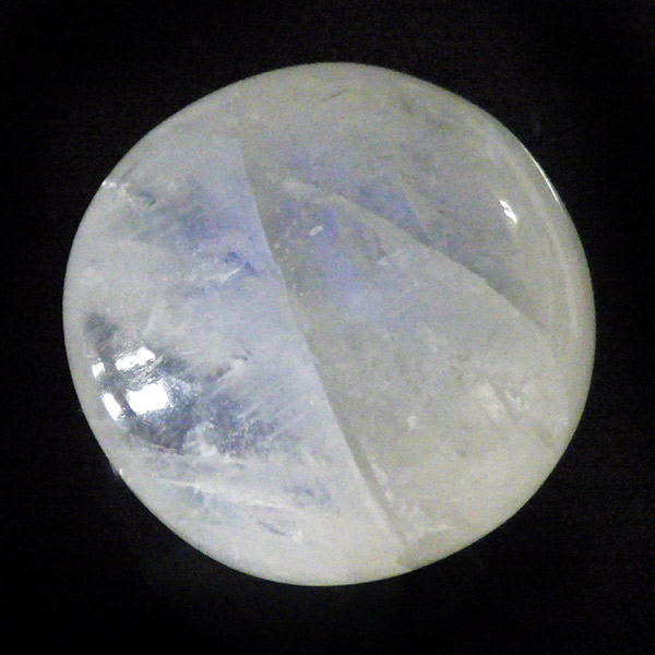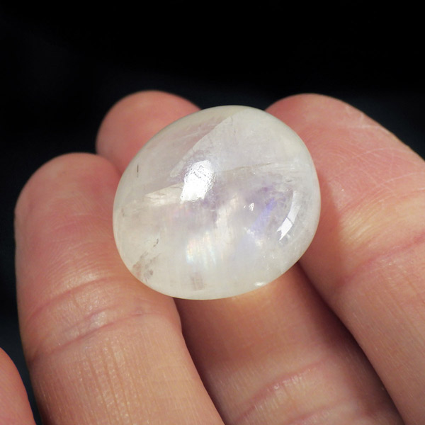 インド産のムーンストーンです。ムーンストーンは長石(フェルドスパー)という鉱物グループの一種で、和名を月長石といいます。石の内部にある層が光を乱反射して出現する真珠のような柔らかい光の効果を「シラー効果」と呼び、ムーンストーンに見られる特徴です。その光の色は青白いものから、ピンク、オレンジ、白、グレーなど様々です。