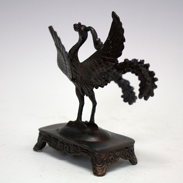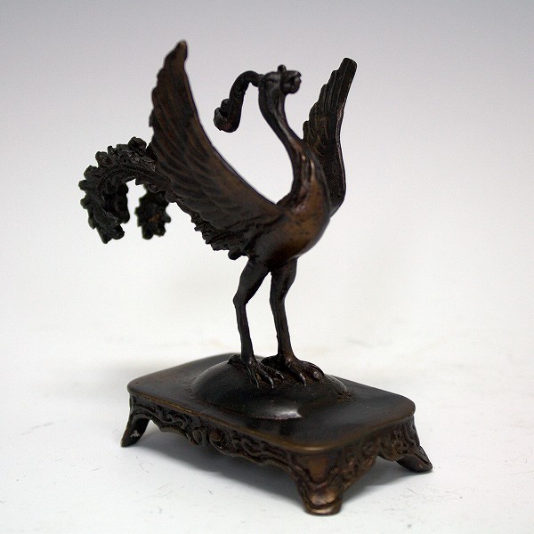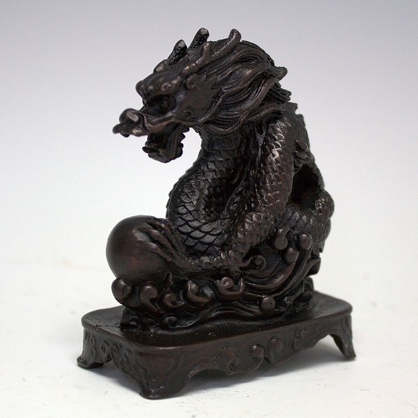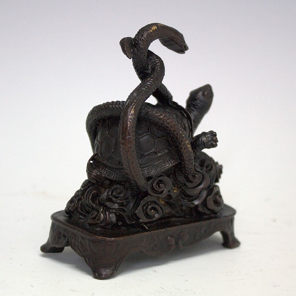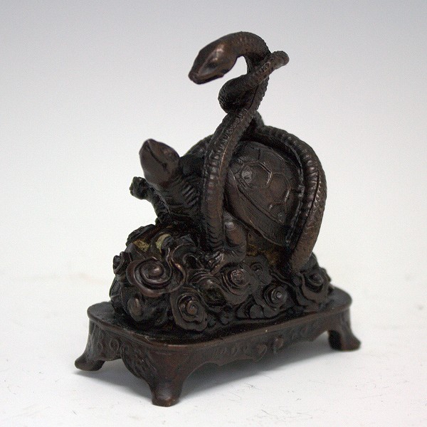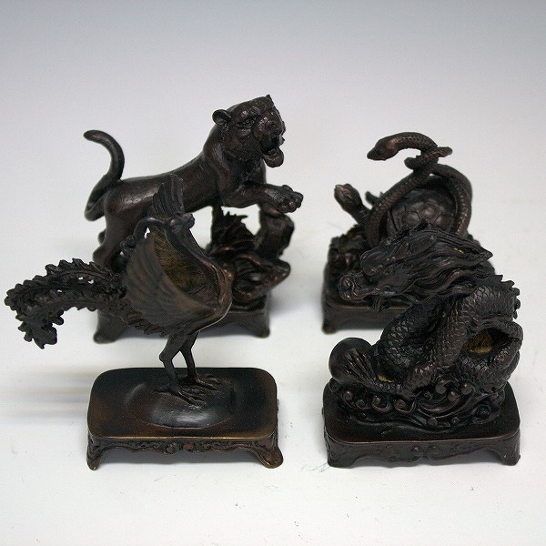 小さめの銅製の 四神の置物 です。四神(しじん)とは、四獣、四象、四霊とも呼ばれる方角を司る霊獣です。青龍(せいりゅう)は東、朱雀(すざく)は南、白虎(びゃっこ)は西、玄武(げんぶ)は北に位置し、中央には黄龍や麒麟が置かれます。