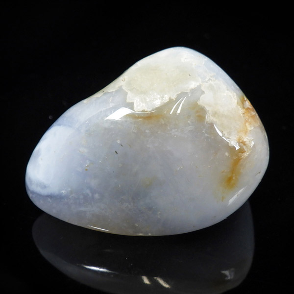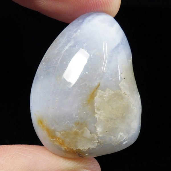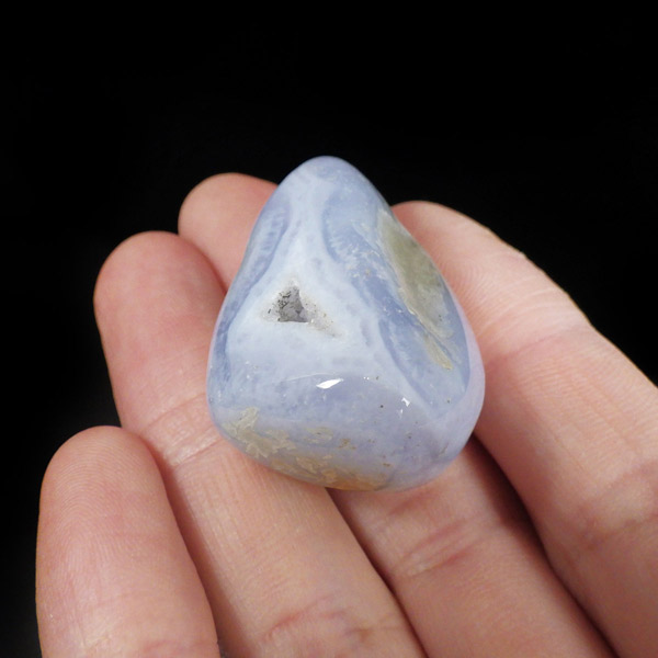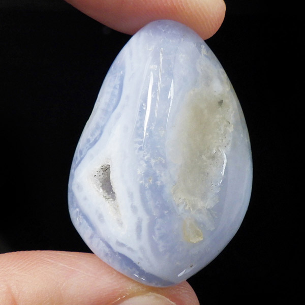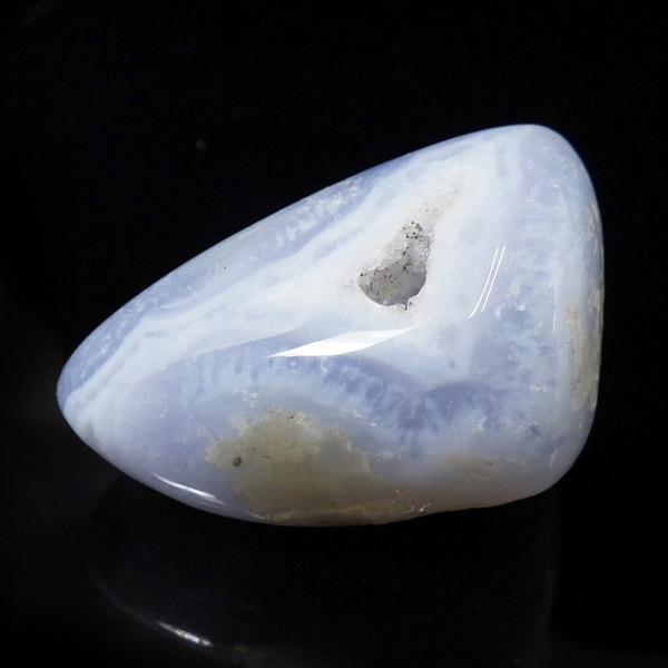 南アフリカ共和国産のブルーレースアゲート、磨き原石です。ブルーレースアゲートの和名は「空色縞瑪瑙」。淡い水色や白色が層状に重なって、まるでレースのように見えることからこの名が付けられました。近年、縞模様がはっきり見られるブルーレースアゲートの原石が激減しており、今では質の良いものは入手が困難になっています。ブルーレースアゲートの特徴である、美しい縞模様が入った品質の良い原石。ブルーの発色が良く、小さな晶洞がかわいくて癒されます。