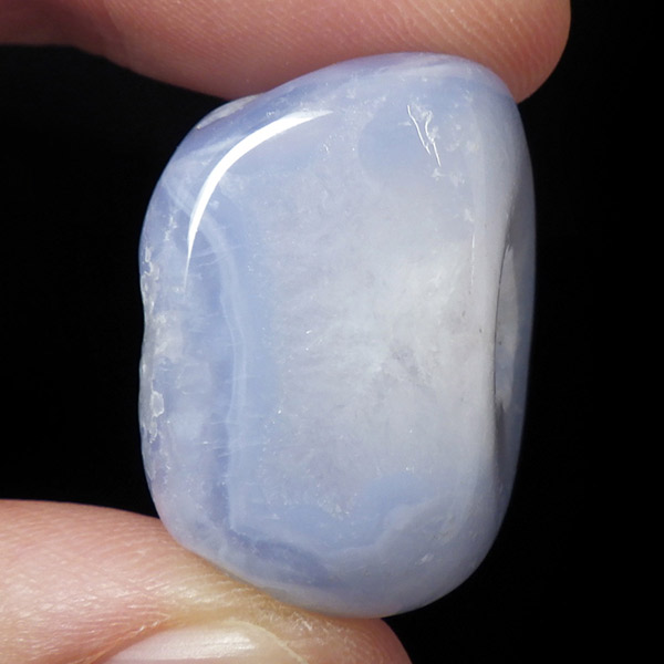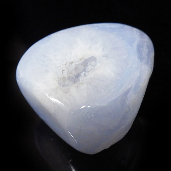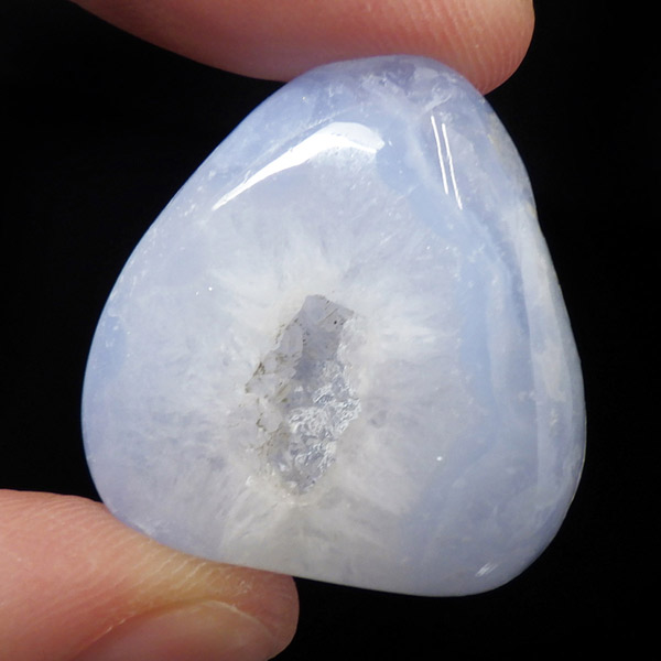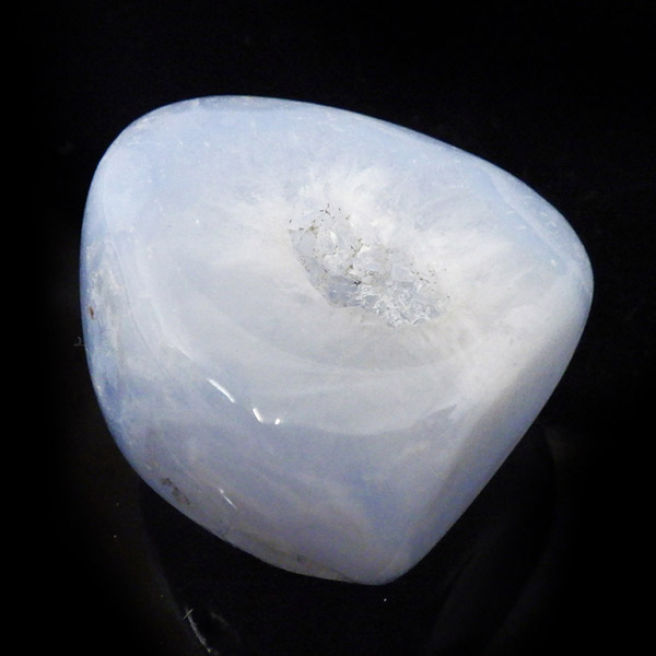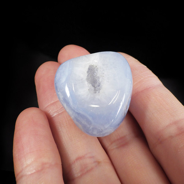 南アフリカ共和国産のブルーレースアゲート、磨き原石です。ブルーレースアゲートの和名は「空色縞瑪瑙」。淡い水色や白色が層状に重なって、まるでレースのように見えることからこの名が付けられました。近年、縞模様がはっきり見られるブルーレースアゲートの原石が激減しており、今では質の良いものは入手が困難になっています。ブルーレースアゲートの特徴である、美しい縞模様が入った品質の良い原石。ブルーの発色が良く、小さな晶洞がかわいくて癒されます。