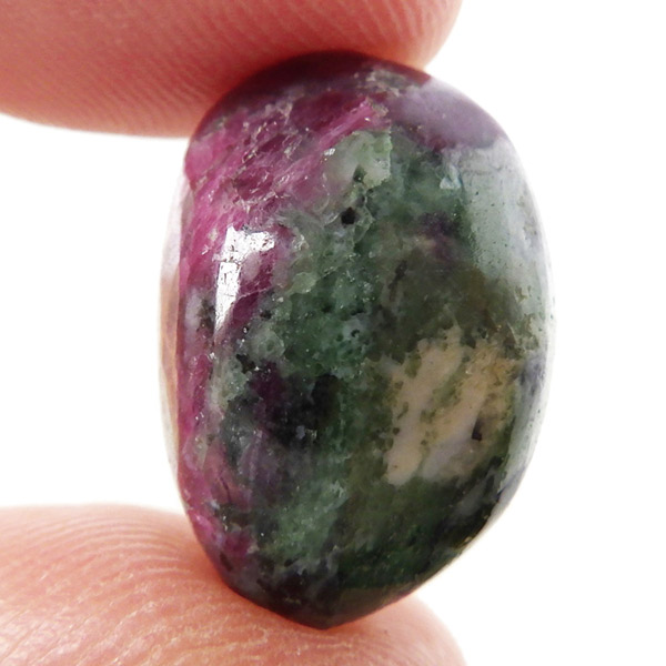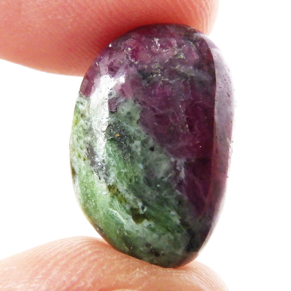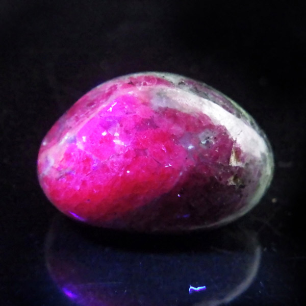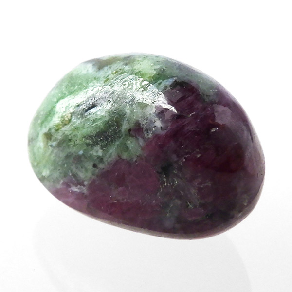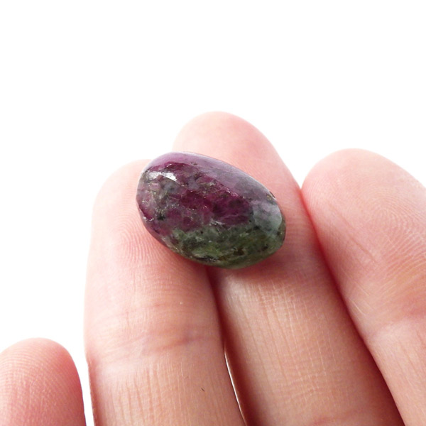 インド産ルビーインゾイサイトのタンブルです。濃緑色のゾイサイトの中に濃紅色のルビーが入っています。赤系の石、特にルビーはとても貴重な天然石です。ルビーインゾイサイトは別名アニョライトと呼ばれています。マサイ族の言葉で緑を意味するアニョリが由来とされています。ブラックライトを照射することでルビーレッドが鮮やかに蛍光します。
