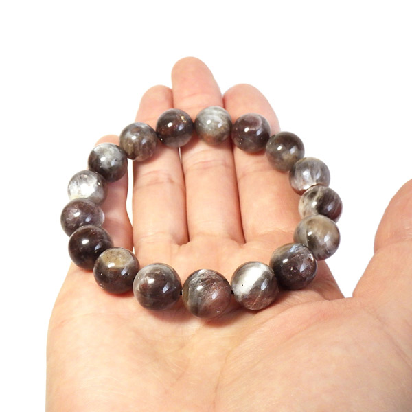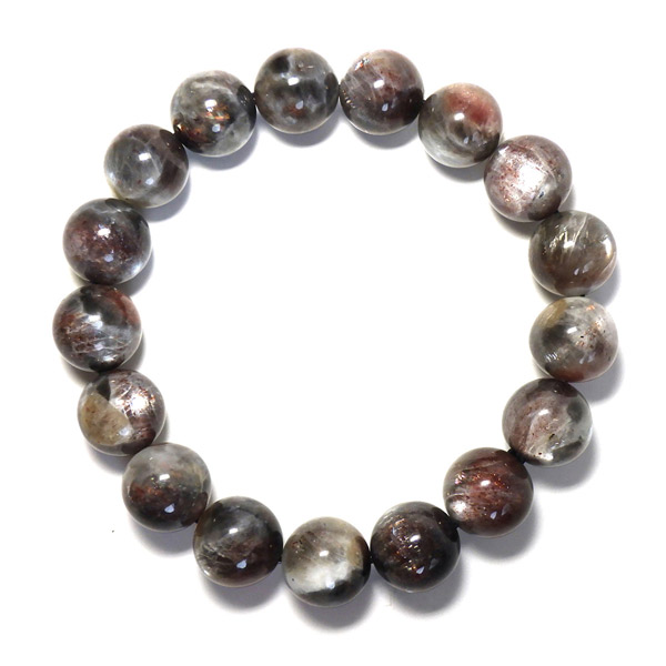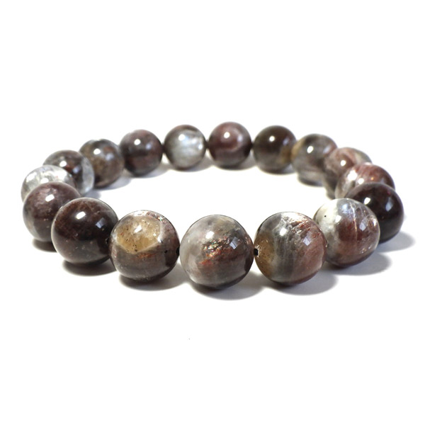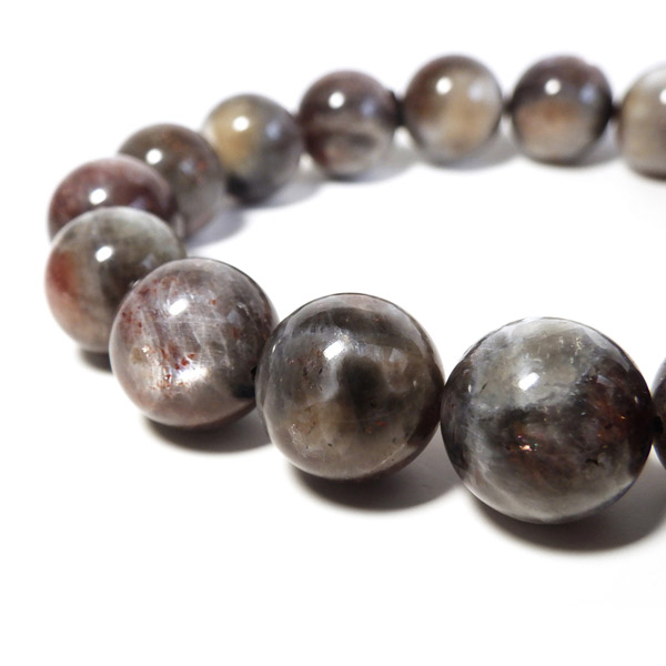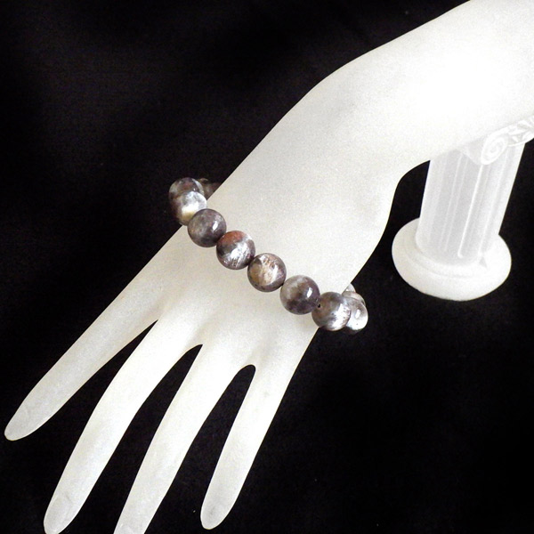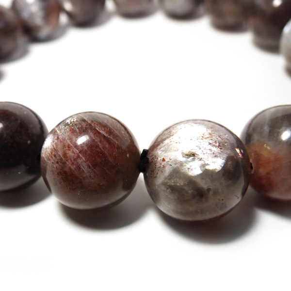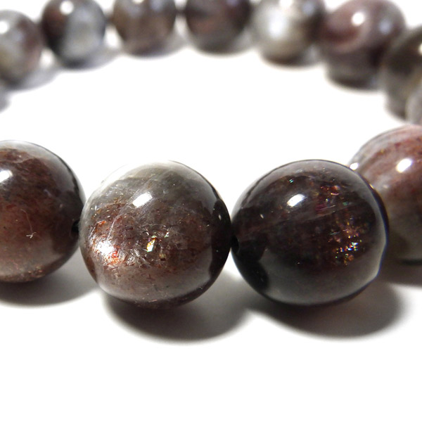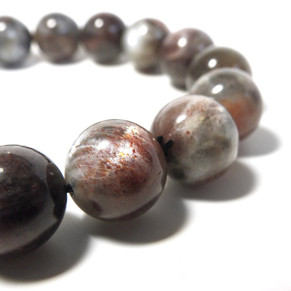 プラチナサンストーンを使用したブレスレットです。プラチナサンストーンという非常に珍しく、興味深いブレスレットが入荷しました。アイオライト、サンストーン、ムーンストーンが混ざったような見た目をしております。ムーンストーンのように青白く、プラチナのような輝きのシラー、ブラッドショットアイオライトのようなラメのような煌めき、サンストーンのような強い輝きを秘めております。ブルー、レッド、プラチナの配色もかっこ良いです。光学効果が非常に見られ、見れば見るほどおもしろいブレスレットになっております。確かな目で厳選しており、品質も大変良いものでおすすめです。