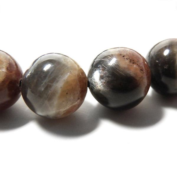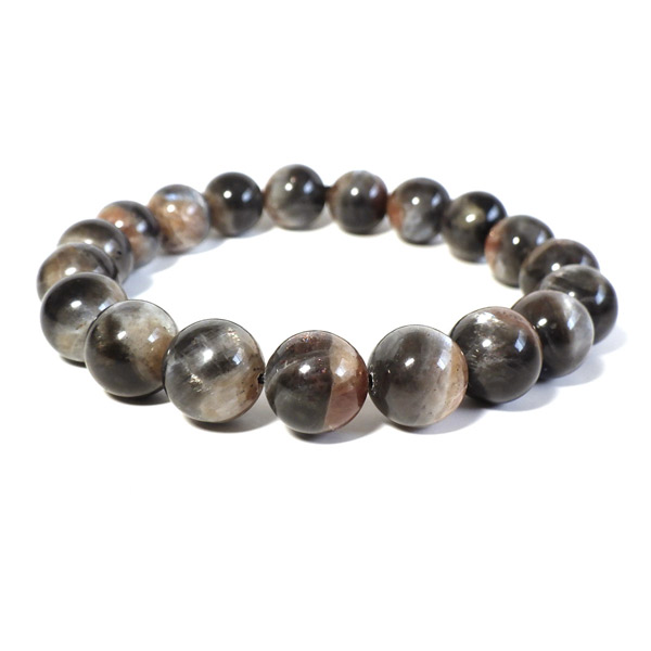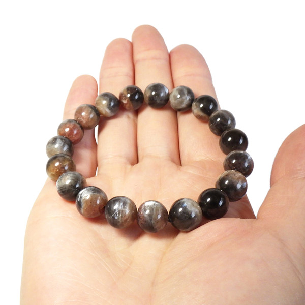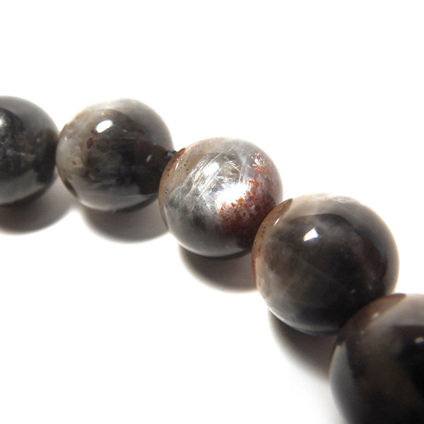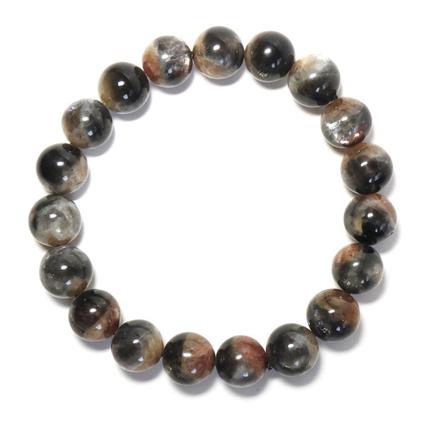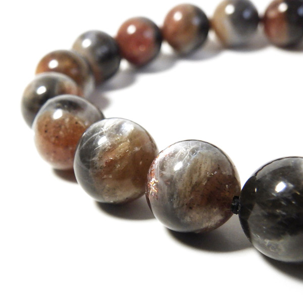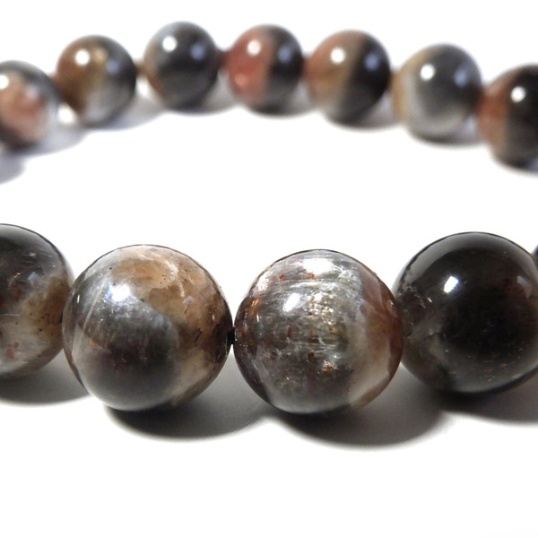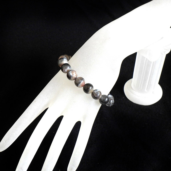 プラチナサンストーンを使用したブレスレットです。プラチナサンストーンという非常に珍しく、興味深いブレスレットが入荷しました。アイオライト、サンストーン、ムーンストーンが混ざったような見た目をしております。ムーンストーンのように青白く、プラチナのような輝きのシラー、ブラッドショットアイオライトのようなラメのような煌めき、サンストーンのような強い輝きを秘めております。ブルー、レッド、プラチナの配色もかっこ良いです。光学効果が非常に見られ、見れば見るほどおもしろいブレスレットになっております。確かな目で厳選しており、品質も大変良いものでおすすめです。