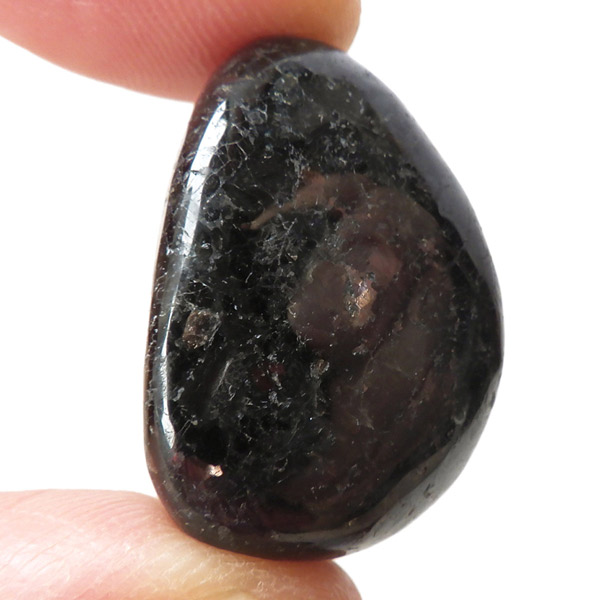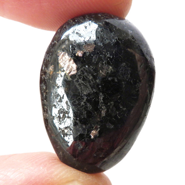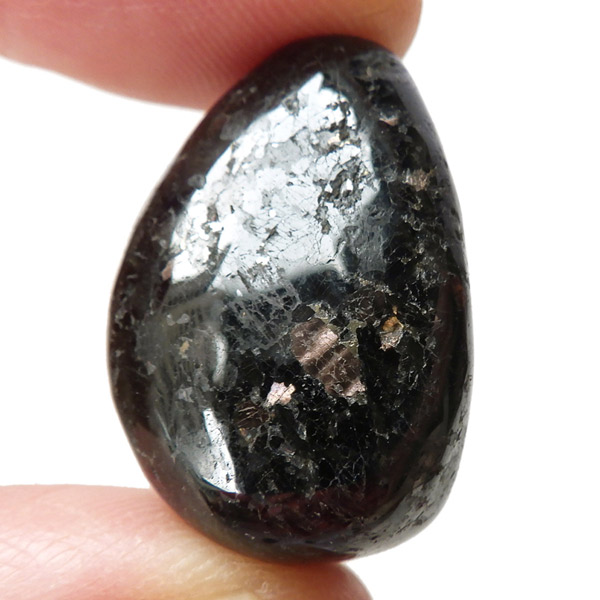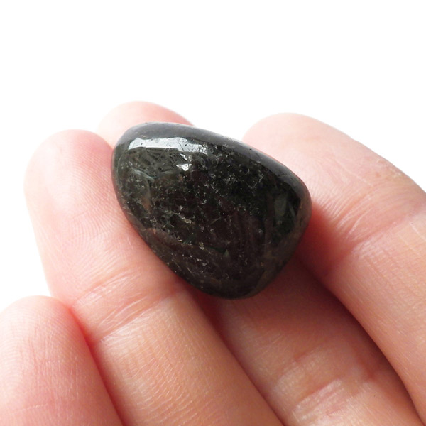 チャイナ産のヌーマイト、タンブルです。ヌーマイトは、1982年にグリーンランドのヌーク地方で発見され、地名に因んで名づけられました。ヌーマイト自体は30億年前から地球に存在したといわれる石で、気の遠くなるような年月を経て現代に現れた石だといわれています。和名は角閃石片麻岩。アンソフィライトやゲドライト、石英、など多様なミネラルを含んだ変成岩といわれています。チャイナ産のヌーマイトは一見、真っ黒い石に見えますが、光の角度によって鮮やかなブロンズやシルバーの閃光を示します。