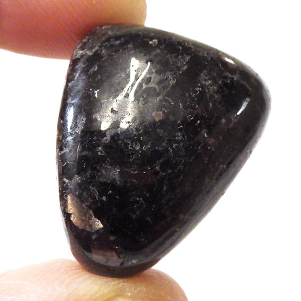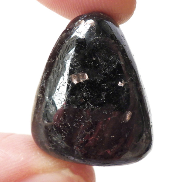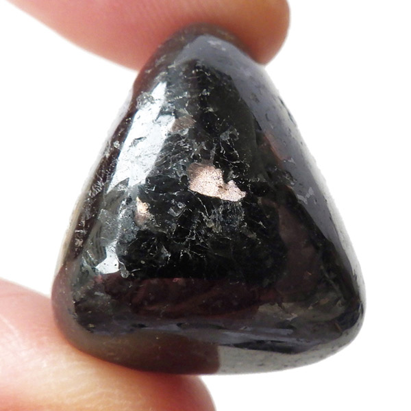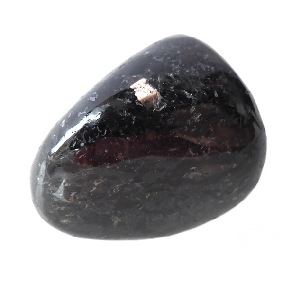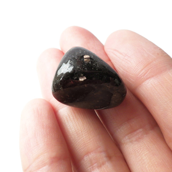 チャイナ産のヌーマイト、タンブルです。ヌーマイトは、1982年にグリーンランドのヌーク地方で発見され、地名に因んで名づけられました。ヌーマイト自体は30億年前から地球に存在したといわれる石で、気の遠くなるような年月を経て現代に現れた石だといわれています。和名は角閃石片麻岩。アンソフィライトやゲドライト、石英、など多様なミネラルを含んだ変成岩といわれています。チャイナ産のヌーマイトは一見、真っ黒い石に見えますが、光の角度によって鮮やかなブロンズやシルバーの閃光を示します。