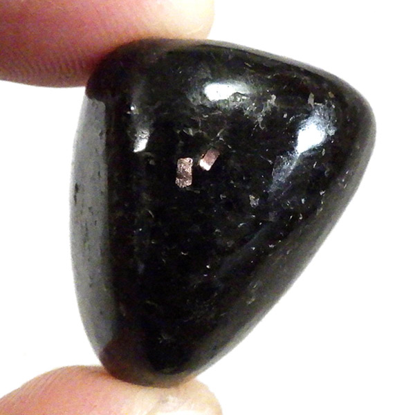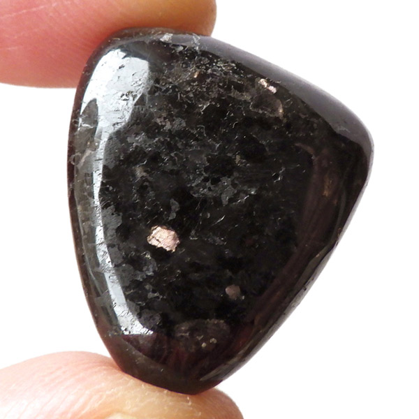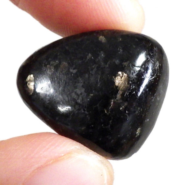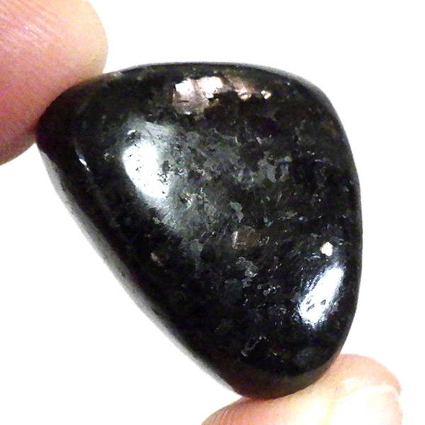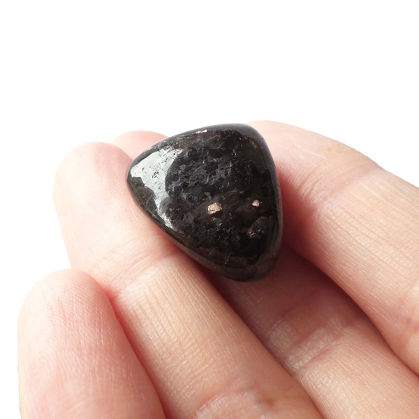 チャイナ産のヌーマイト、タンブルです。ヌーマイトは、1982年にグリーンランドのヌーク地方で発見され、地名に因んで名づけられました。ヌーマイト自体は30億年前から地球に存在したといわれる石で、気の遠くなるような年月を経て現代に現れた石だといわれています。和名は角閃石片麻岩。アンソフィライトやゲドライト、石英、など多様なミネラルを含んだ変成岩といわれています。チャイナ産のヌーマイトは一見、真っ黒い石に見えますが、光の角度によって鮮やかなブロンズやシルバーの閃光を示します。
