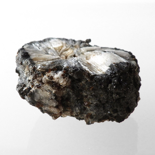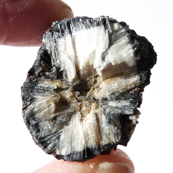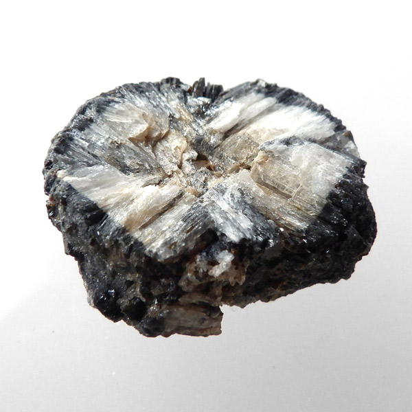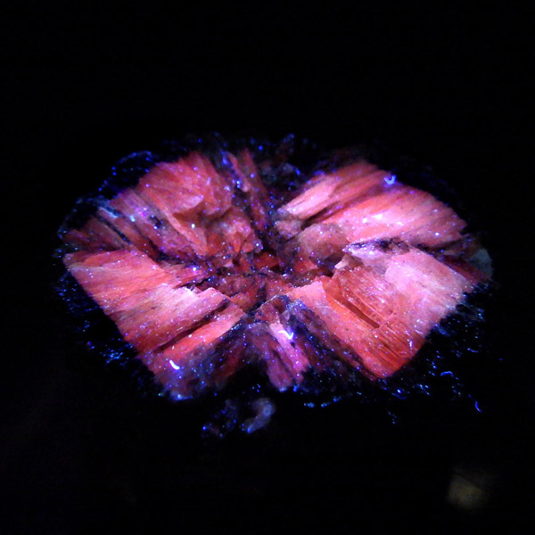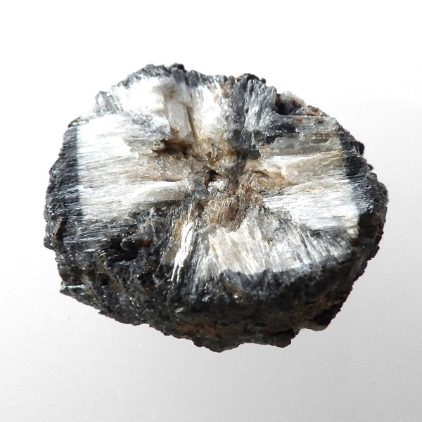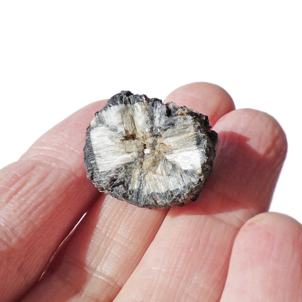 ロシア産、キャストライト原石です。キャストライトは黒の十字模様が大変魅力的な石です。キャストライトの名前は、輪切りにすると黒い十字の模様が現れることから、ギリシャ語で「対角線的な配列」という意味の「Chiastos」に由来しています。キャストライトは、黒鉛(グラファイト)などの黒色含有物を対称的に含んだ紅柱石です。クロスストーンとも呼ばれ、粘板岩と花こう岩の接触部に産出します。劈開がありますのできれいに輪切りができます。紅柱石部分は主に白色の集合で光沢があります。きれいな十字に結晶する様に鉱物の神秘を感じますね。365nmのUVライトで赤色の蛍光を確認しました。